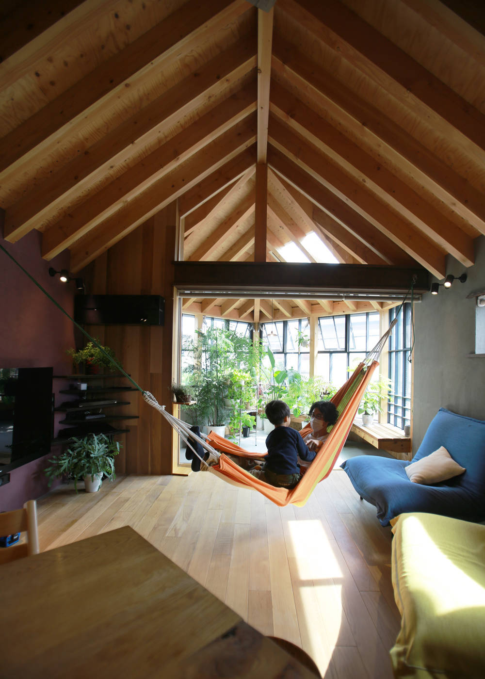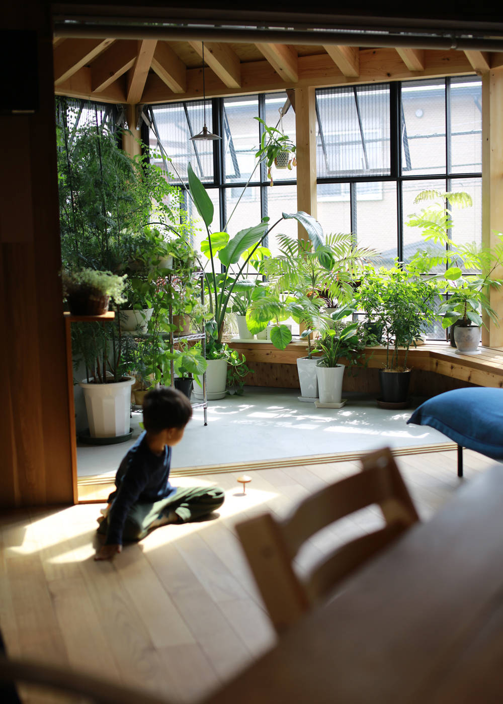 リビングの続きに植物を育てる温室のあるお家です。まるで外にいるようでステイホームも楽しい空間。