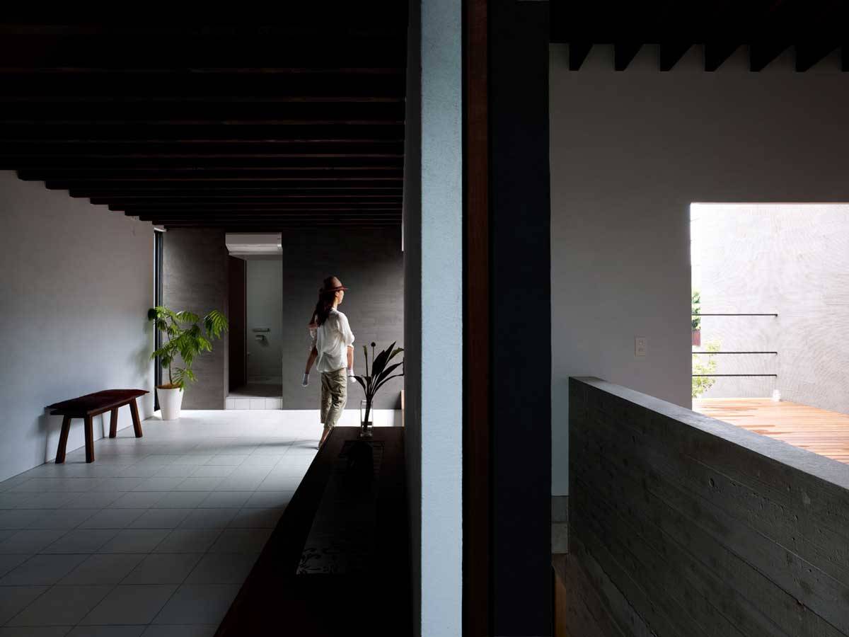 1階に子供達のアートスクールがありますので、1階は、少しだけパブリックな役割ですが、暮らしを守る家でもあります。そこで、1階は頑丈なコンクリート造にして、パブリックな存在でありながらも中の暮らしを守っているような構造としました。さらに、2階よりも小さな存在感とすることで、軒下のような外部をところどころに作っています。