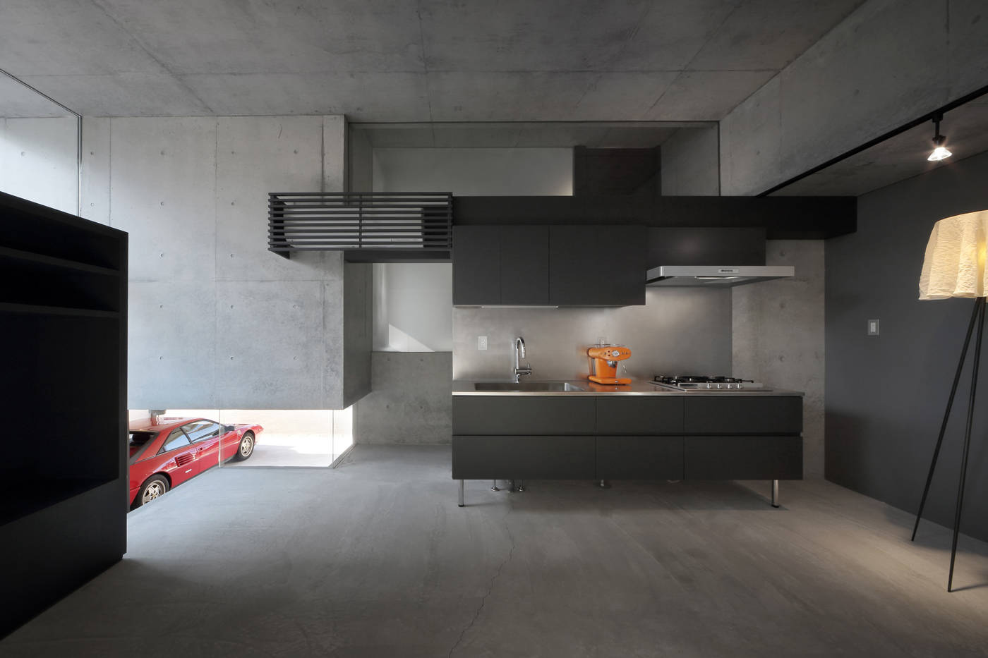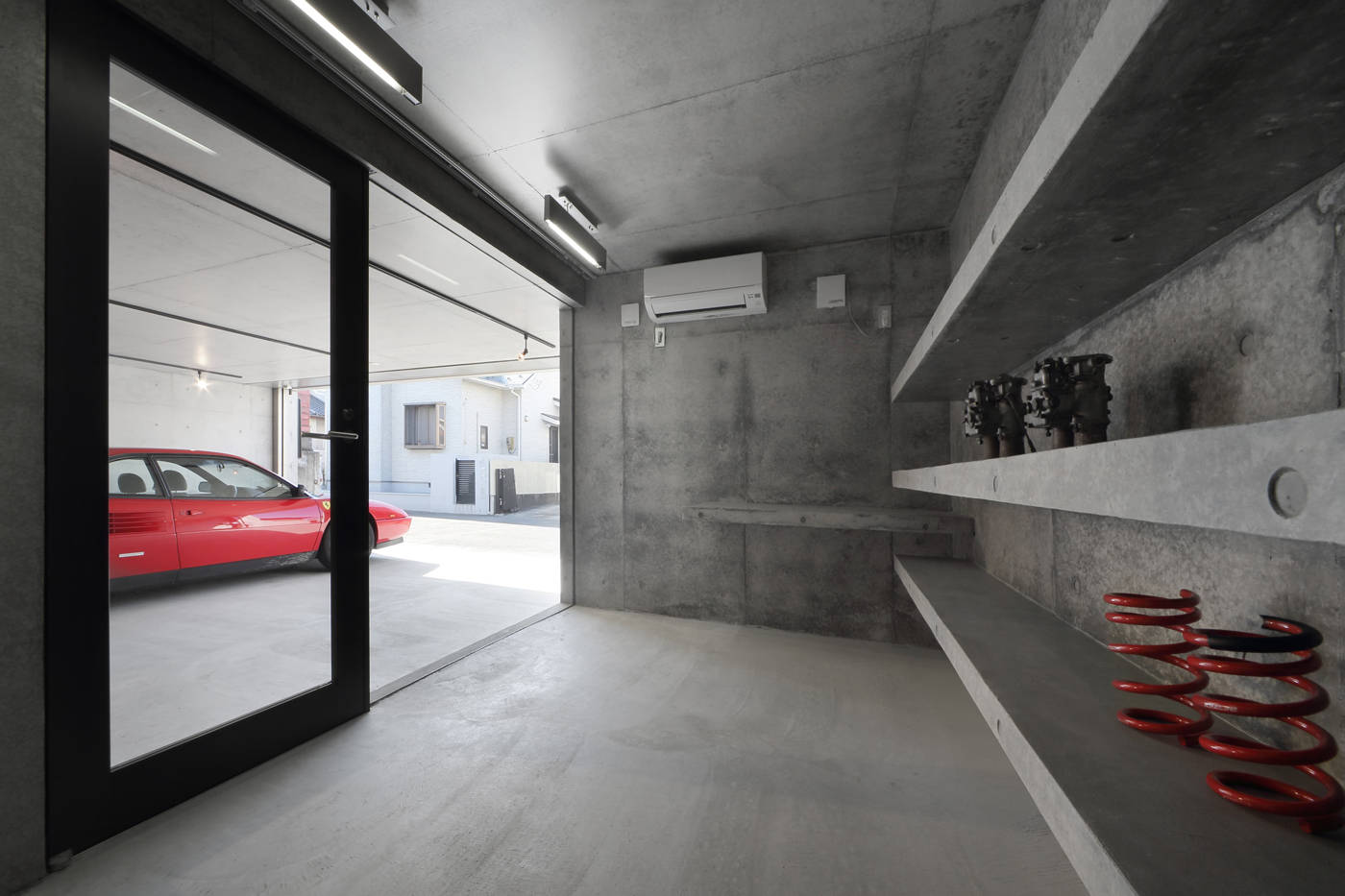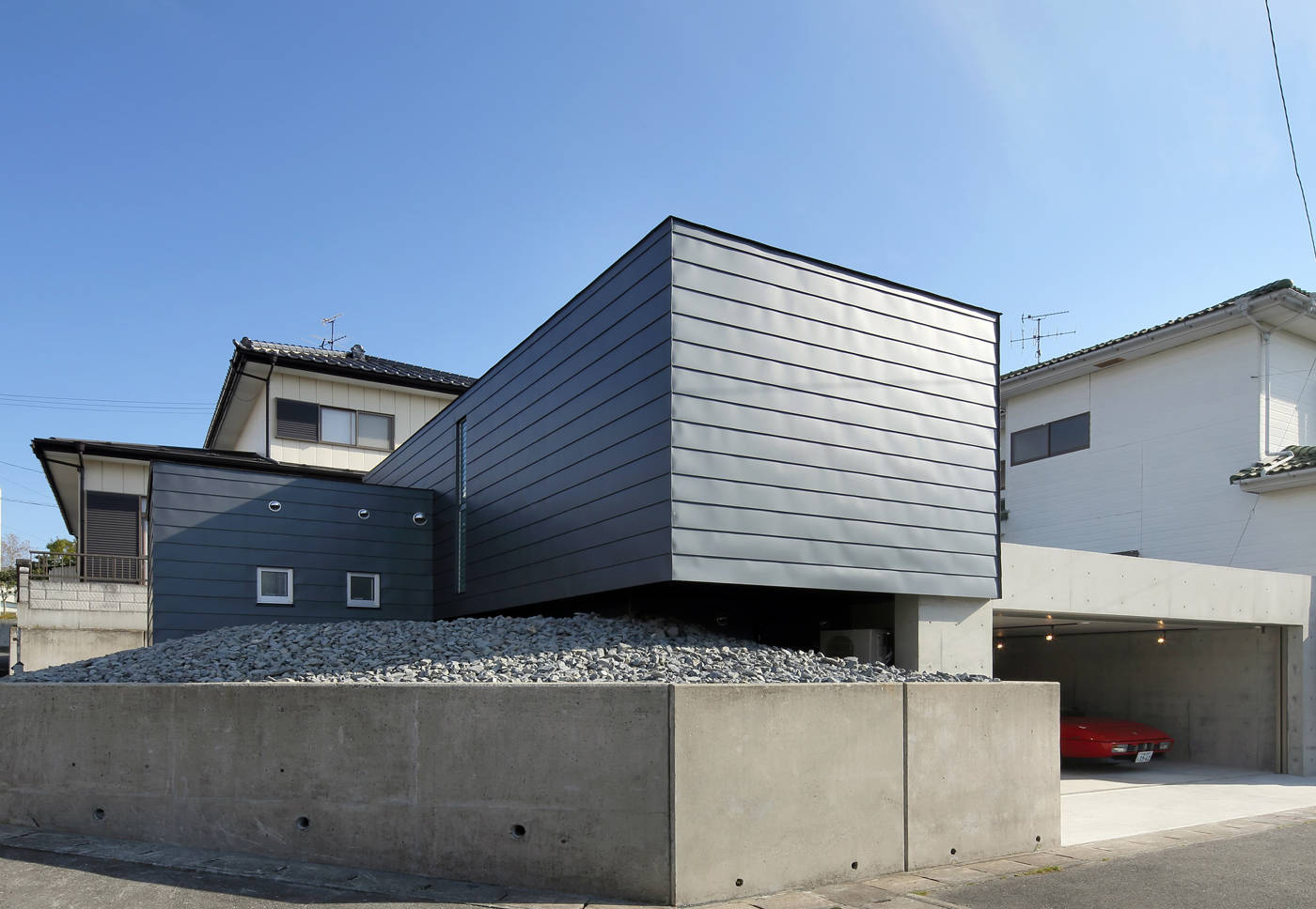 高台の造成地をくり抜きガレージを配したこの家は、冬の寒さが厳しい計画地でコンクリート打ち放しの家に住みたいという要望をかなえるために外断熱工法とし、モルタルの床にも温水式床暖房を備えている。