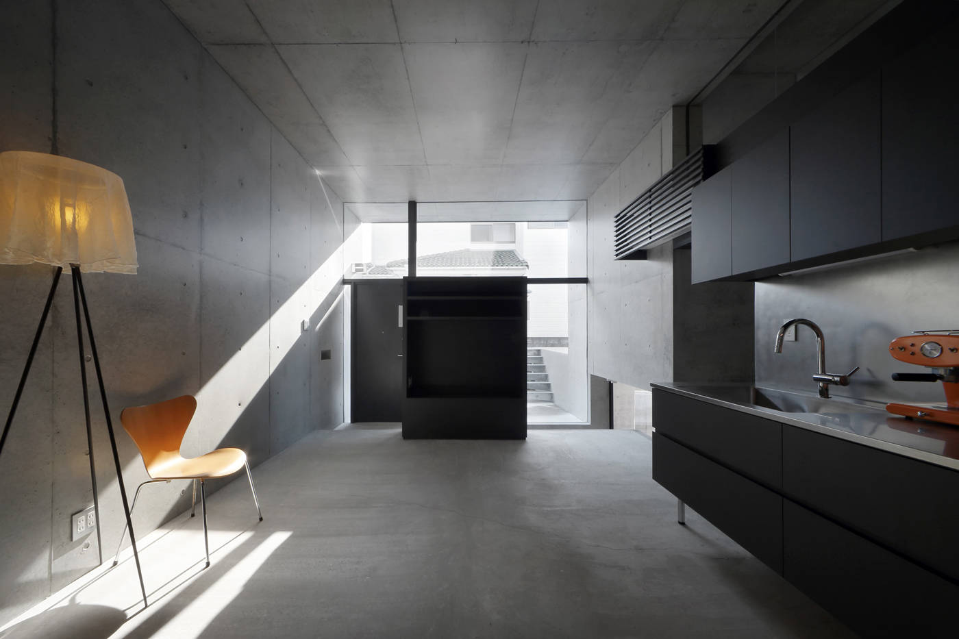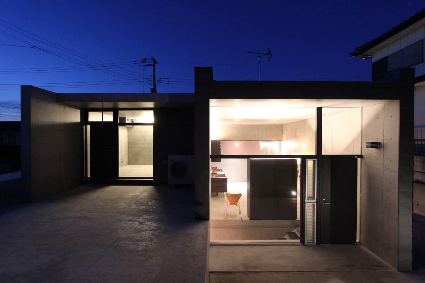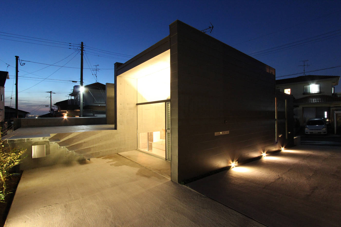 高台の造成地をくり抜きガレージを配したこの家は、冬の寒さが厳しい計画地でコンクリート打ち放しの家に住みたいという要望をかなえるために外断熱工法とし、モルタルの床にも温水式床暖房を備えている。