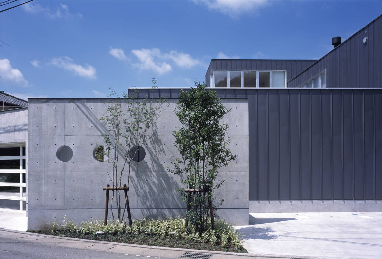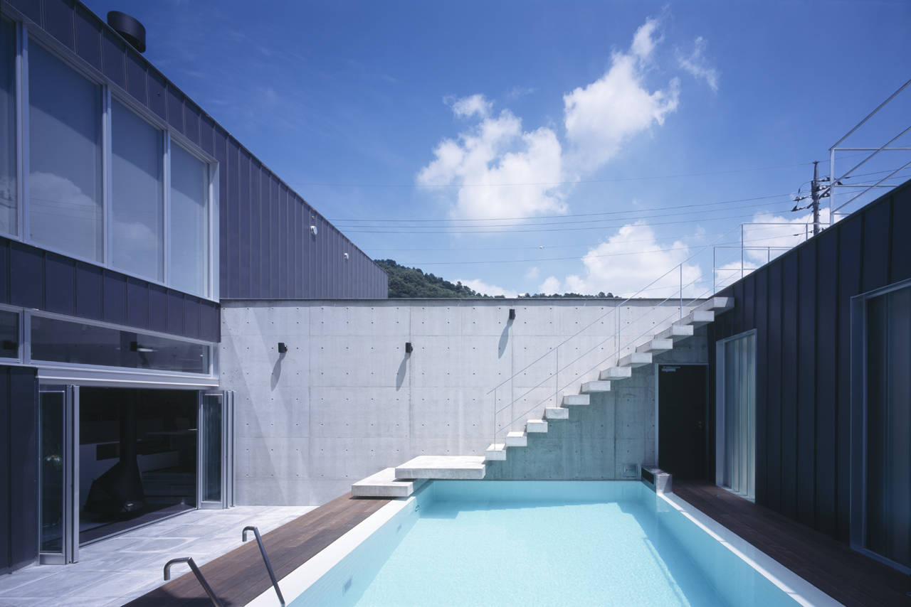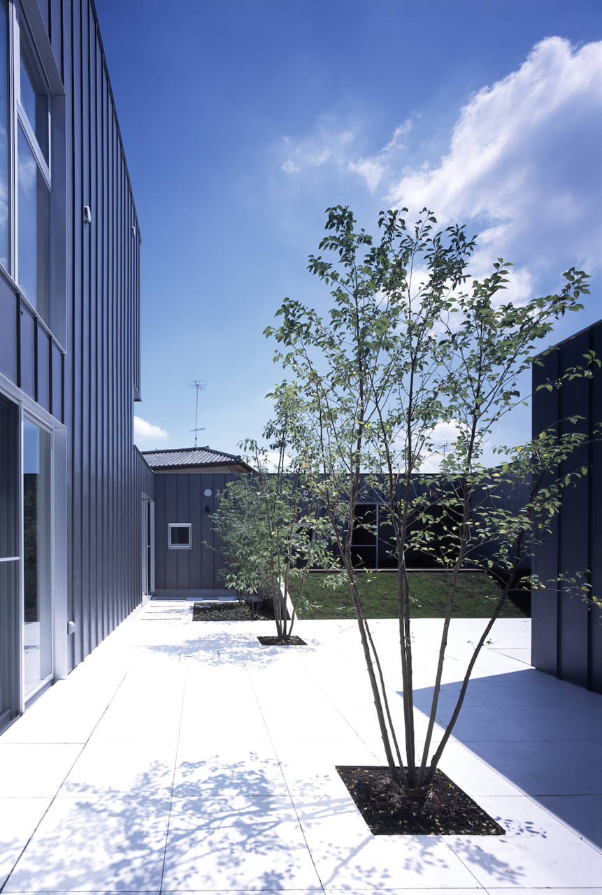 クライアントの要望は、広い敷地の有効活用と高いセキュリティと二世帯住宅を要望されました。敷地全体を利用し居住スペースの用途ごとの分節化を図ると共に、5つのコートを挿入し外部空間により各居住ゾーンを優しく分割しました。二世帯住宅でありながら家族それぞれの気配が感じられる構成としました。夏期はコートにあるプールがリビング空間を演出し、冬季には薪ストーブが団欒を与えてくれます。敷地周囲を建物と壁により囲む事で安心に暮らせる形態を具現化しました。
