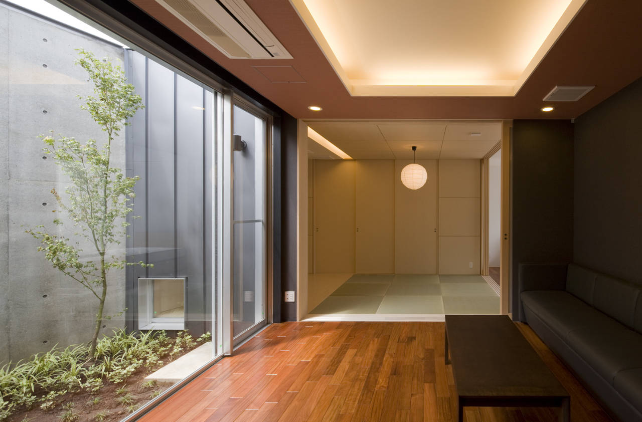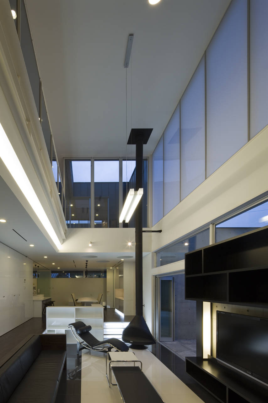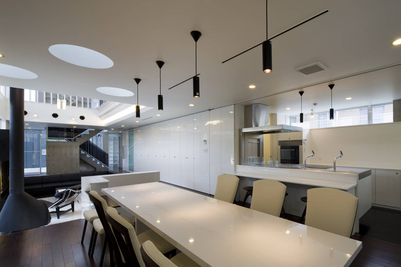 クライアントの要望は、広い敷地の有効活用と高いセキュリティと二世帯住宅を要望されました。敷地全体を利用し居住スペースの用途ごとの分節化を図ると共に、5つのコートを挿入し外部空間により各居住ゾーンを優しく分割しました。二世帯住宅でありながら家族それぞれの気配が感じられる構成としました。夏期はコートにあるプールがリビング空間を演出し、冬季には薪ストーブが団欒を与えてくれます。敷地周囲を建物と壁により囲む事で安心に暮らせる形態を具現化しました。