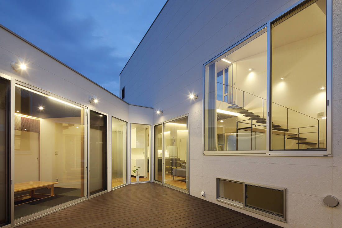 内部空間の開放性を高めるために、海側には奥行きのあるバルコニー、陸側には中庭空間を配置し、リビングの両サイドが外部スペースとなる。