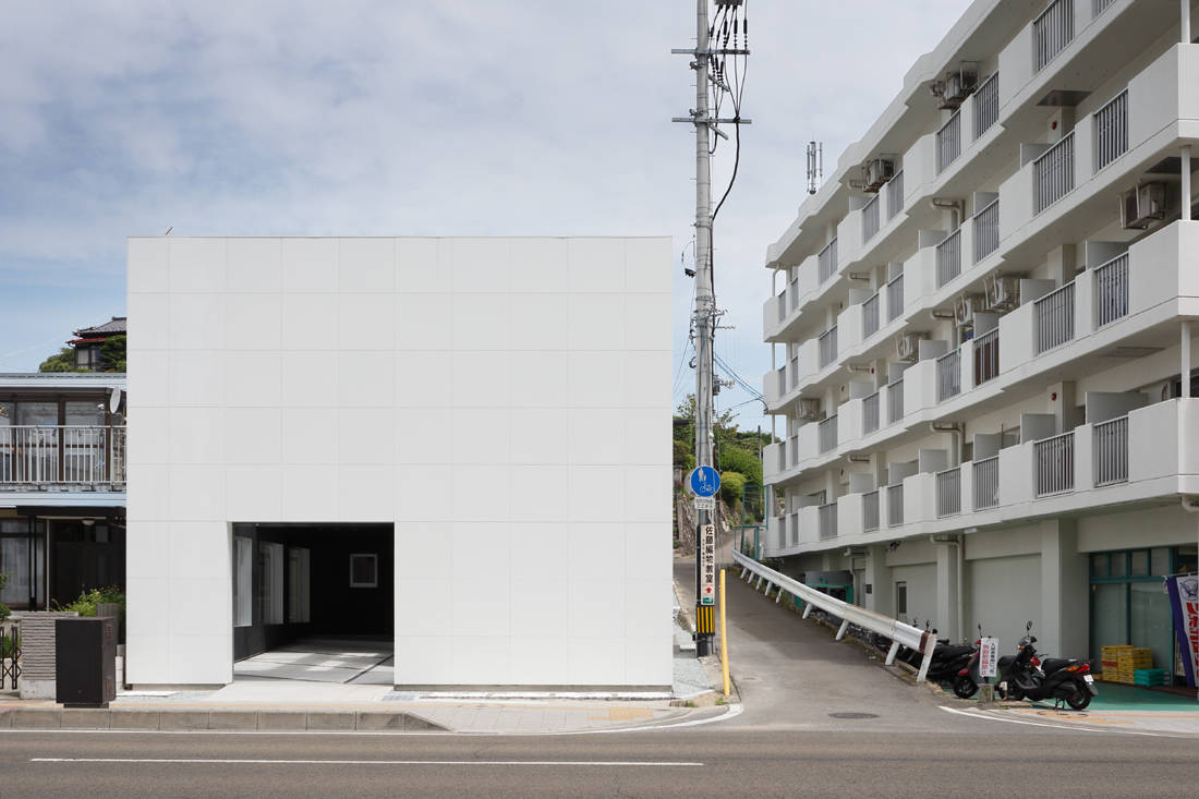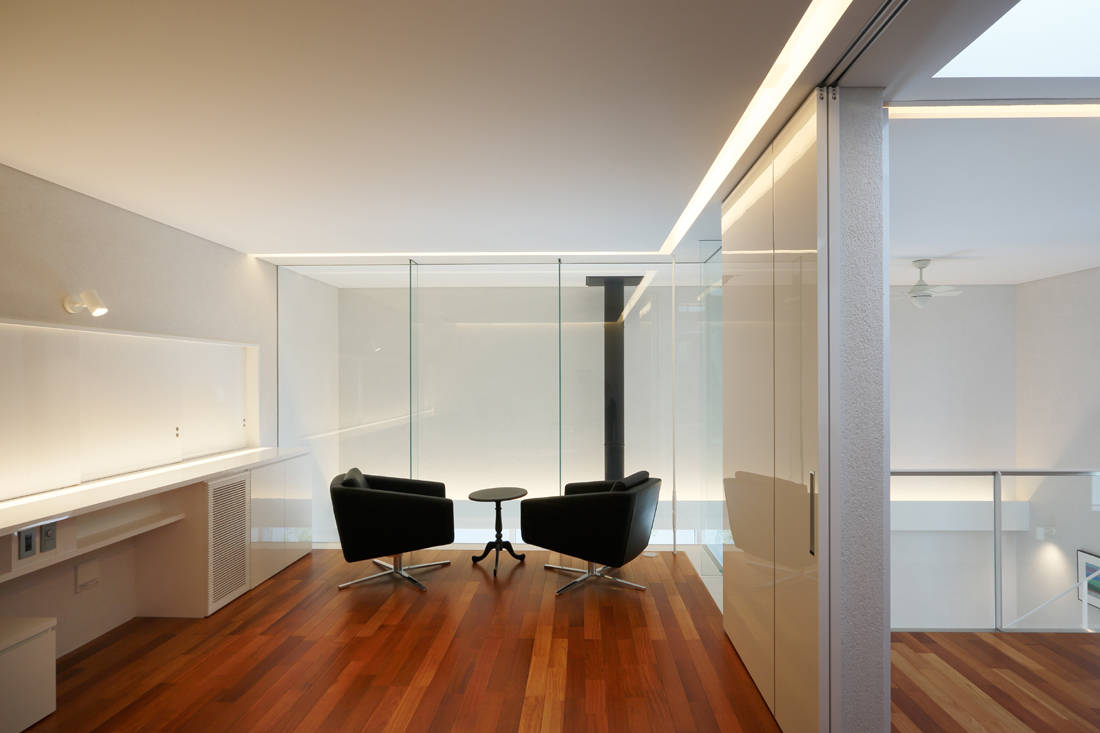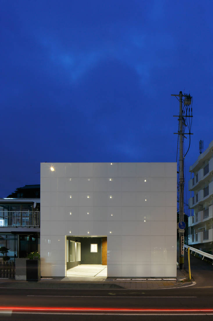 結晶化ガラス壁装材を使用し木造建築と感じられない形態がクライアントの要望です。