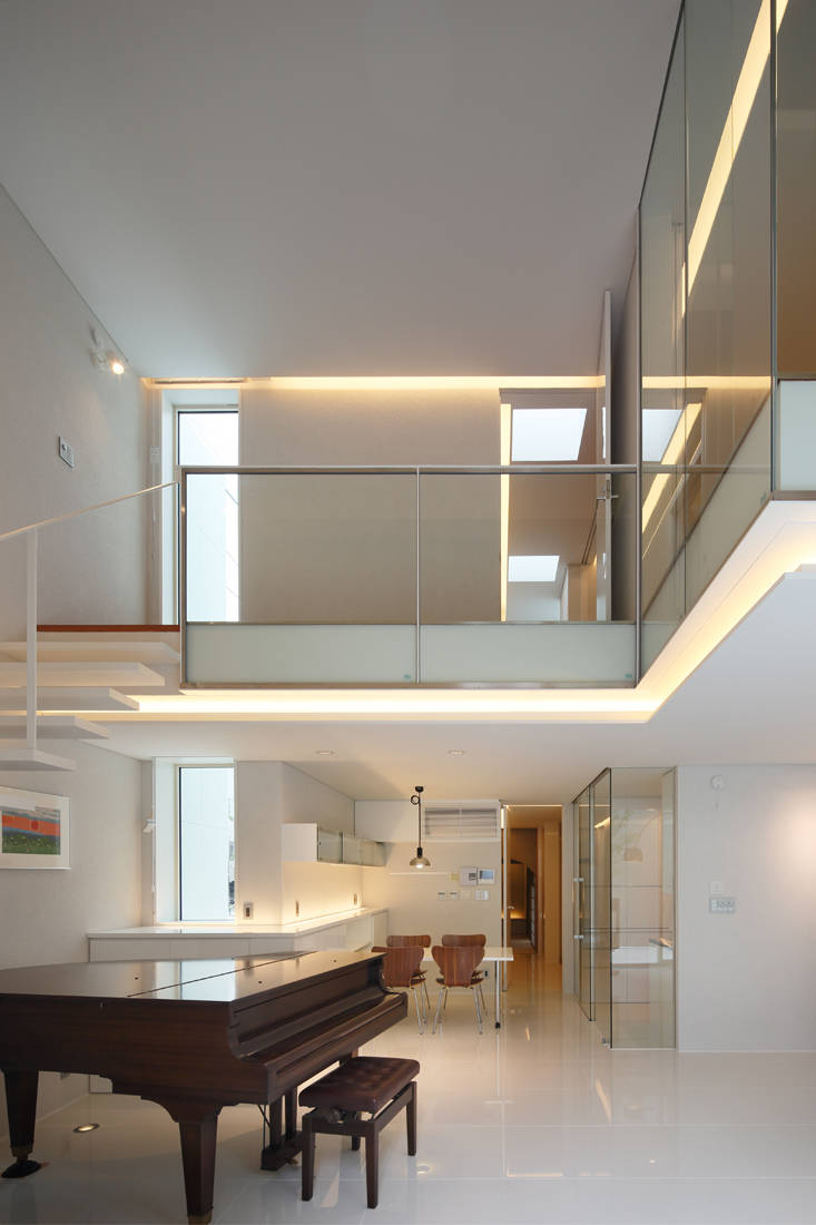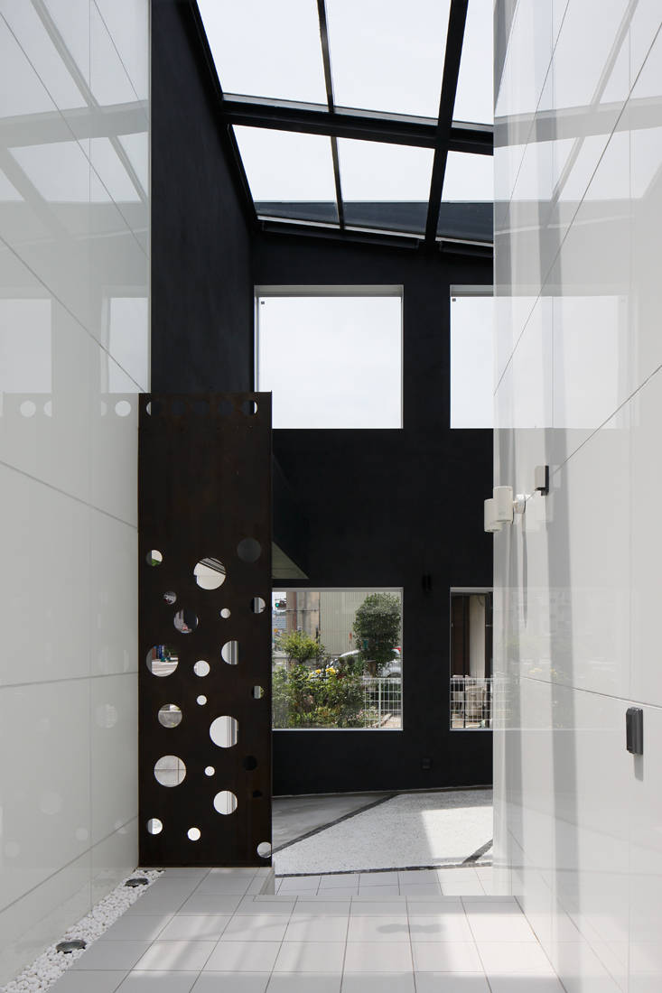 国道側の厚い壁と中間領域は音と視線をコントロールするためのフィルターであり、ガラスルーフ付きのガレージがアプローチ空間に魅力を与えます。