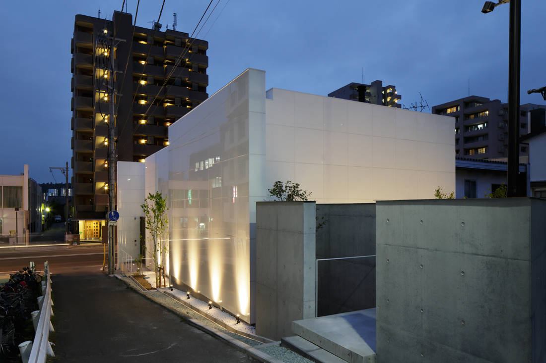 結晶化ガラス壁装材の外壁材には周辺環境を映し出し照明と協奏した透過するファサードとしました。