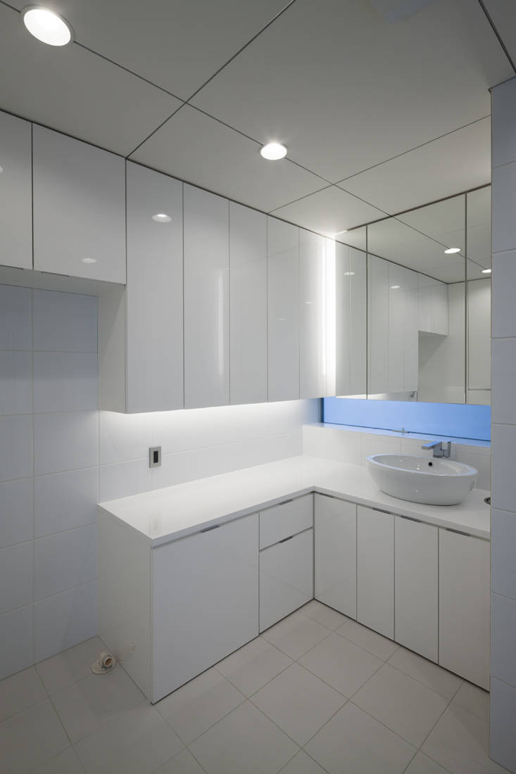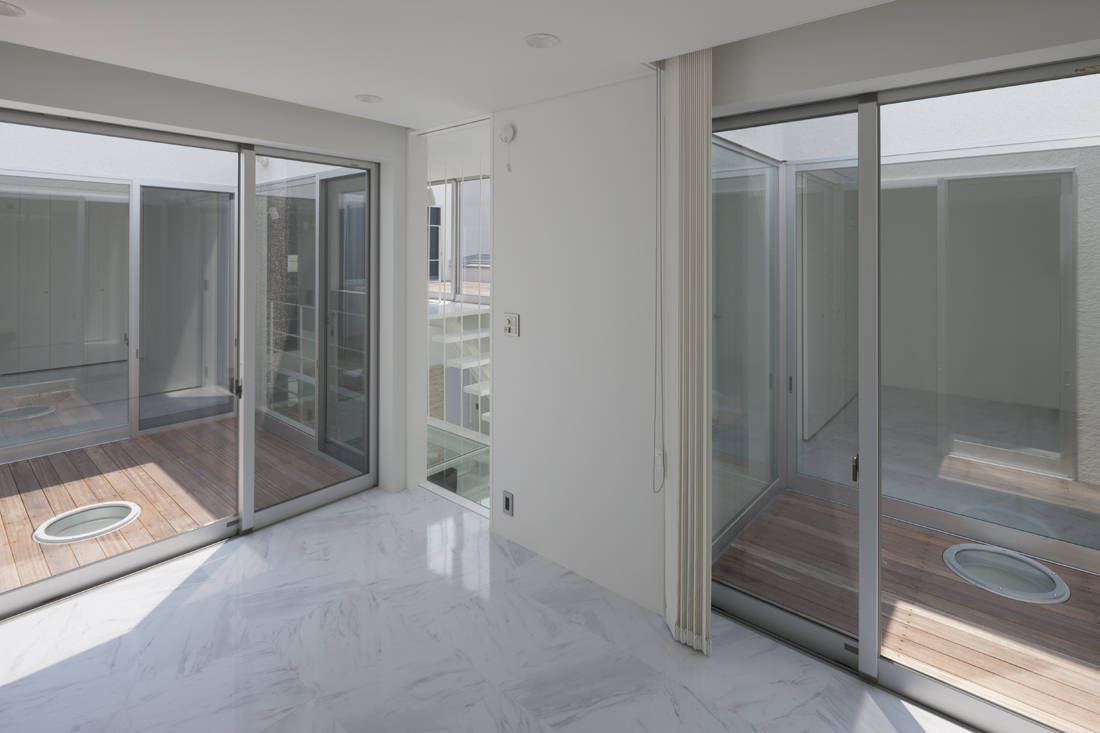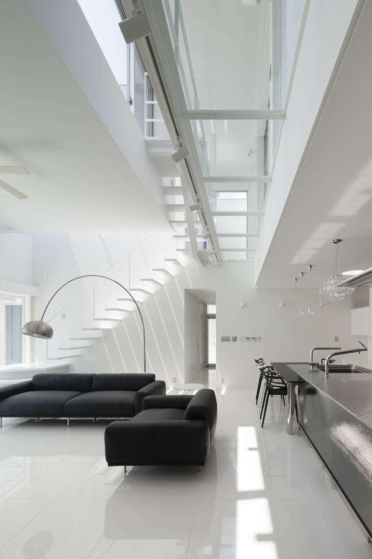 このスラブのズレが各室との連携を高め、家族の気配の感じられる構成となり、ガラスのブリッジと共にライフスタイルを表出しています。