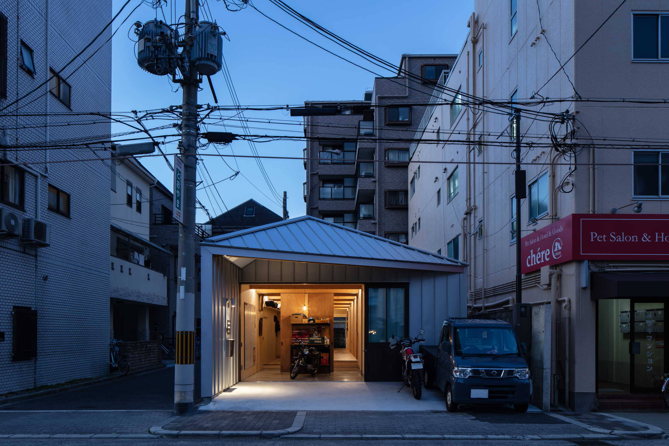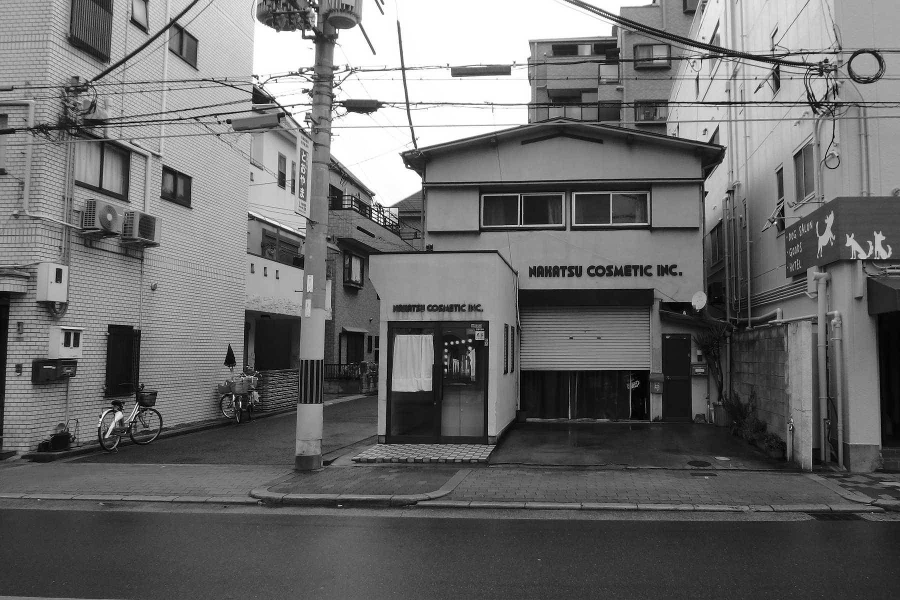 大阪市内の下町。マンション再開発が進み、ビルの谷間になった住宅+事務所+倉庫の建て替え計画です。クライアントは長年この地で化粧品関連会社を営むご夫婦とお母様。古い木造家屋を必要に応じてつぎはぎし、内のような外のような不思議な場所をうまく活用しながら、職住が混然一体となった暮らしをされていました。リノベーションも検討しましたが既存建物の状態が悪く、終の棲家として安心して住める性能を確保するためには大規模な工事とならざるを得ないことから、解体して新築することとなりました。