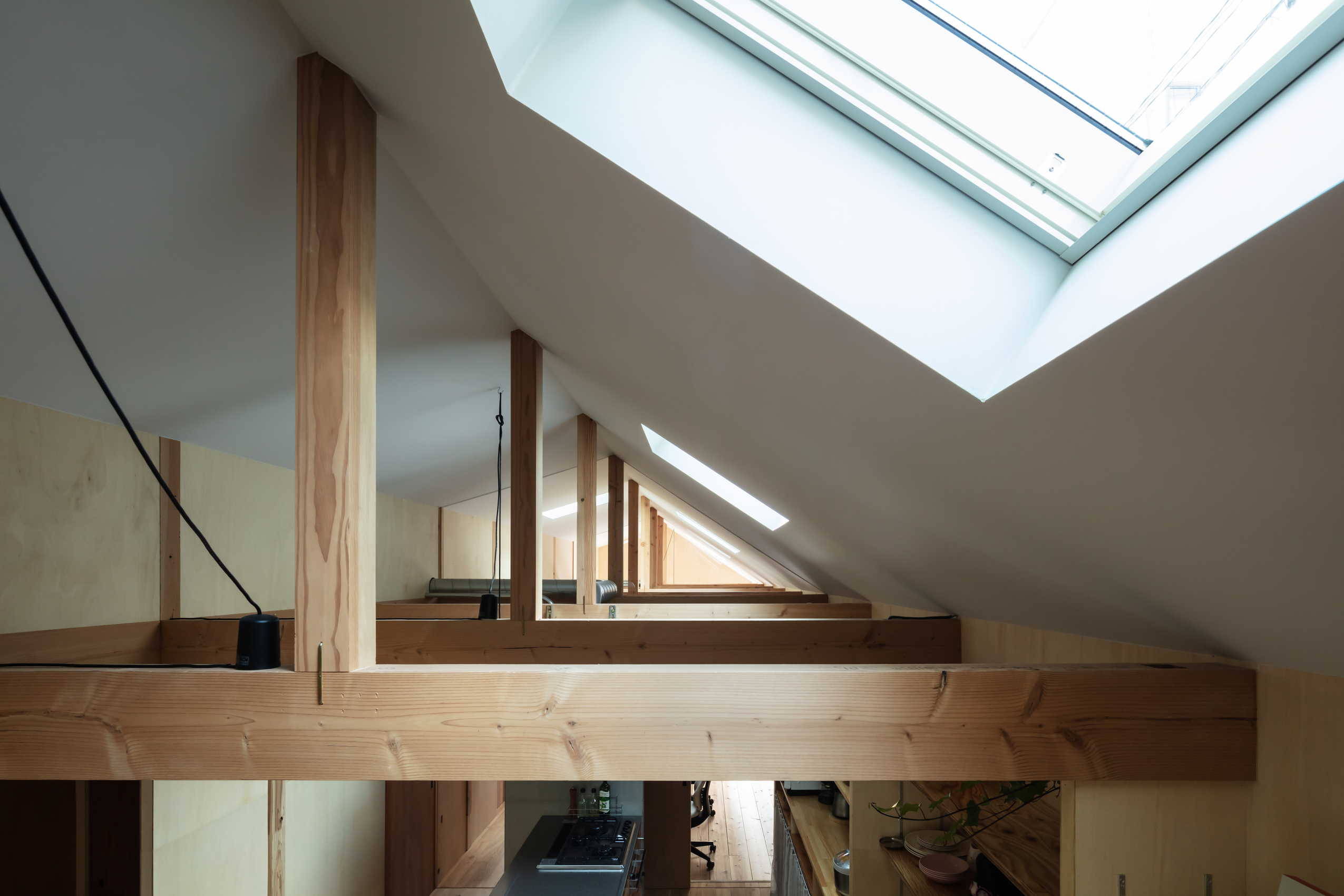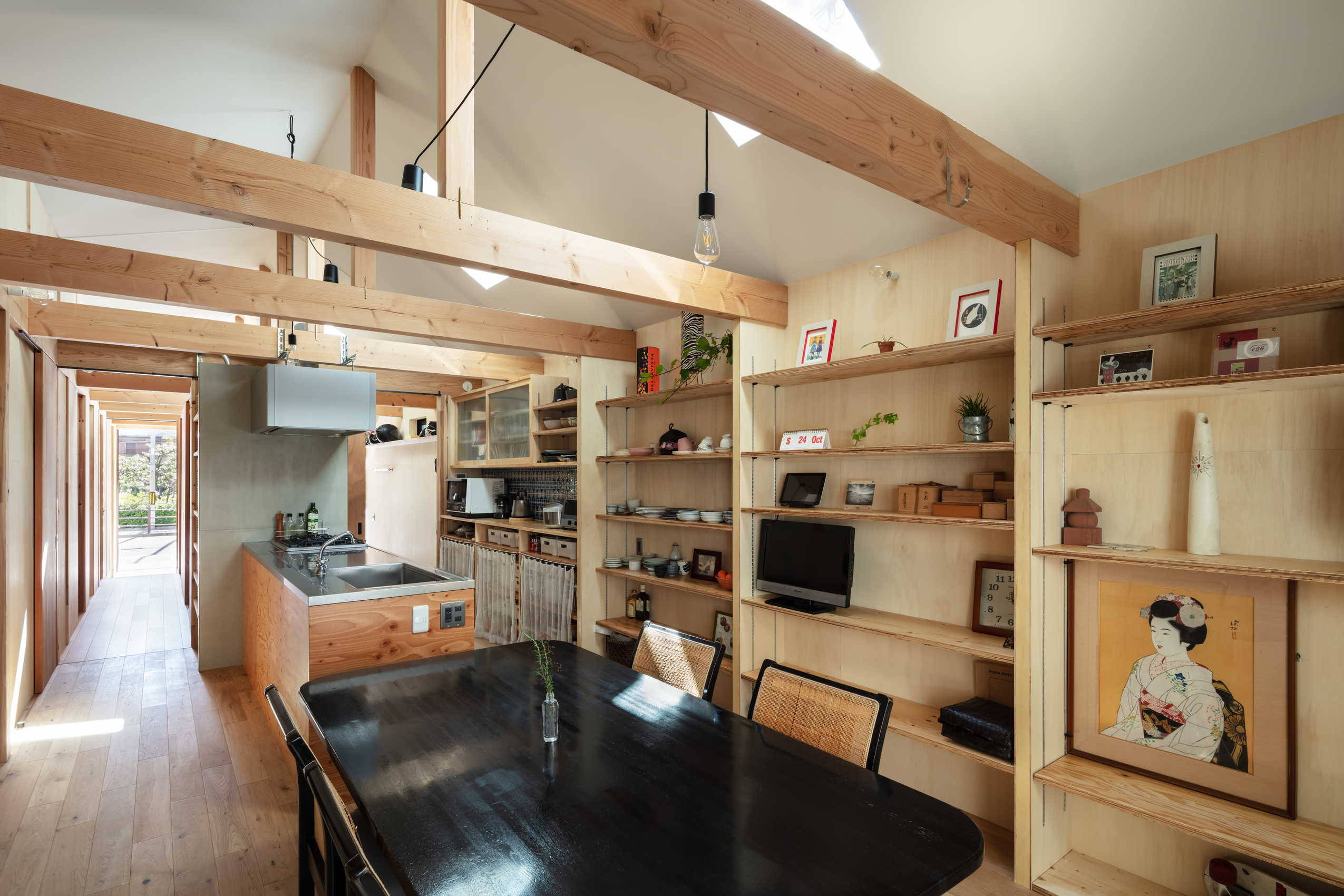 ご夫婦とお母様の生活時間帯や動線の棲み分け、来客対応、商品の搬出入や保管など複雑に絡み合った条件を、ヒヤリングとプランニングを繰り返しながら紐解き、最終的には細長い敷地形状に沿った細長い平屋の中に、目的に応じた小さな部屋がぎっしり詰まった工具箱のような建物になりました。その上にシンプルな三角屋根を架け、ビルの合間を縫って日光が注ぐよう各部に天窓を穿っています。前面道路側は防火壁を斜交いにせり出す事でオフィスとしての存在感を主張しつつ大きな軒下をつくり、内外が曖昧な生活を引き継げる土間としました。東西に生活動線と事務所動線を分け、それぞれ長手面を収納やデスクとして活用しながら奥の居間へと繋がります。日中、ダイニングに腰掛けて過ごす生活のためいわゆるリビング空間は省き、皆で調理できるようにキッチンやその周辺の空間を広めに計画。居間は家庭菜園や植栽を楽しめる小さな庭へと続いています。