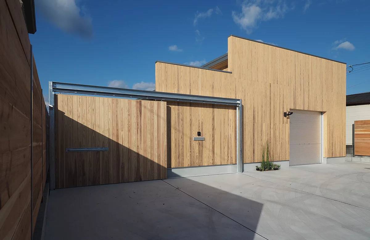 潮風や砂が日常的に吹き付ける場所で、自然な経年変化を楽しみたい・・・と選んだ杉板張りの外壁や板塀が目を惹きます。