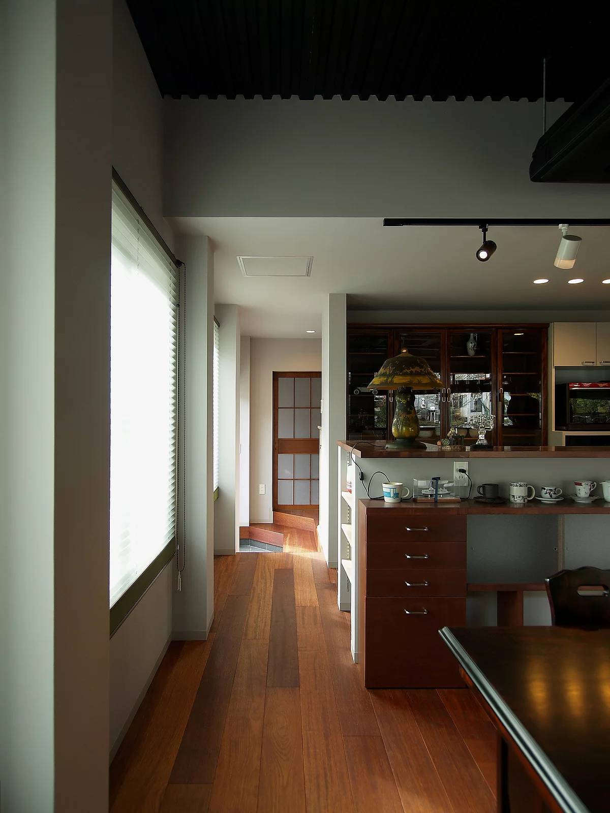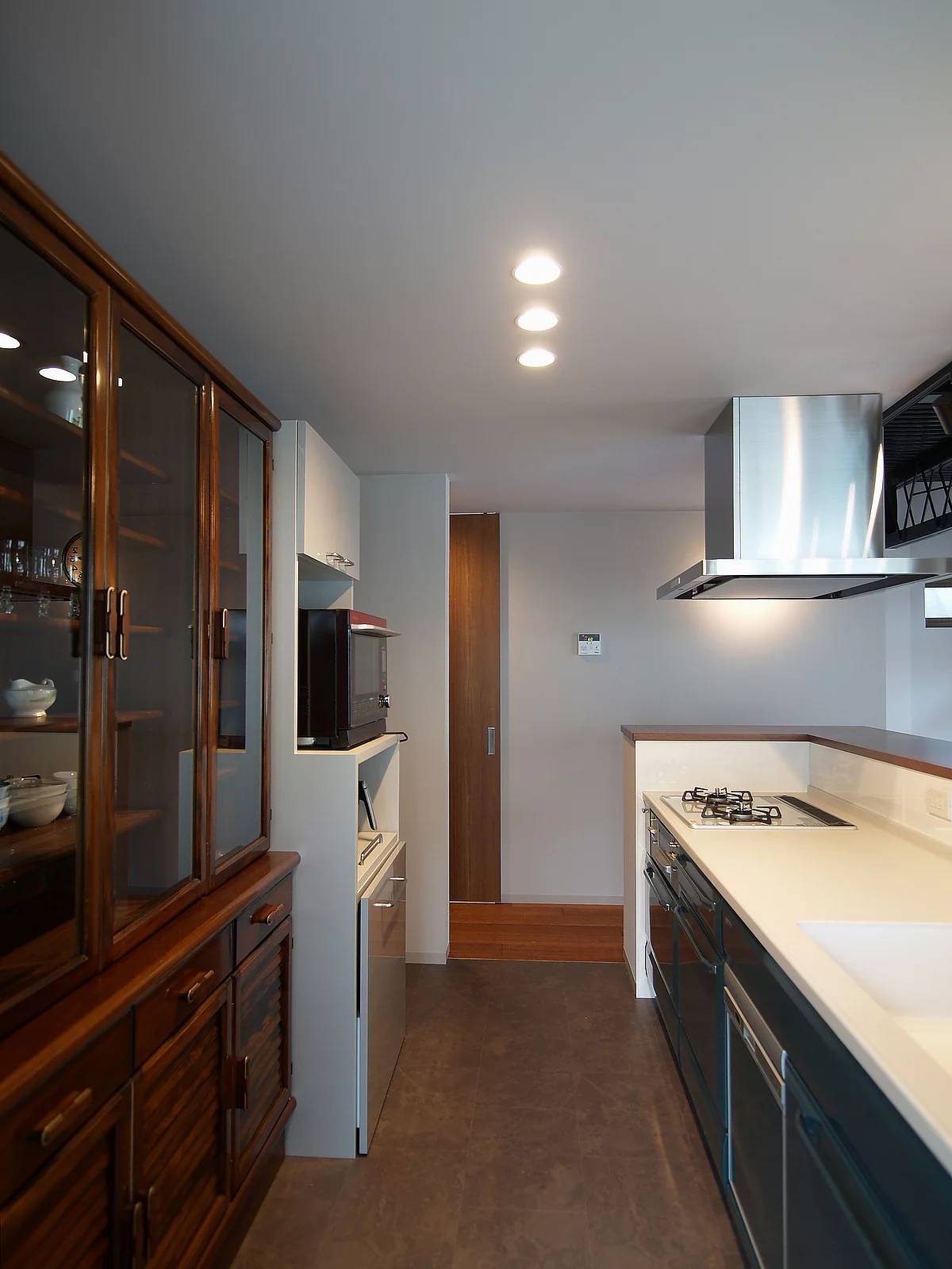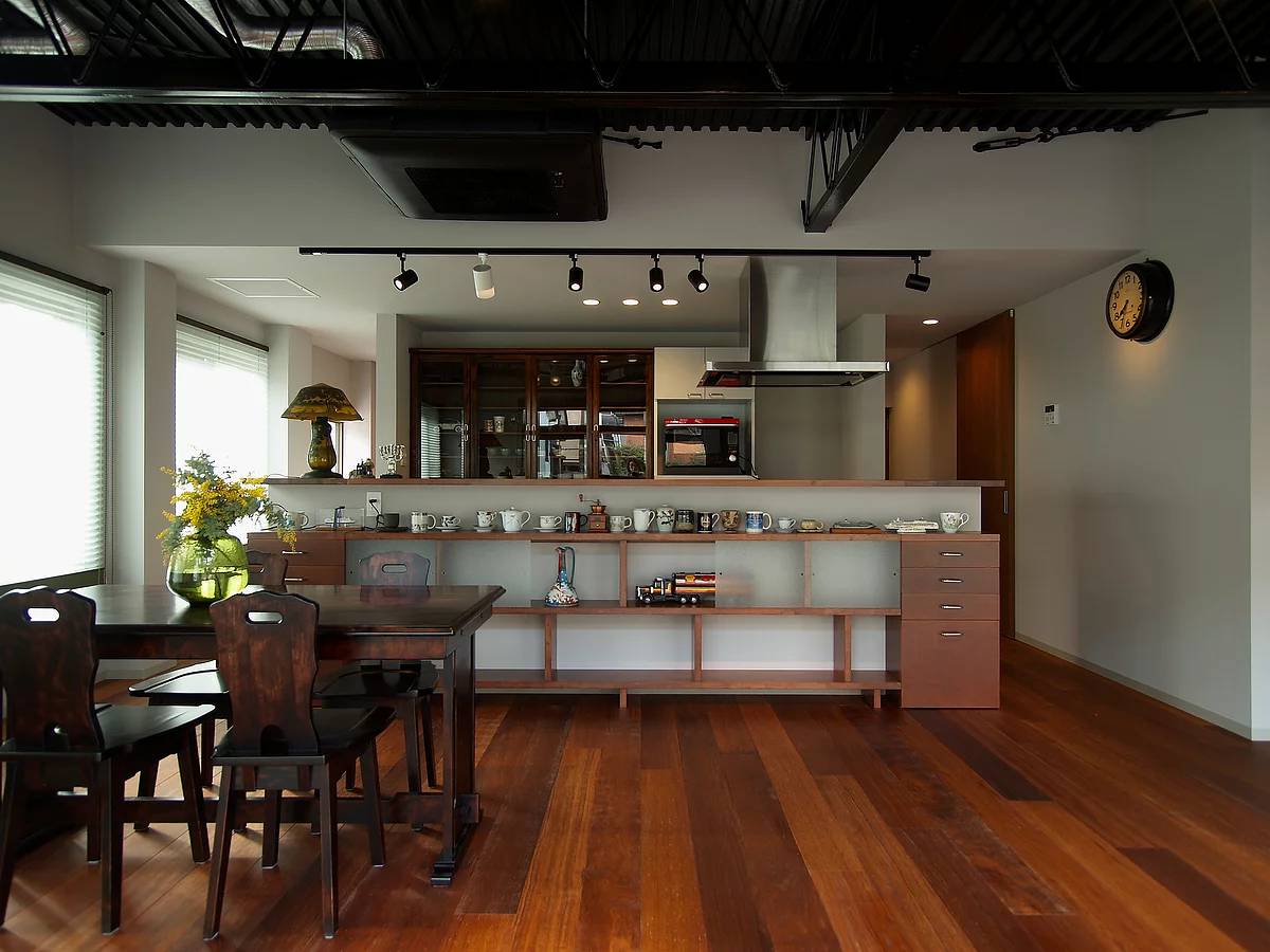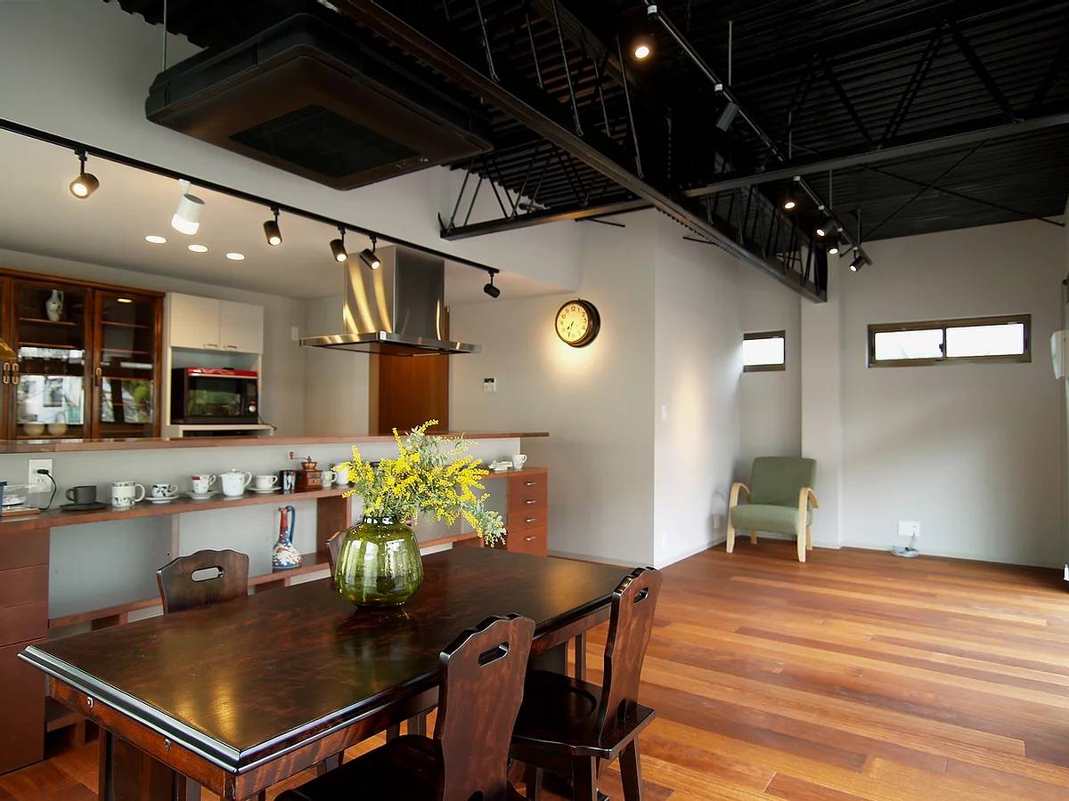 店舗として使っていた鉄骨造の部分に、新しく、キッチンや浴室、水回りなども含めて、すべての生活空間を移すリノベーション。