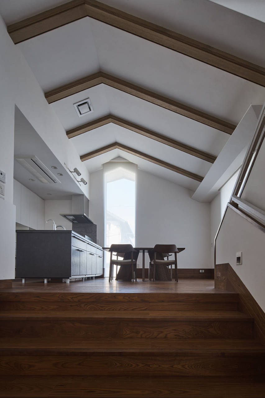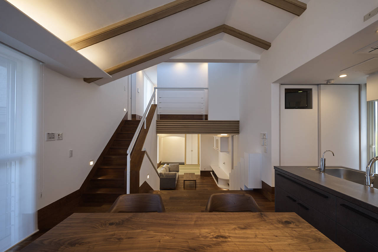 リビングの大階段から、中2階のダイニングキッチンを見る。