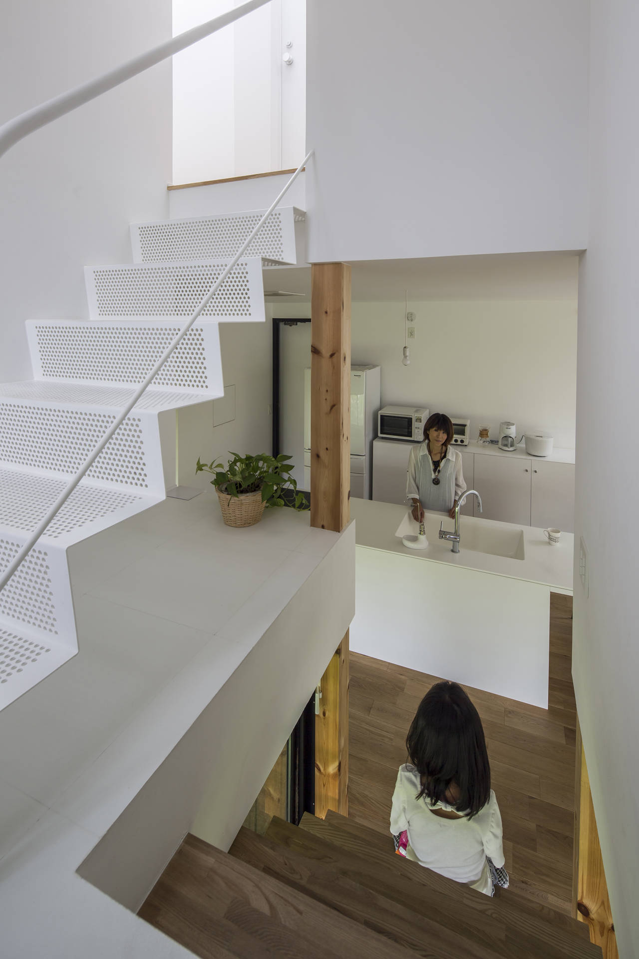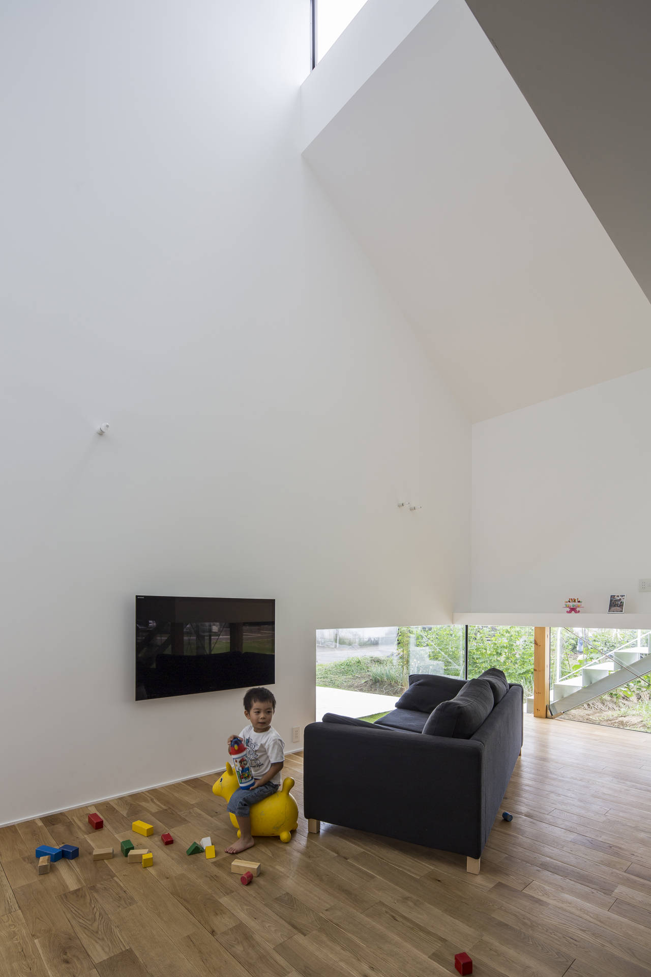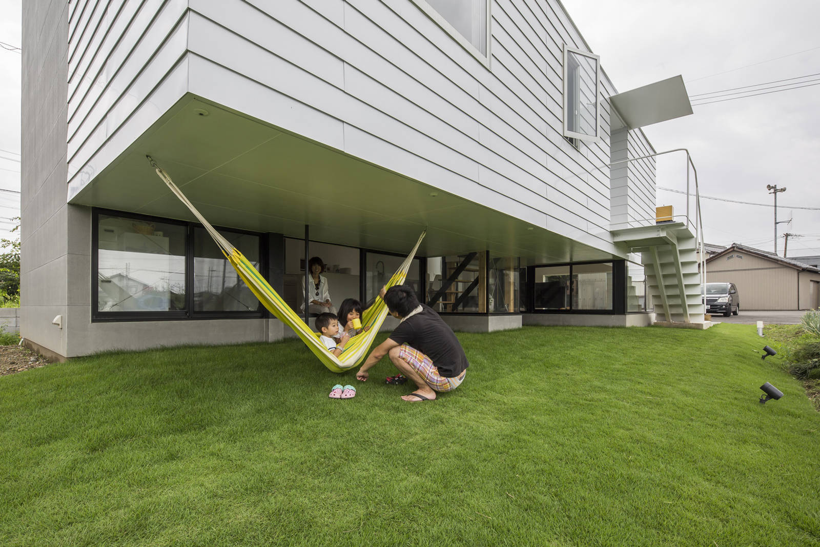 軒の下の空間は子どものための中庭のようであり、内部からすると庇下の縁側のような空間である。コンパクトな住宅ではあるが、さまざまなスケールの混在が、この住宅での生活に豊かさをもたらしている。
