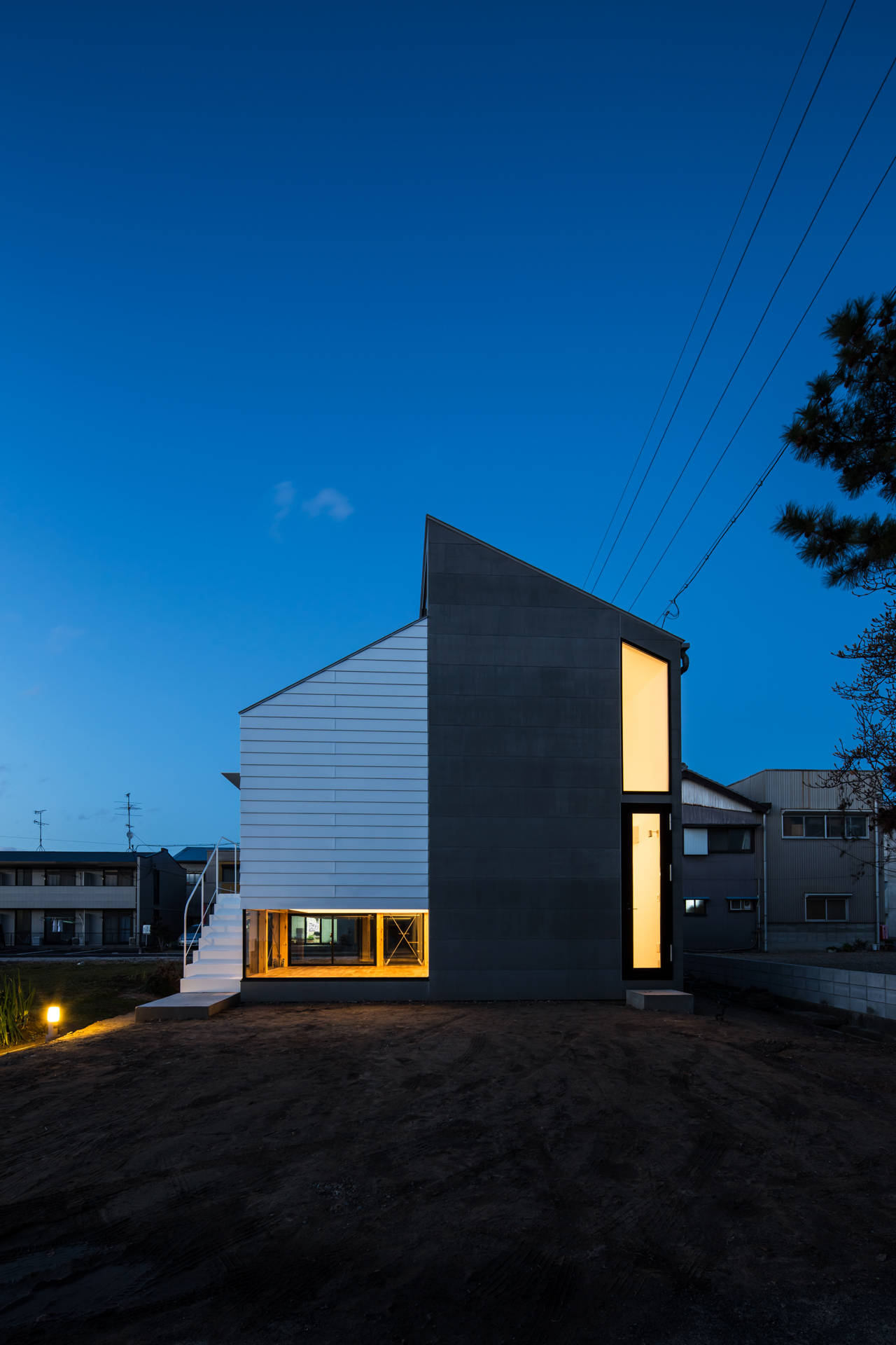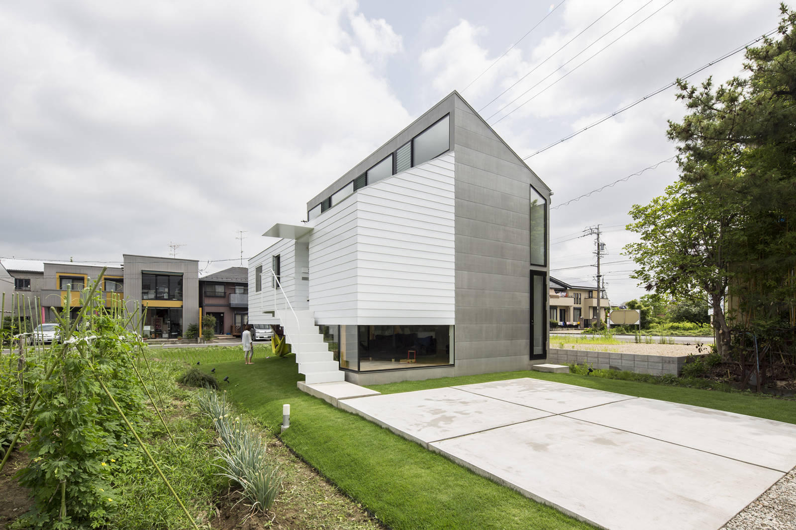 岐阜の市街地に建つ家族四人の為の住宅。敷地は大きな道路から一本入ったところに位置し、西側に畑、北側に田んぼが広がっている。その西側と北側の開放的な緑の風景を生かしてこの住宅は計画された。