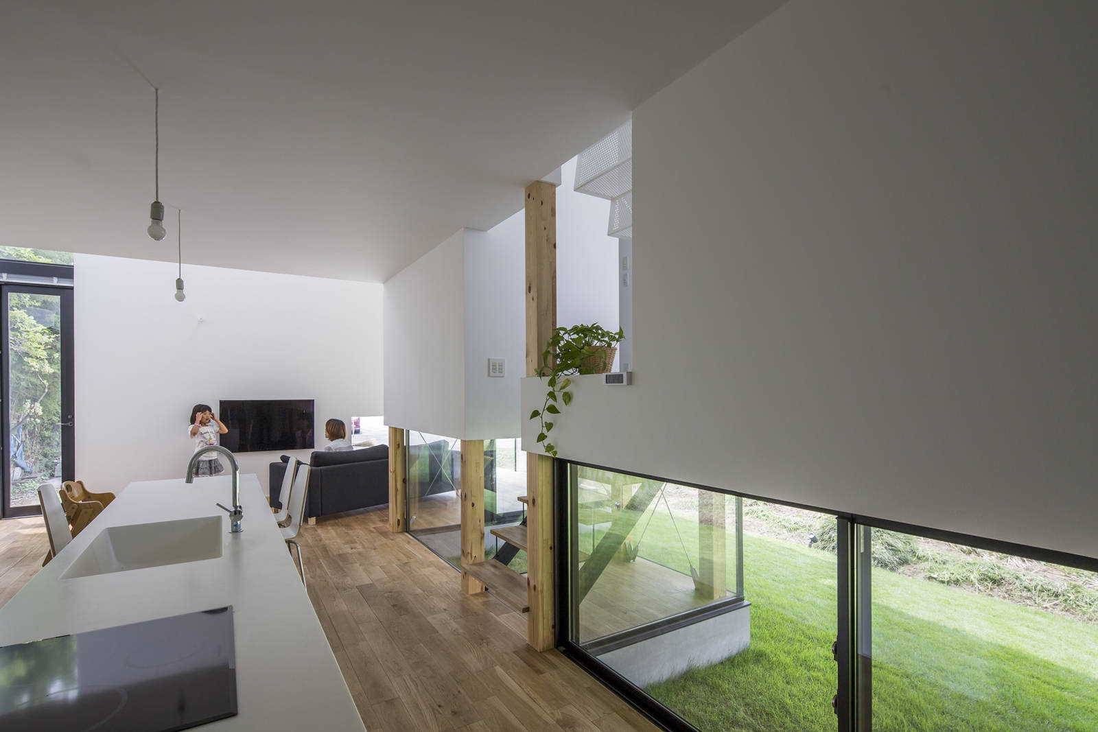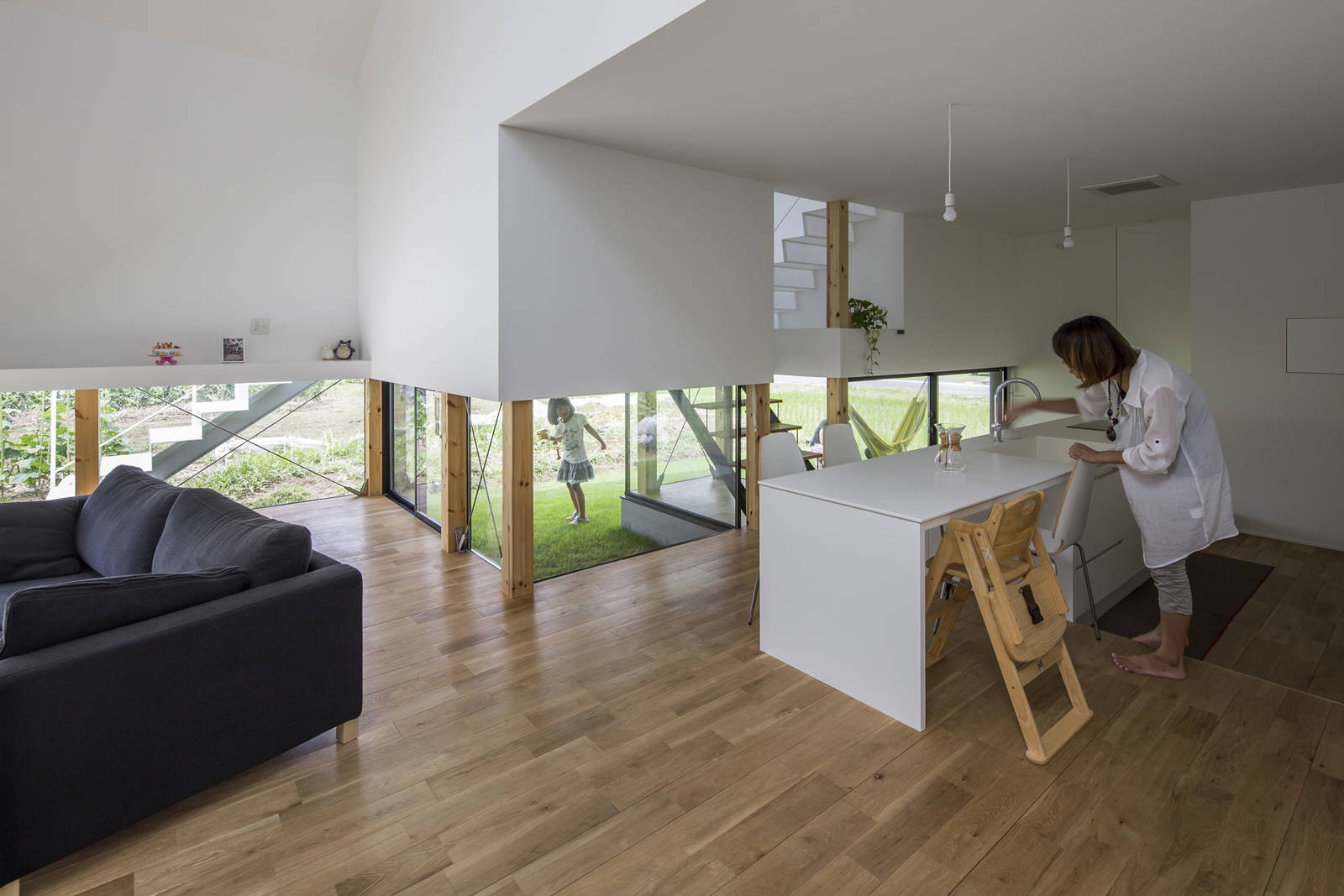 スキップフロア状に建物の半分を半階分浮かせることによって、敷地の多くの地面を解放し、芝生を植えた。田圃や畑など敷地の外まで緑の地面が広がって行き、季節によって様々な表情を住宅の内部に運んでくる。