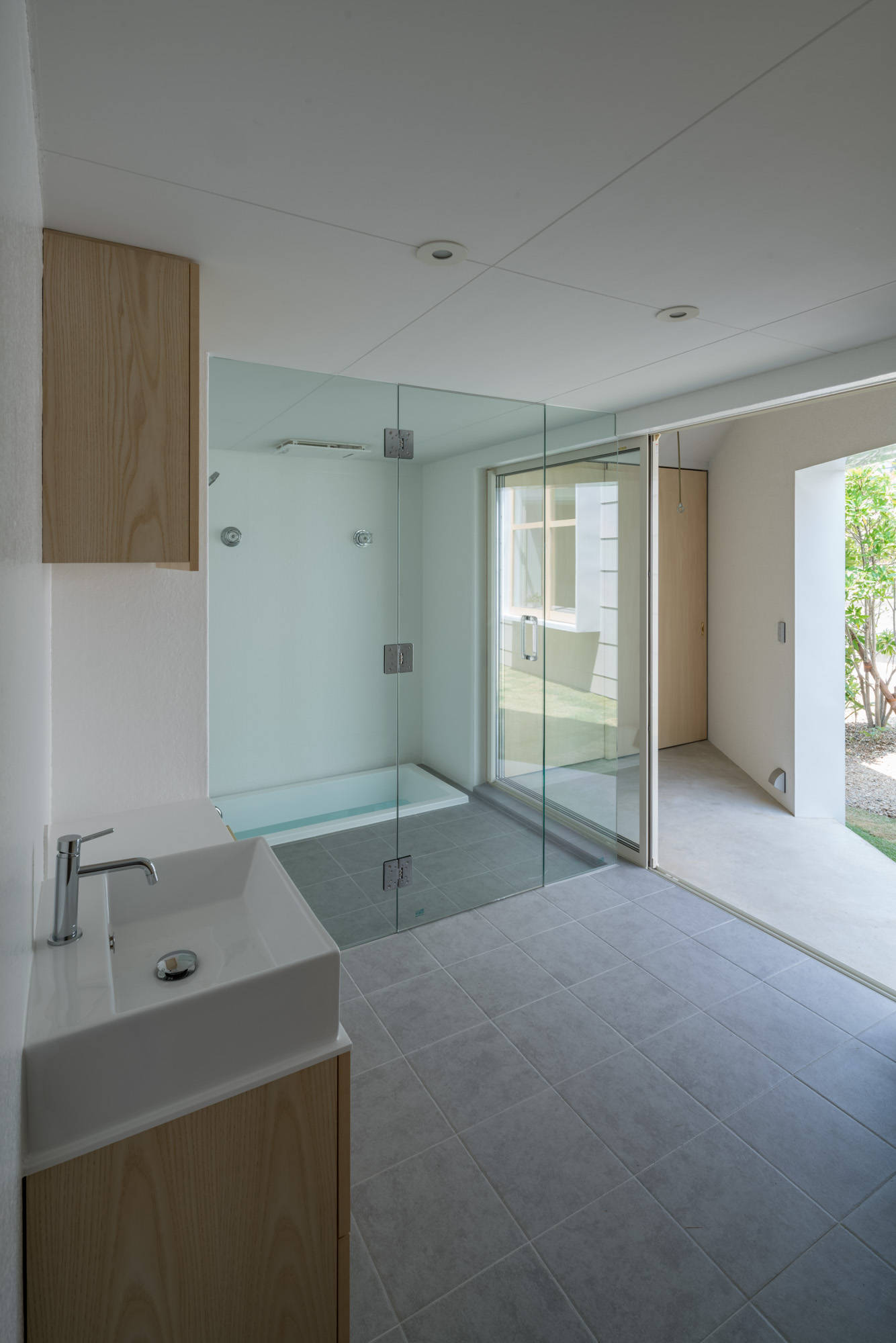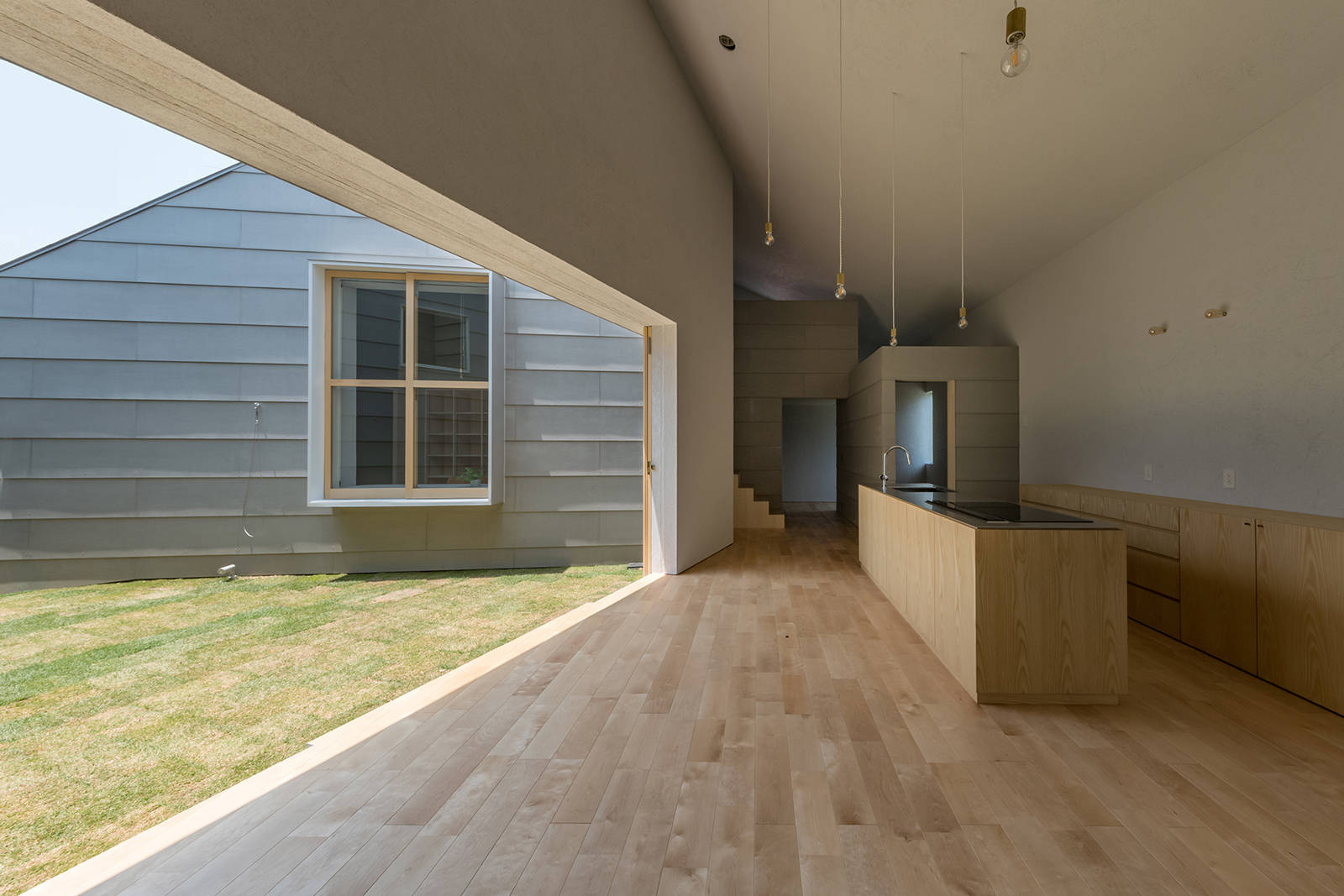 切妻のボリュームを三角形で切り取るというシンプルな操作と箱状のボリューム、光の状態によって、いわゆるガラス張りとは違った形での、静かでありながら外部的な開放感をもった空間となった。