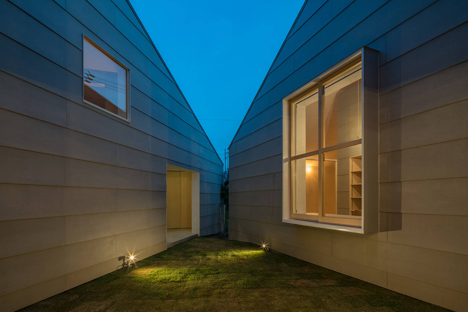 切妻のシンプルなボリュームを三角形で削り取ることで中庭を設けた。