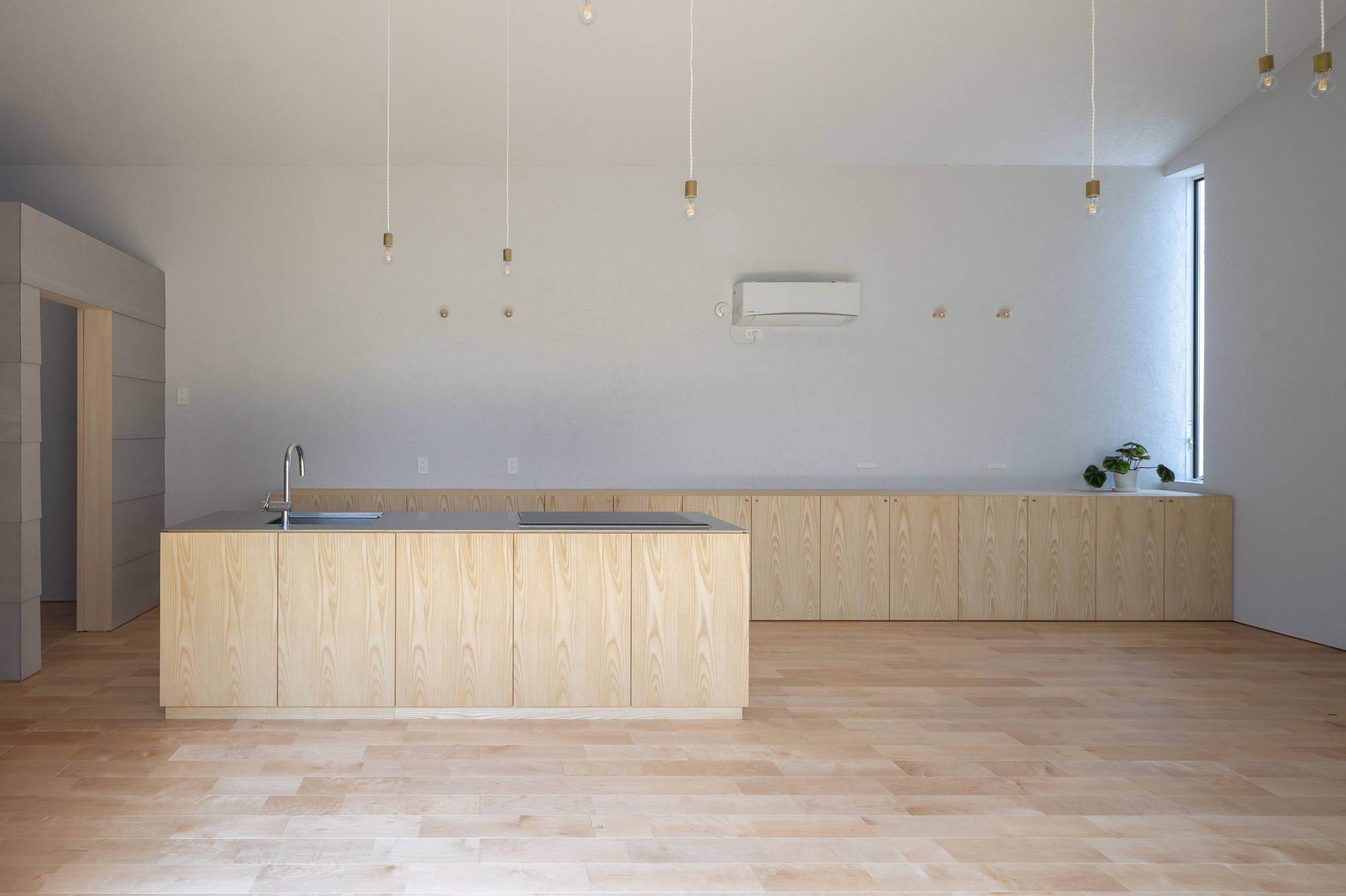 荒い漆喰で壁天井をシームレスに仕上げた大きなボリュームは、時間により移り変わる美しい陰影をつくり、中庭からは気持ちの良い風が通り抜ける。