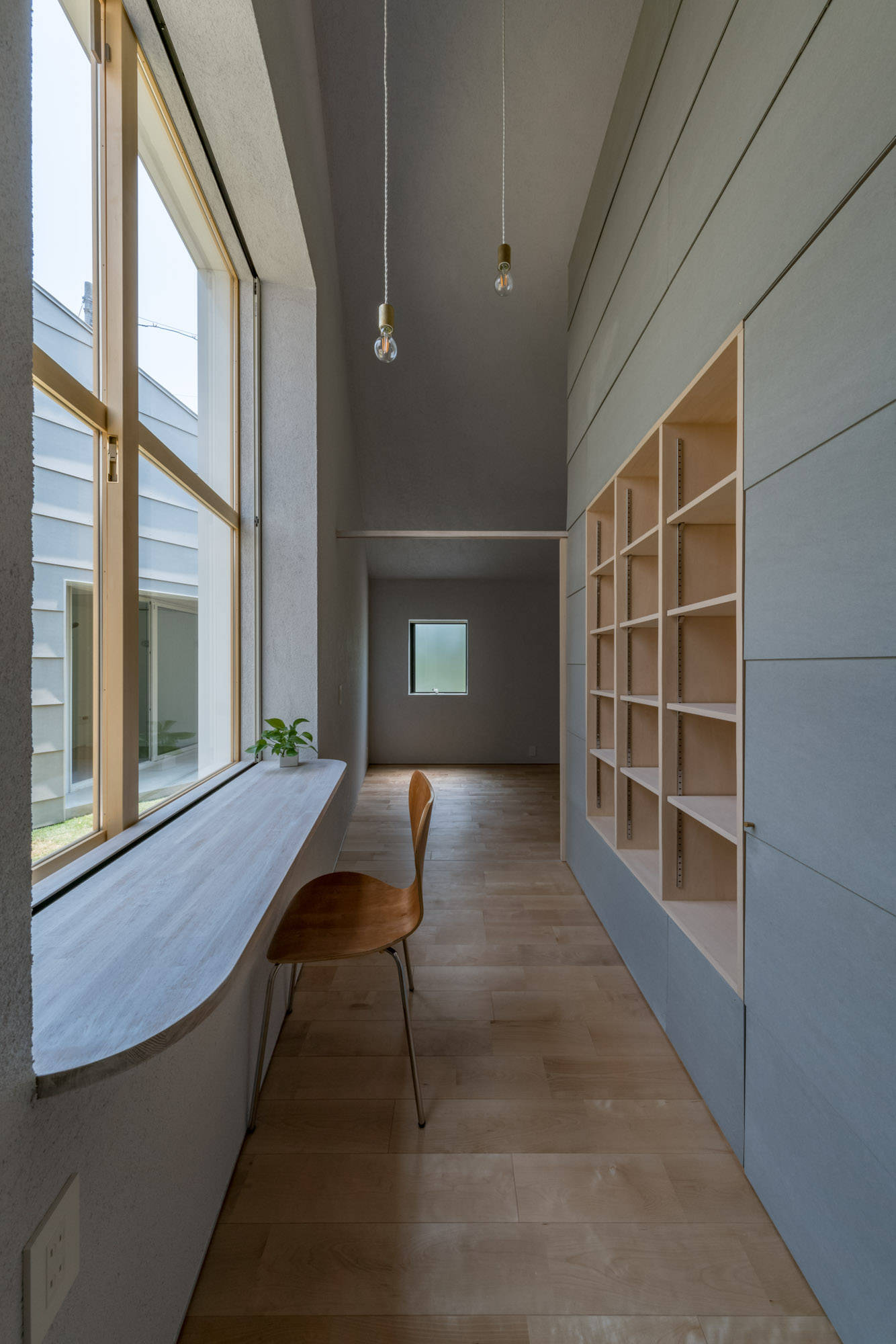 内部の各部屋は箱状のボリュームとして分散し、外部と同じフレキシブルボードで仕上げた。
