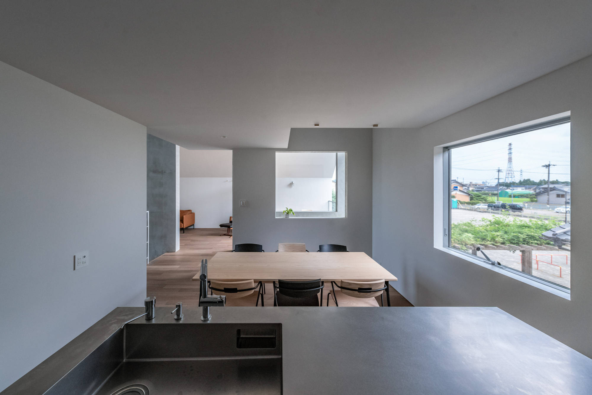 1/3が公園に面している敷地を利用して、道路から公園への抜けを確保する様に1階にはガレージ兼土間テラス、公園への眺望を生かせる2階にはリビングを配置し、公園からの風が住宅全体に巡る様に計画している。