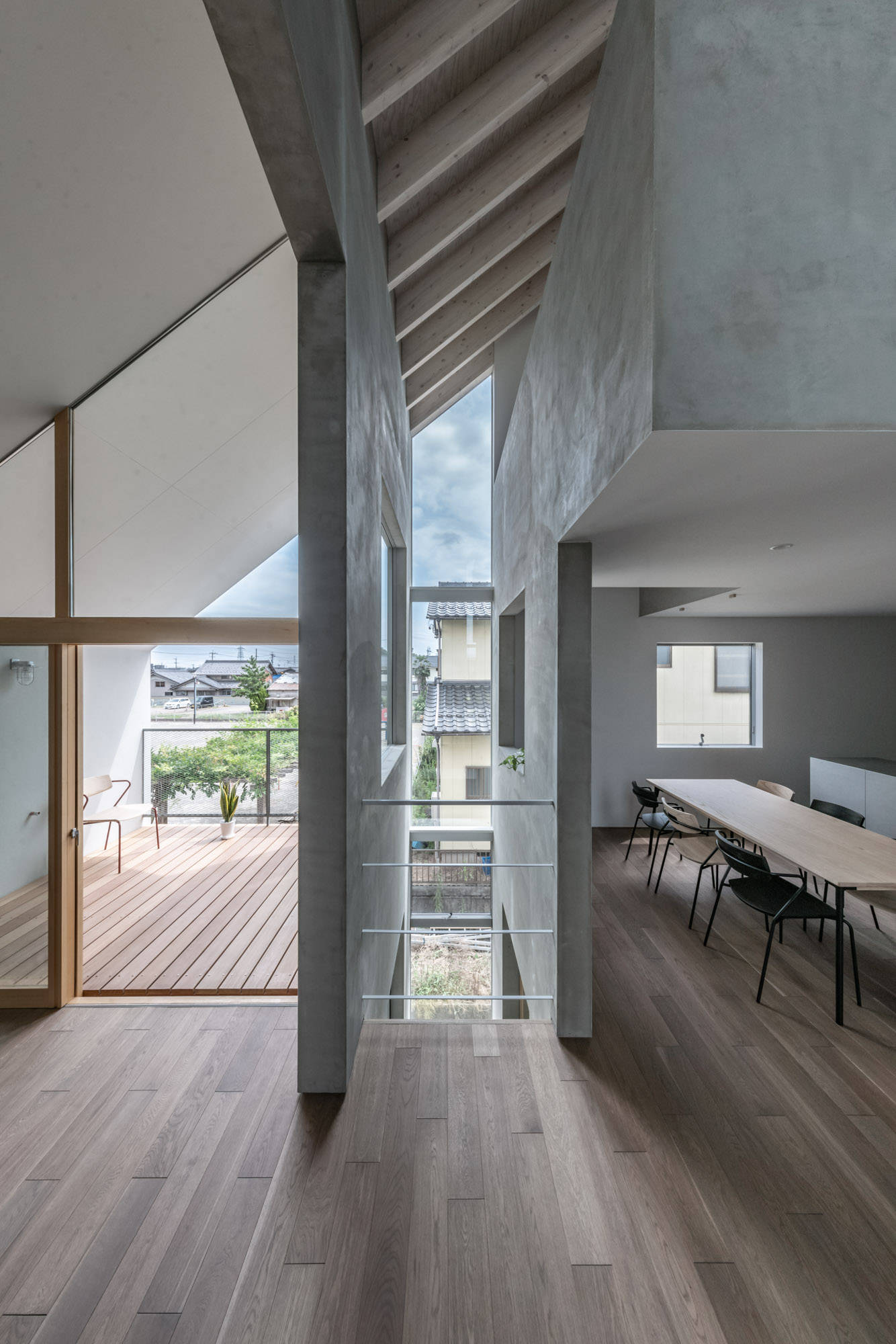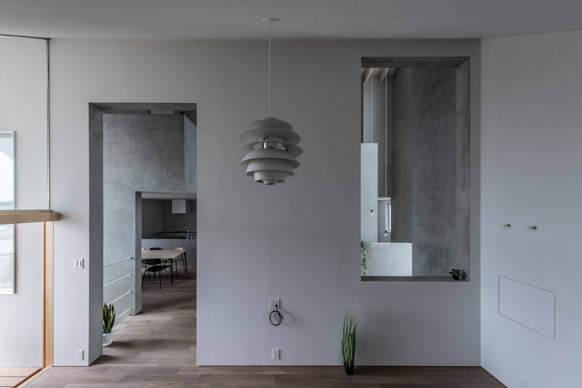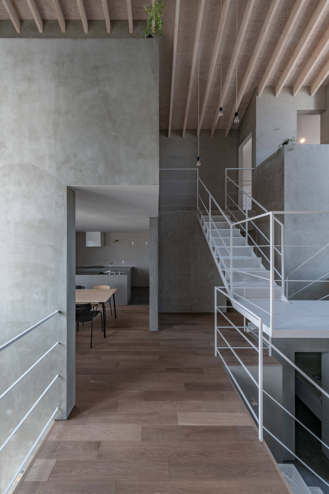 家族の気配を常に感じて生活したいというクライアントの要望に答える為、3層吹き抜けのパブリックな性質をもつ動線室(廊下や階段が集約された場所)を住宅の中央に設け、各部屋にバルコニーの様なインナーテラスを動線室に面する様に設けた。