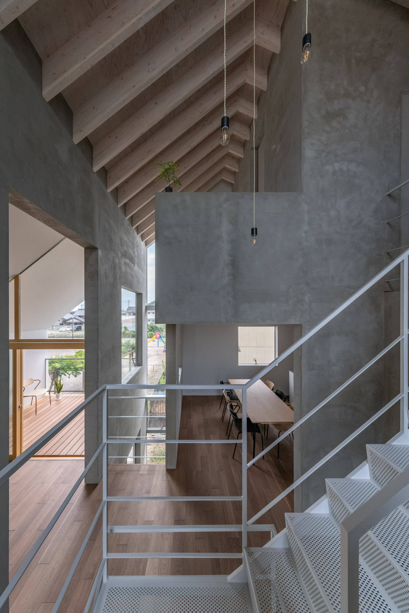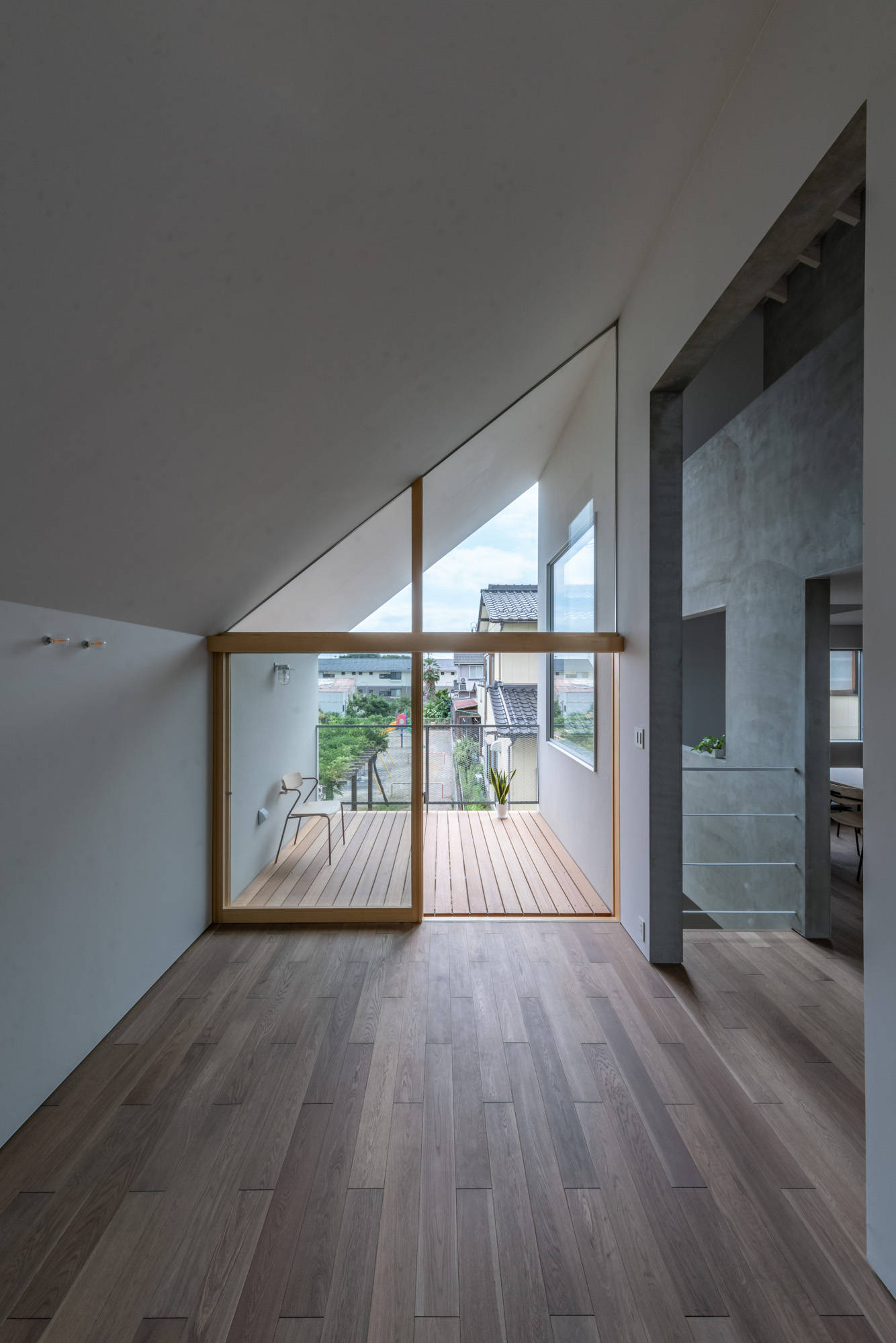 公園に対して軸を振りながら、人や物のスケールに合わせてクランクした動線室は1層上がるごとにセットバックして広がり、コンパクトな住宅に奥行きと居場所を与え、各場所に光と風を運ぶ。