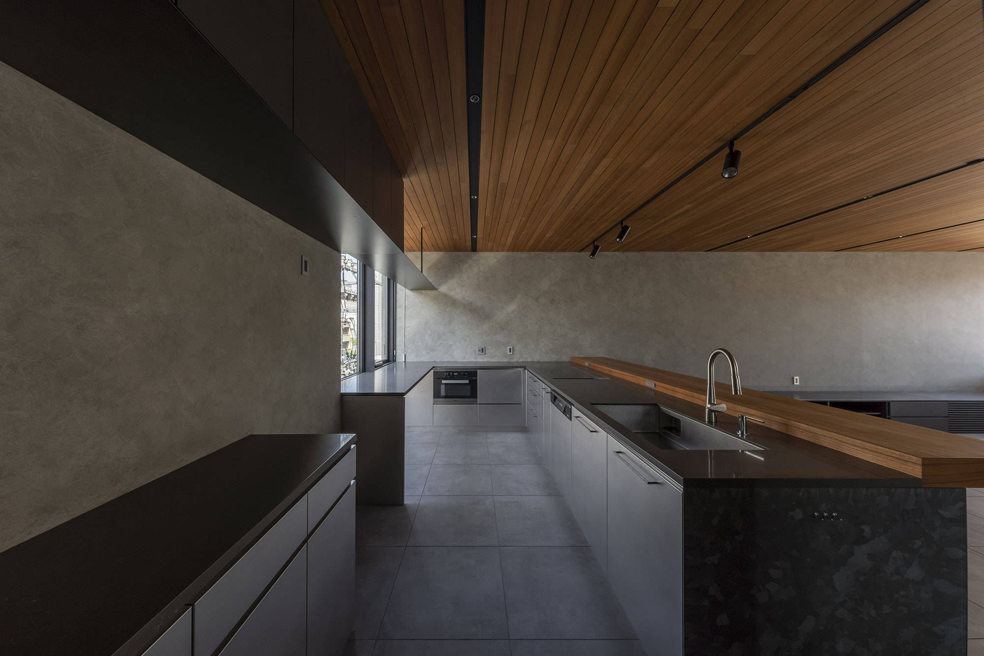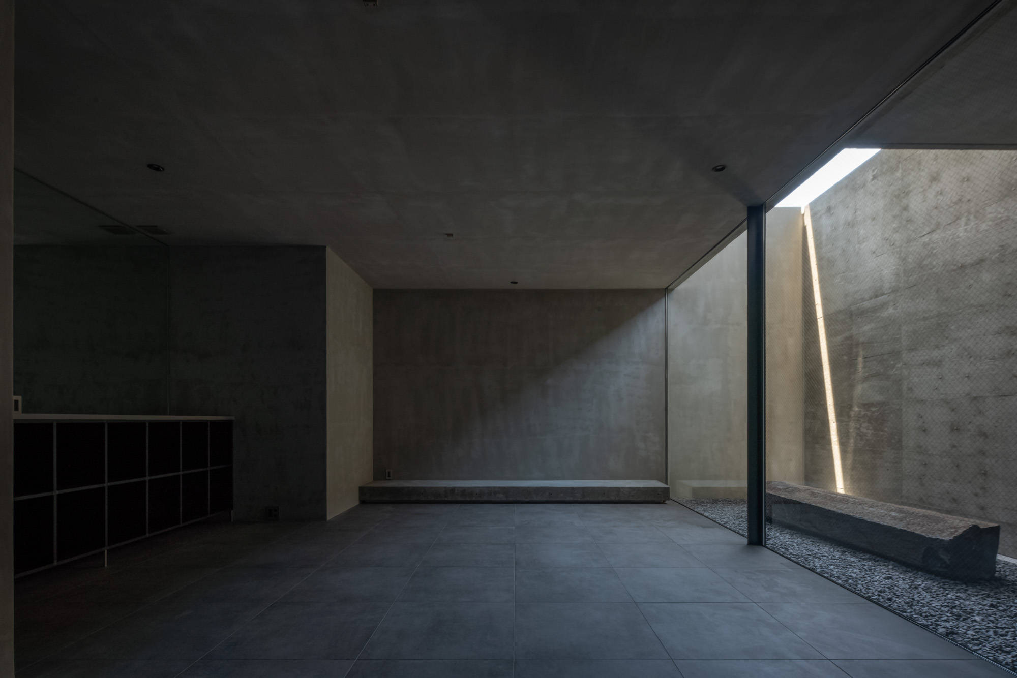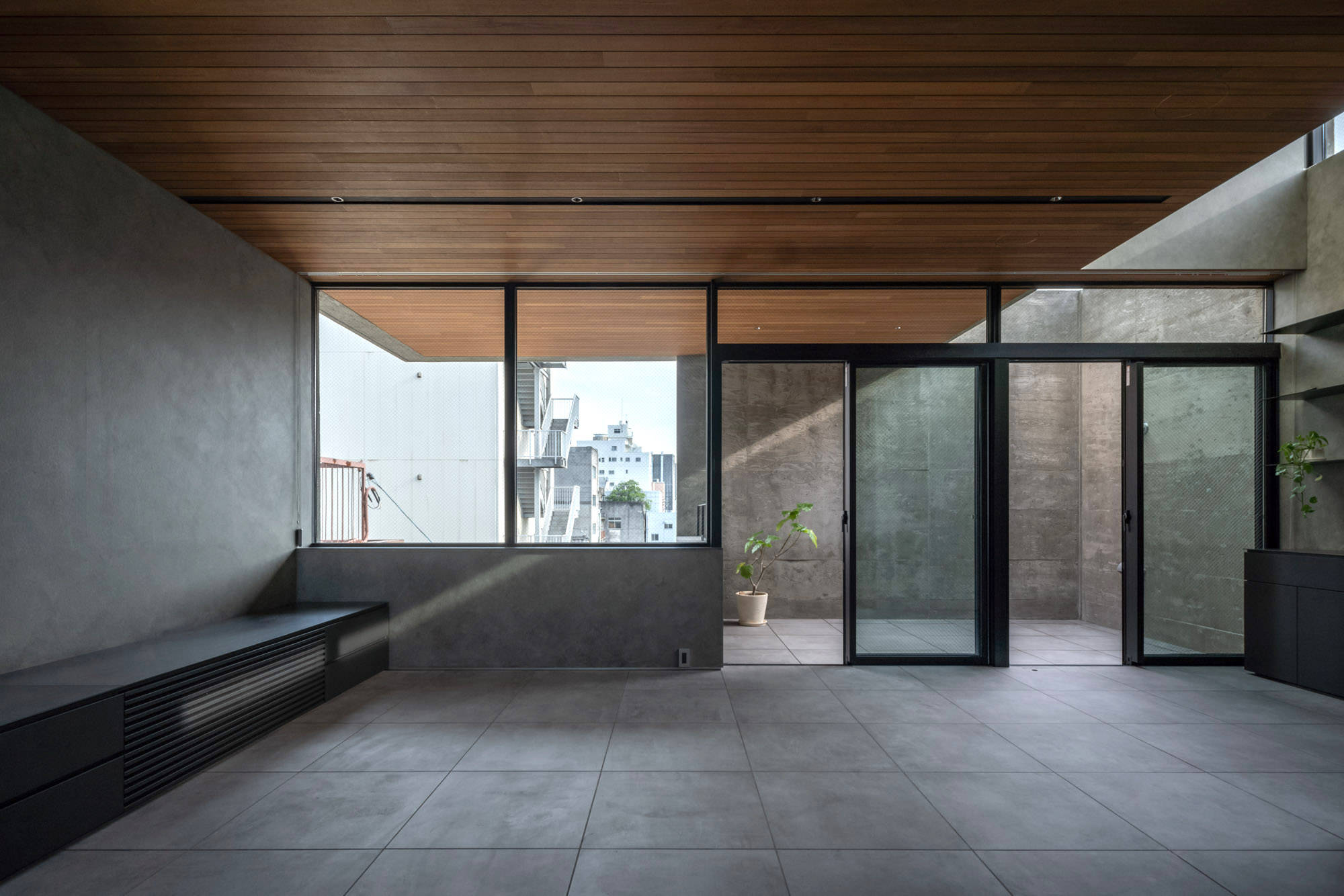 外周部の開口と室内の開口部の階がズレる事で、周辺からのプライバシーを守りながら、光や風を通し、室内に彫りの深い陰影をもたらしている。