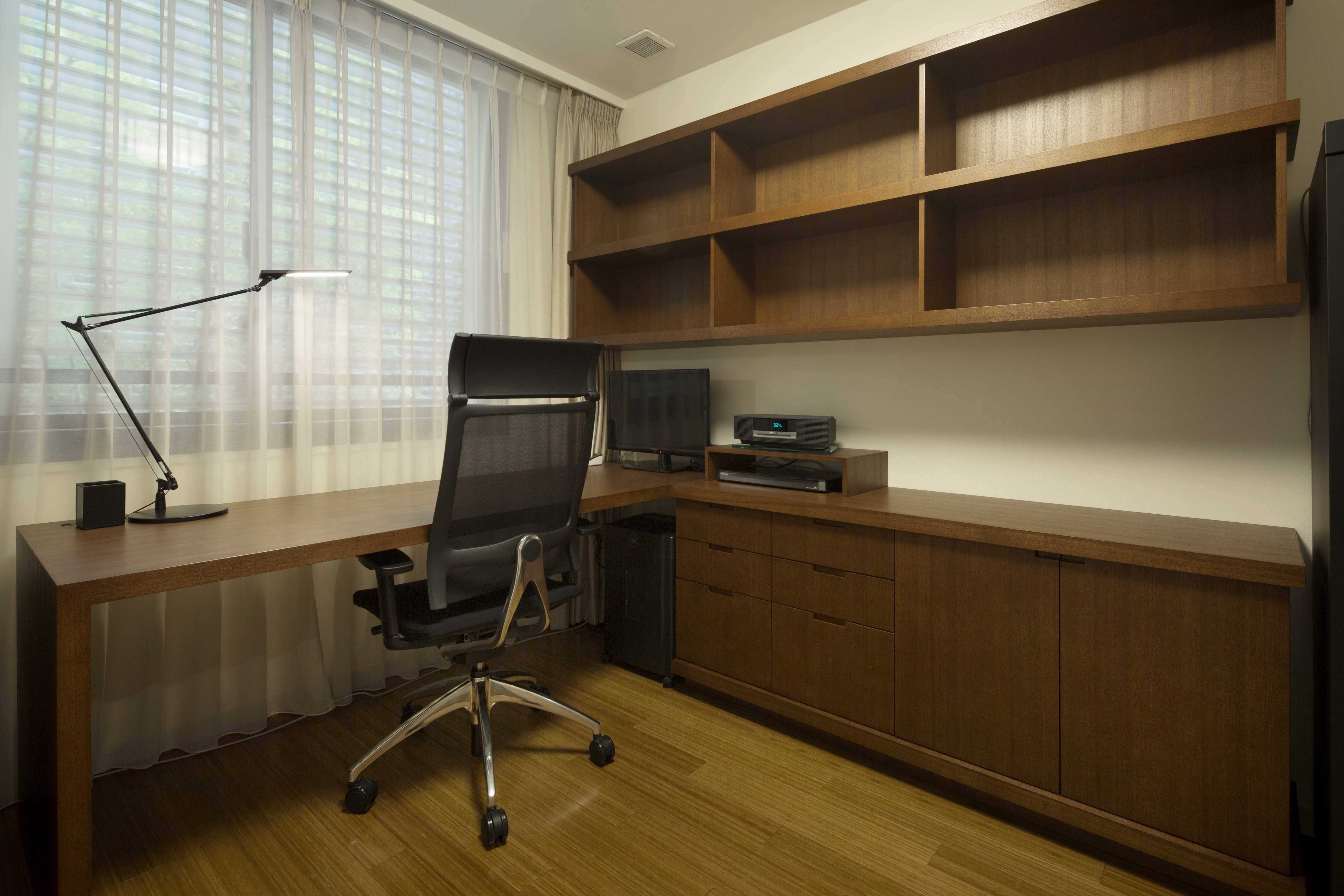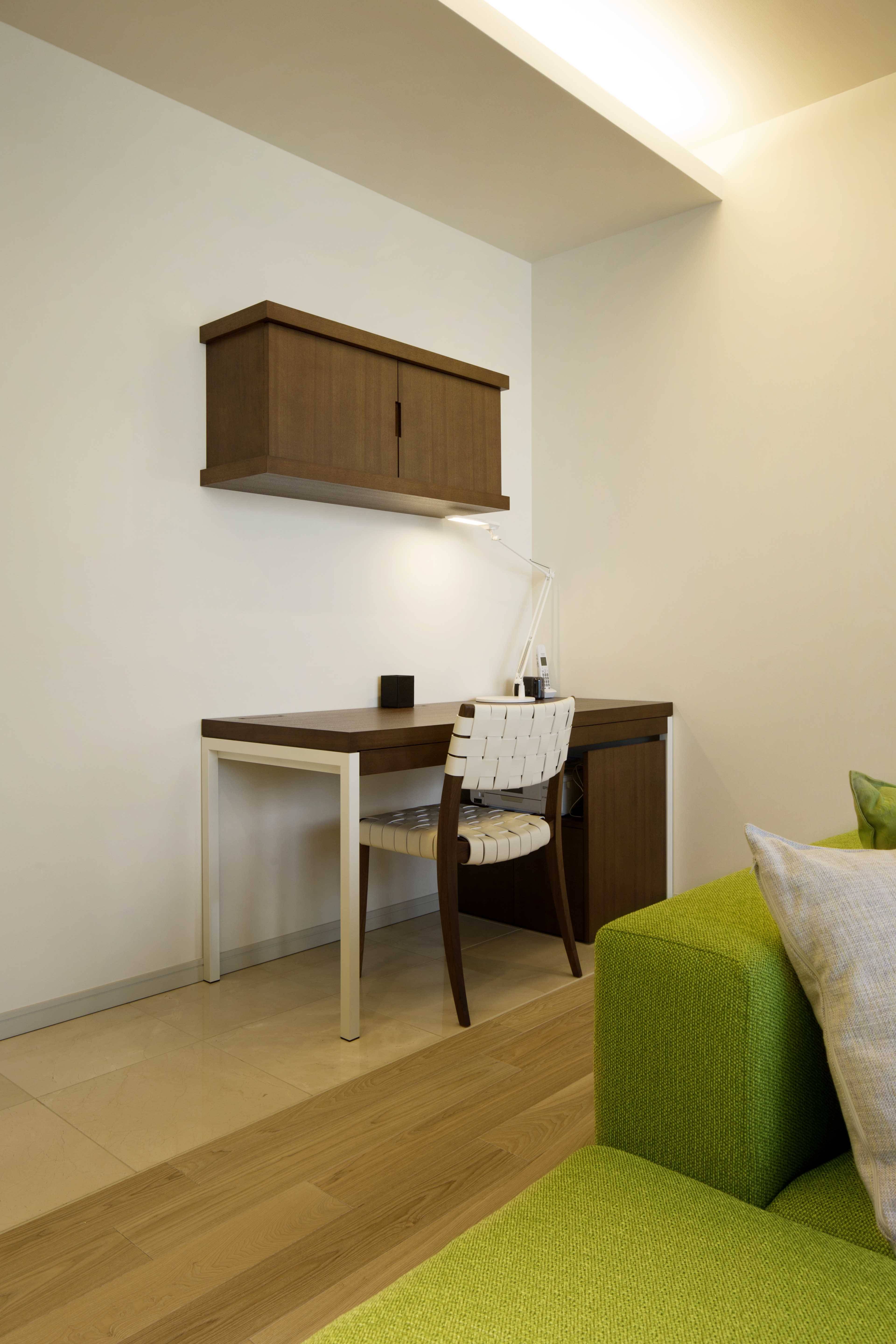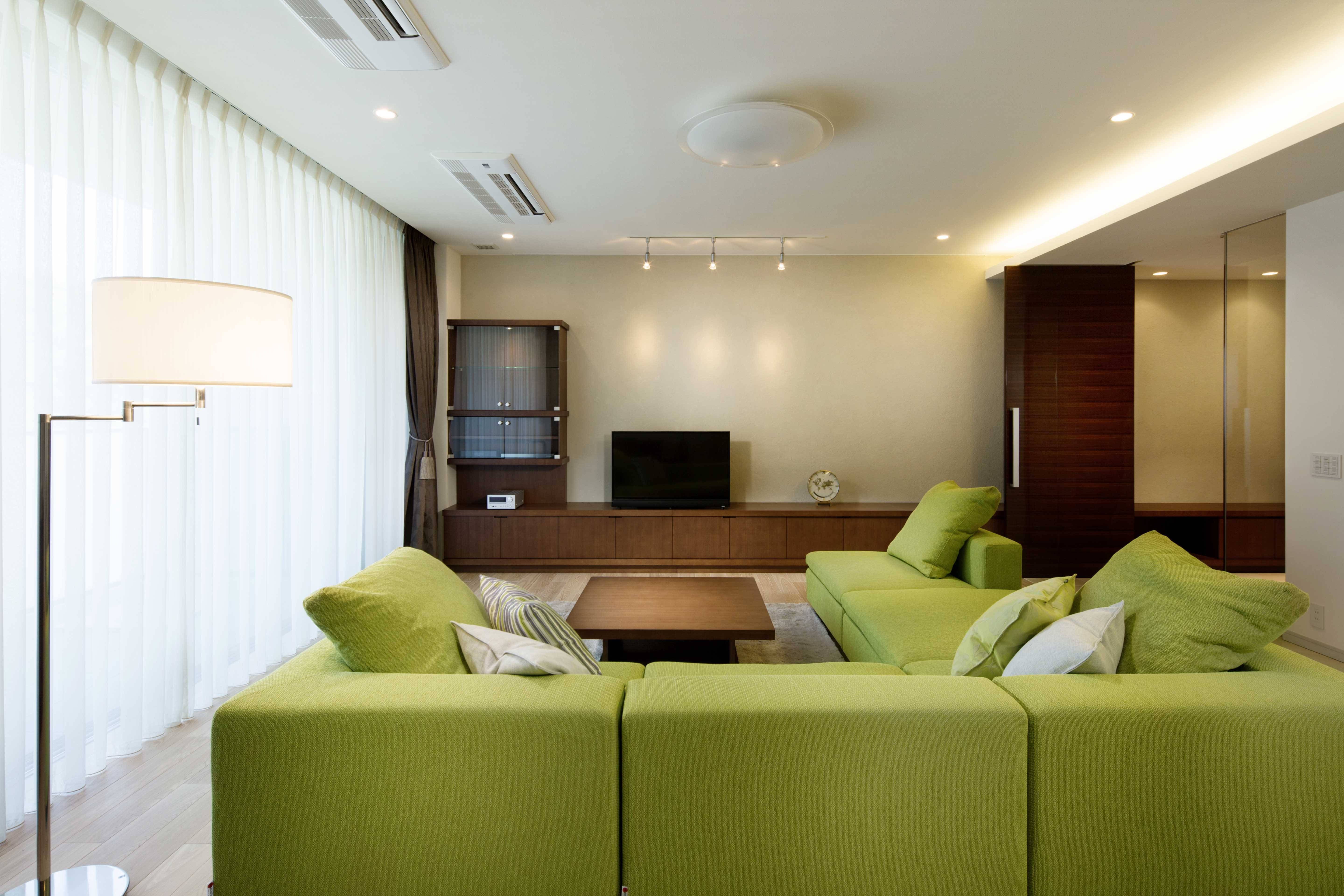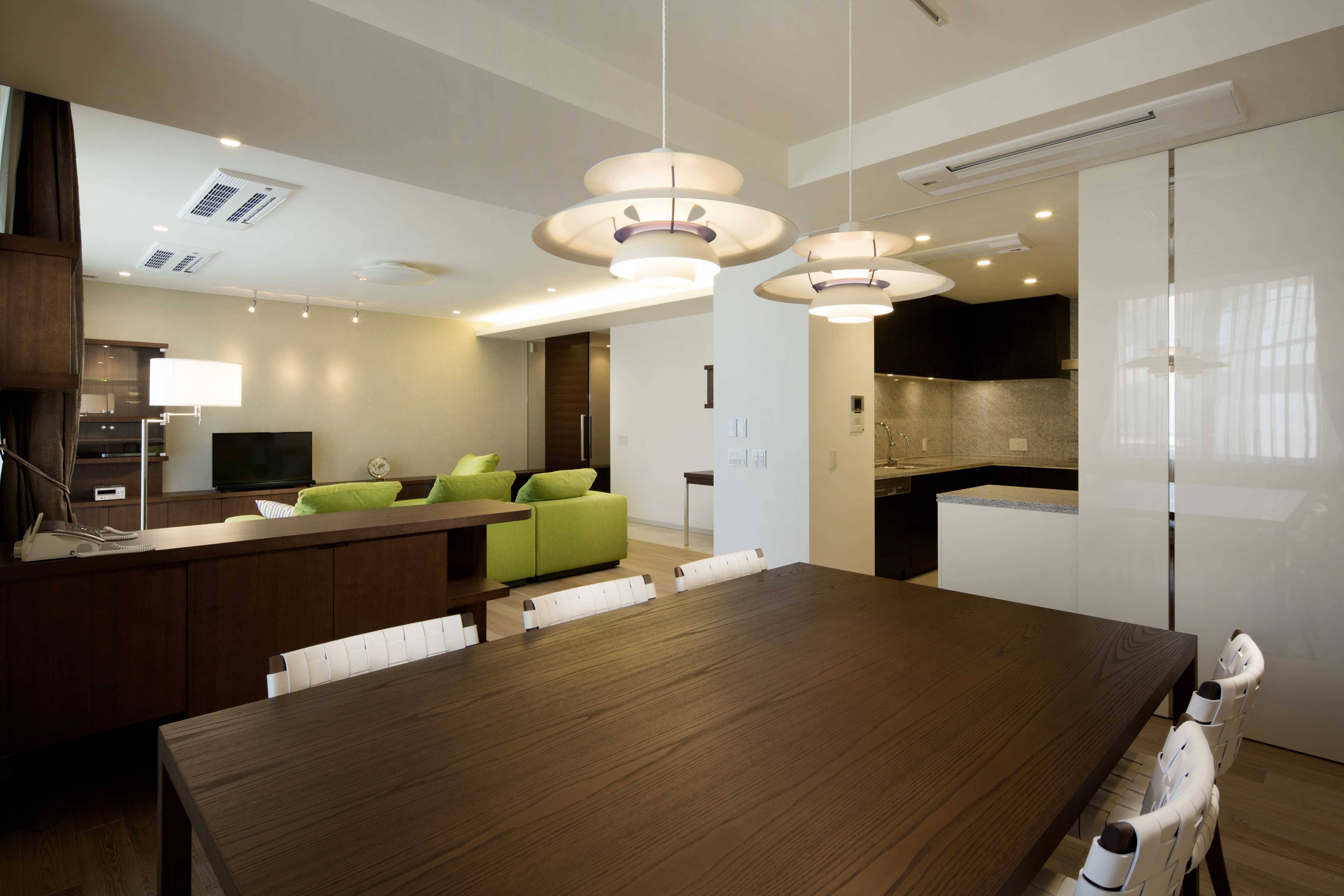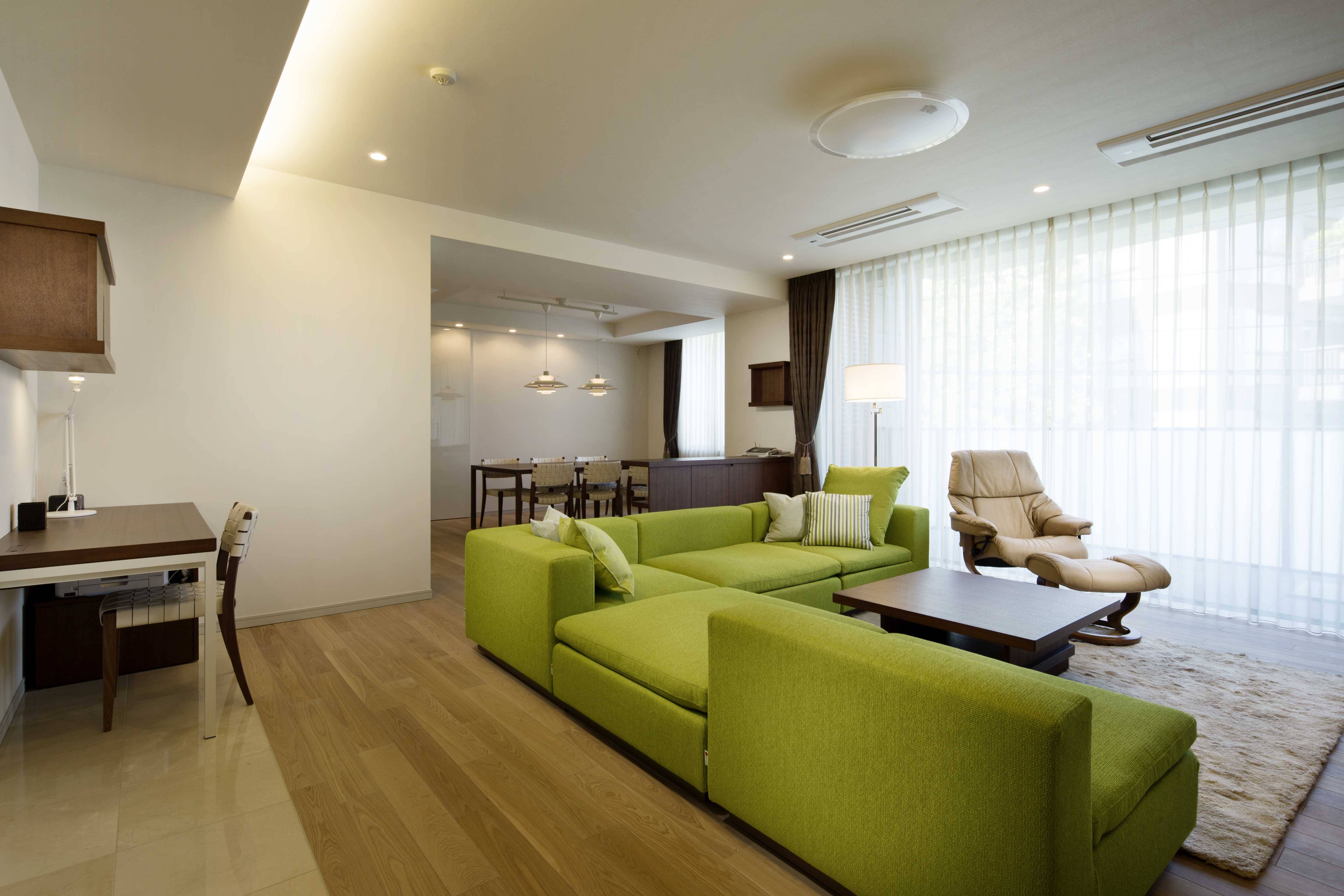 まだ新しかったこともあり、クロス及び傷が目立ったフローリングとカーペットの張替以外、建築にはほとんど手を入れませんでしたが、製作・既製の家具を取 り混ぜてあるべき場所にレイアウトし、電気器具を適正に配置することで、「いらないもの」が見えない、常に美しく落ち着いた住空間が実現しました。