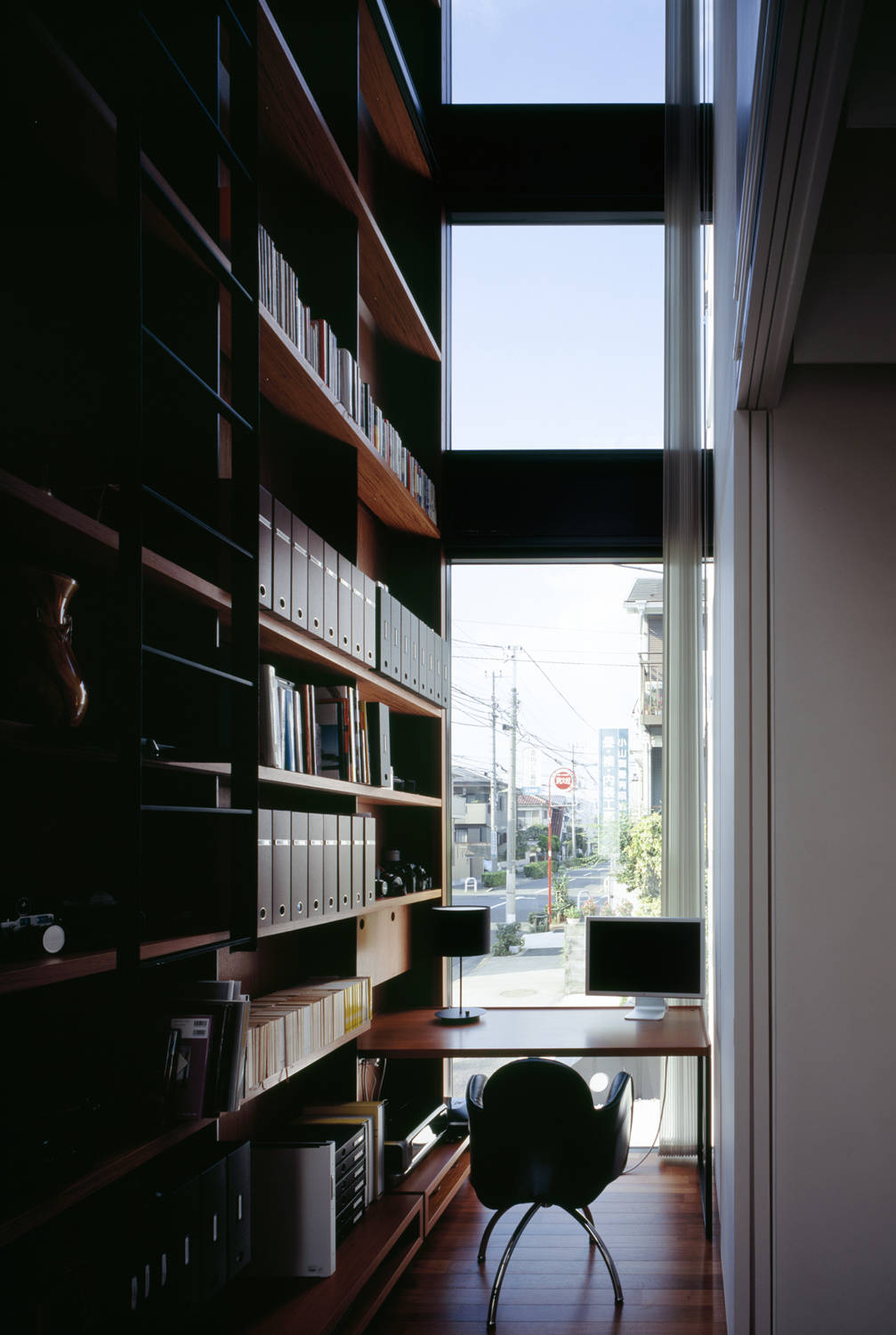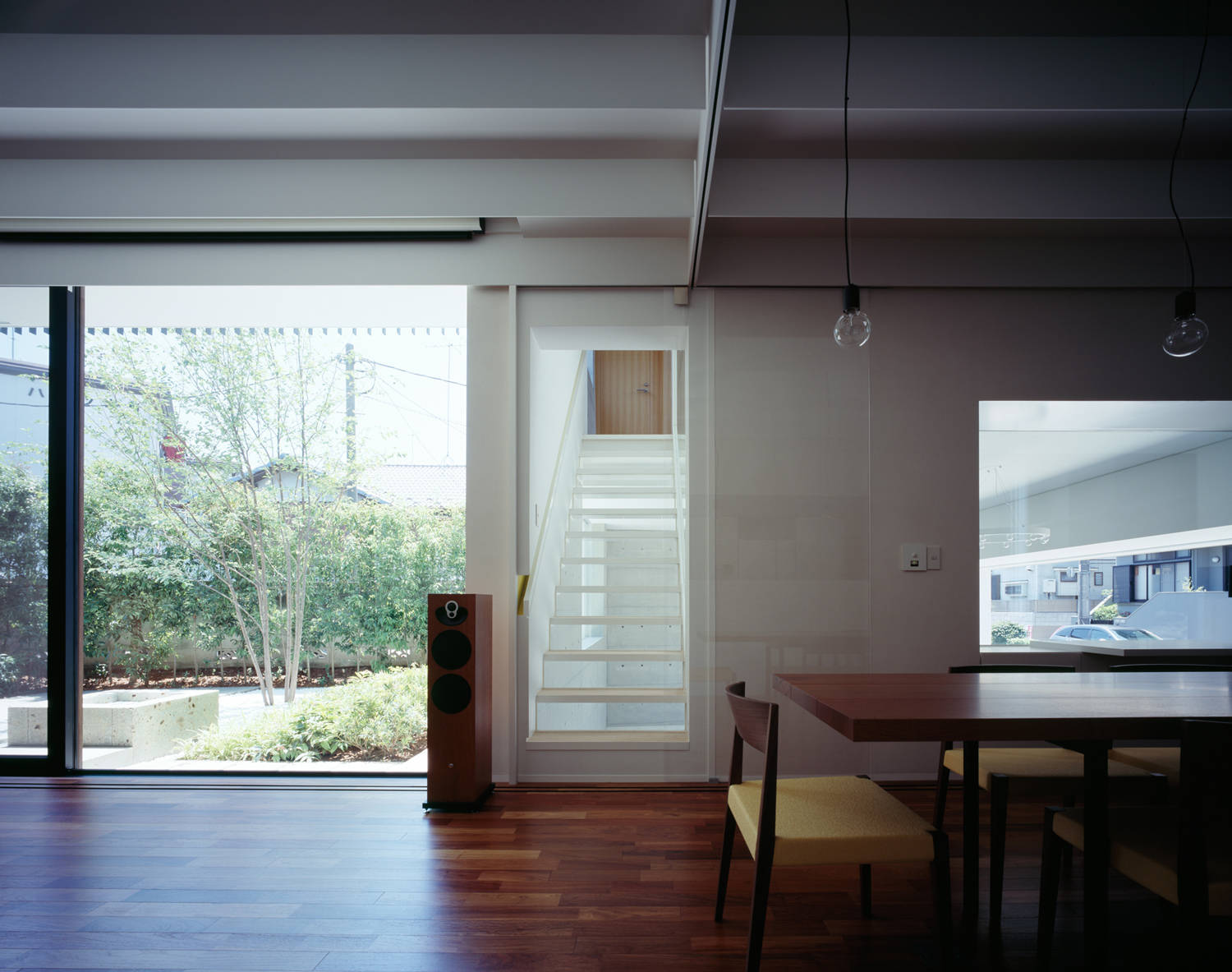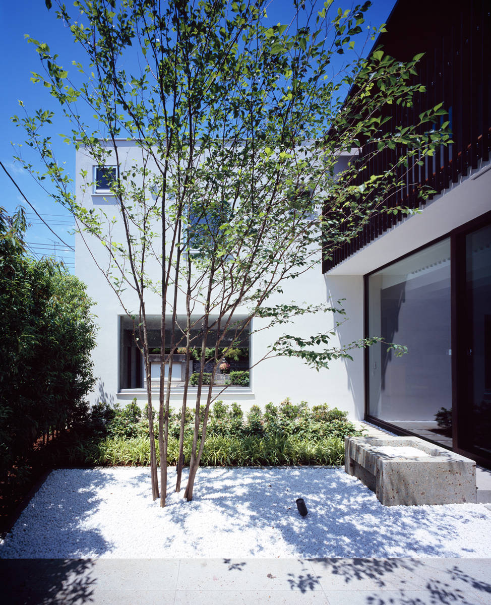 雁行、ヴォリューム間隔、吹抜け、梁間などのスキマやその周辺を、意識的にデザインすることで、同じ屋根の下で暮らす親子の距離や周辺の街との距離が、独立しながらもお互いの気配を伝えあうような心地よさを保てるよう意図しています。