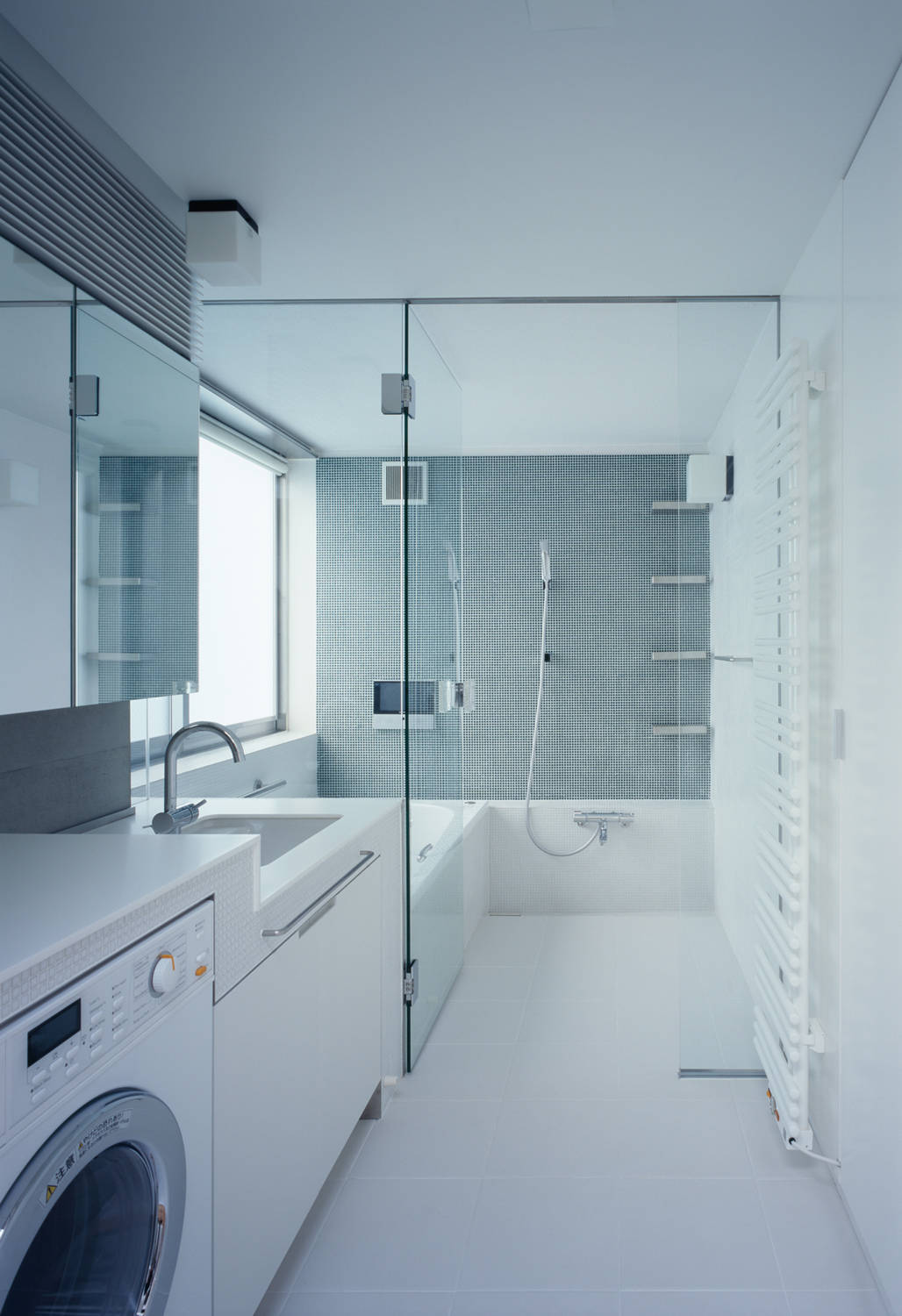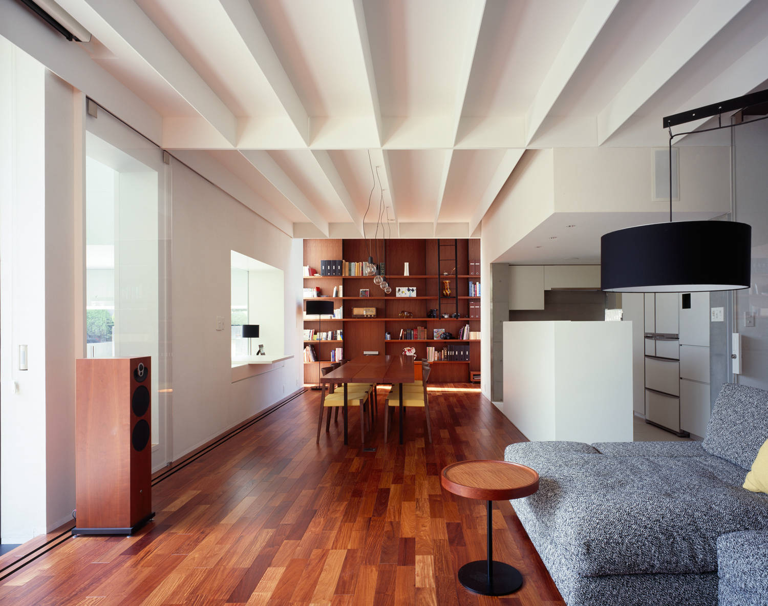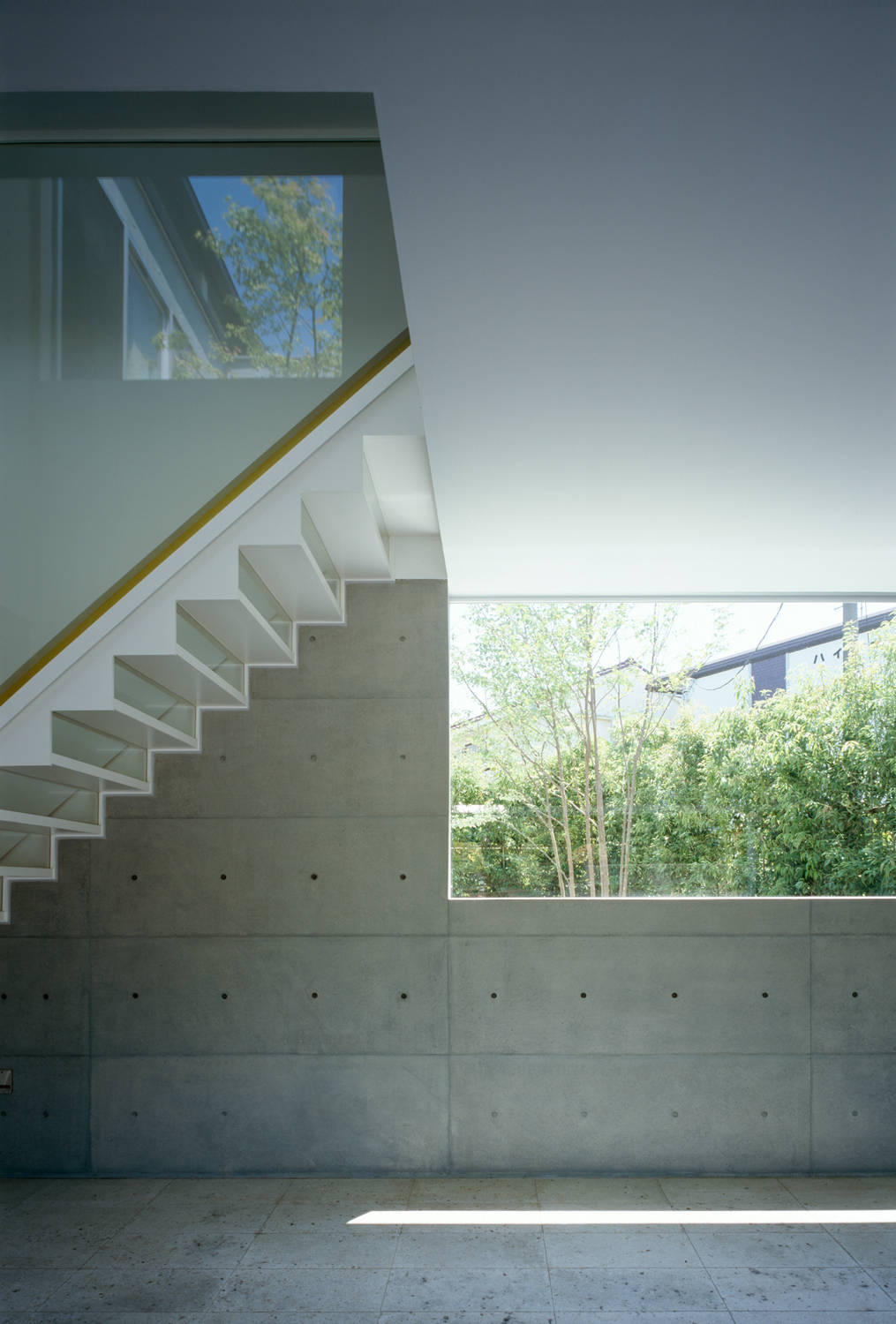 雁行、ヴォリューム間隔、吹抜け、梁間などのスキマやその周辺を、意識的にデザインすることで、同じ屋根の下で暮らす親子の距離や周辺の街との距離が、独立しながらもお互いの気配を伝えあうような心地よさを保てるよう意図しています。