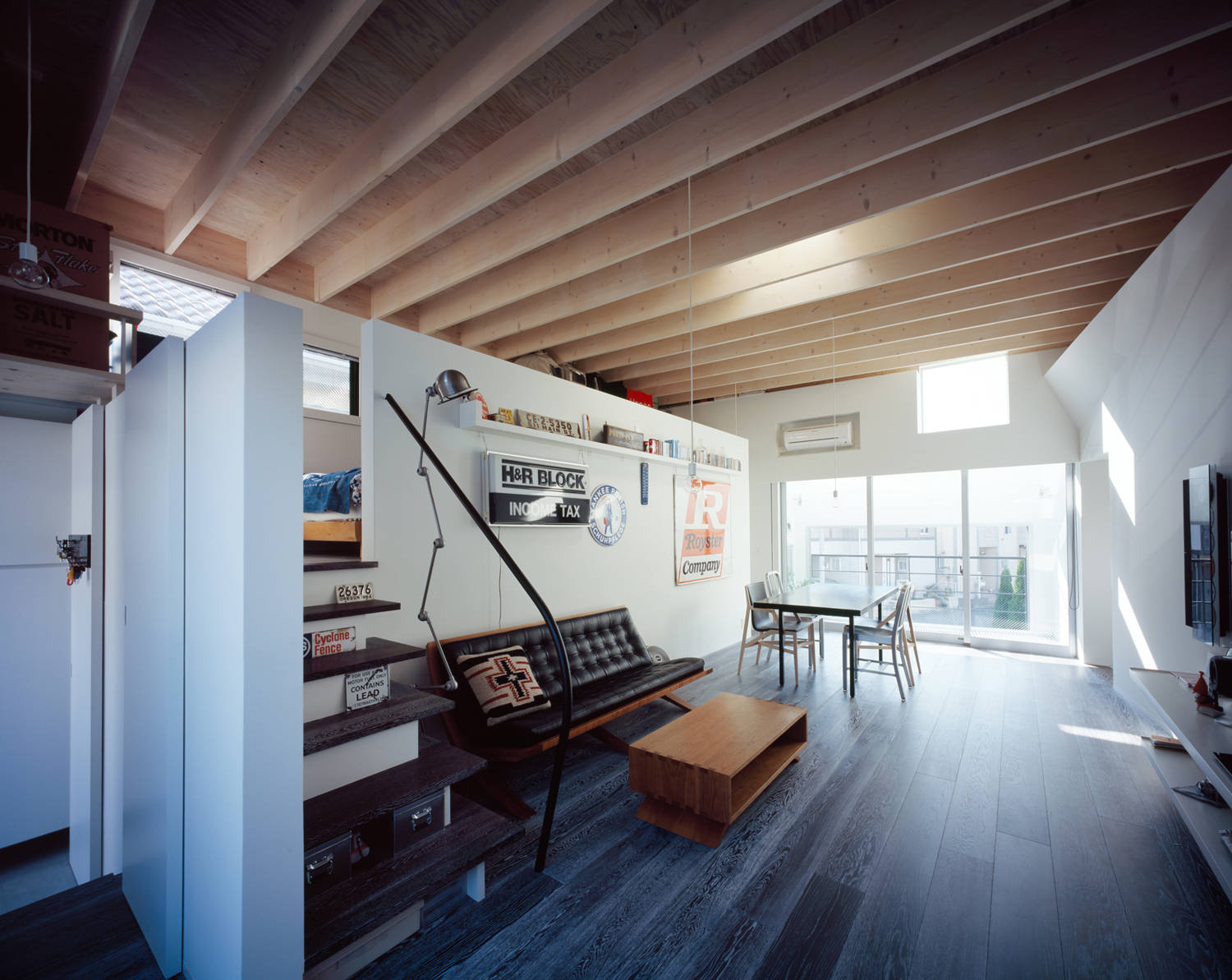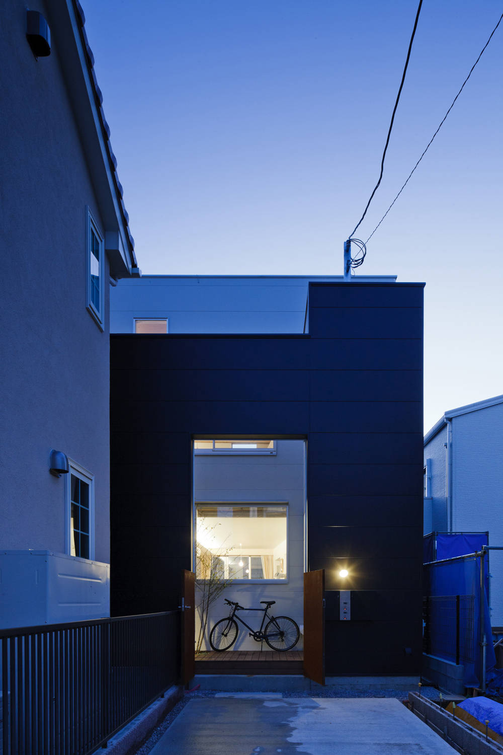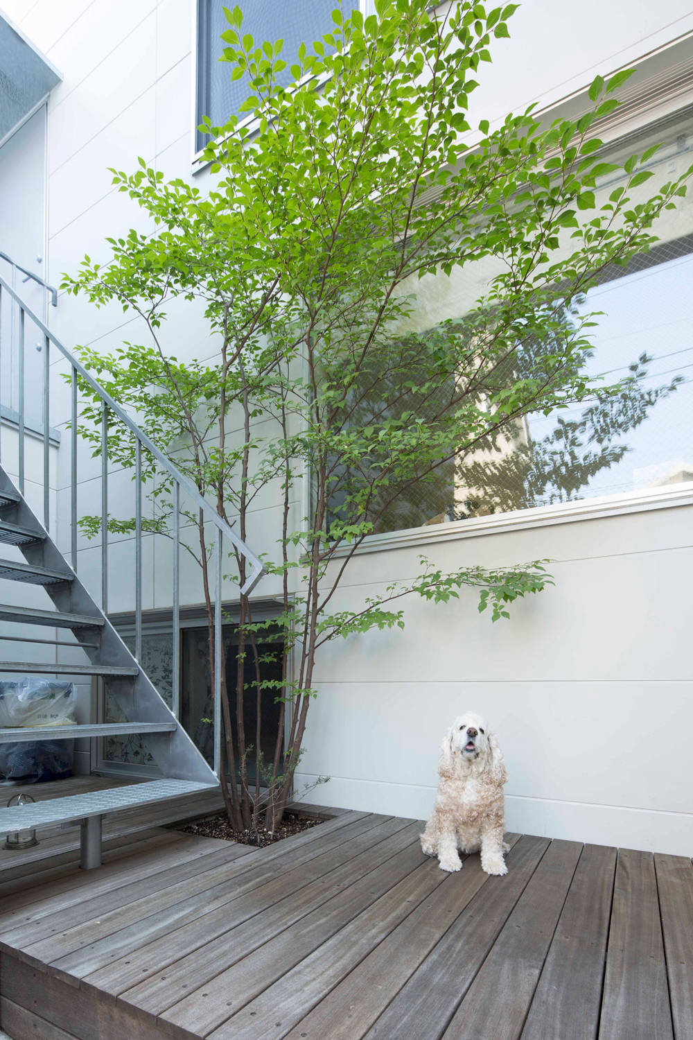 旗竿型の狭小地に建つ完全分離型の二世帯住宅、南北に設けた小さなテラスに穿たれた大きな開口は、一階と二階の中間の高さに設定され、ほどよく視線をコントロールしつつ、上下階に採光・通風を最大限供給しています。