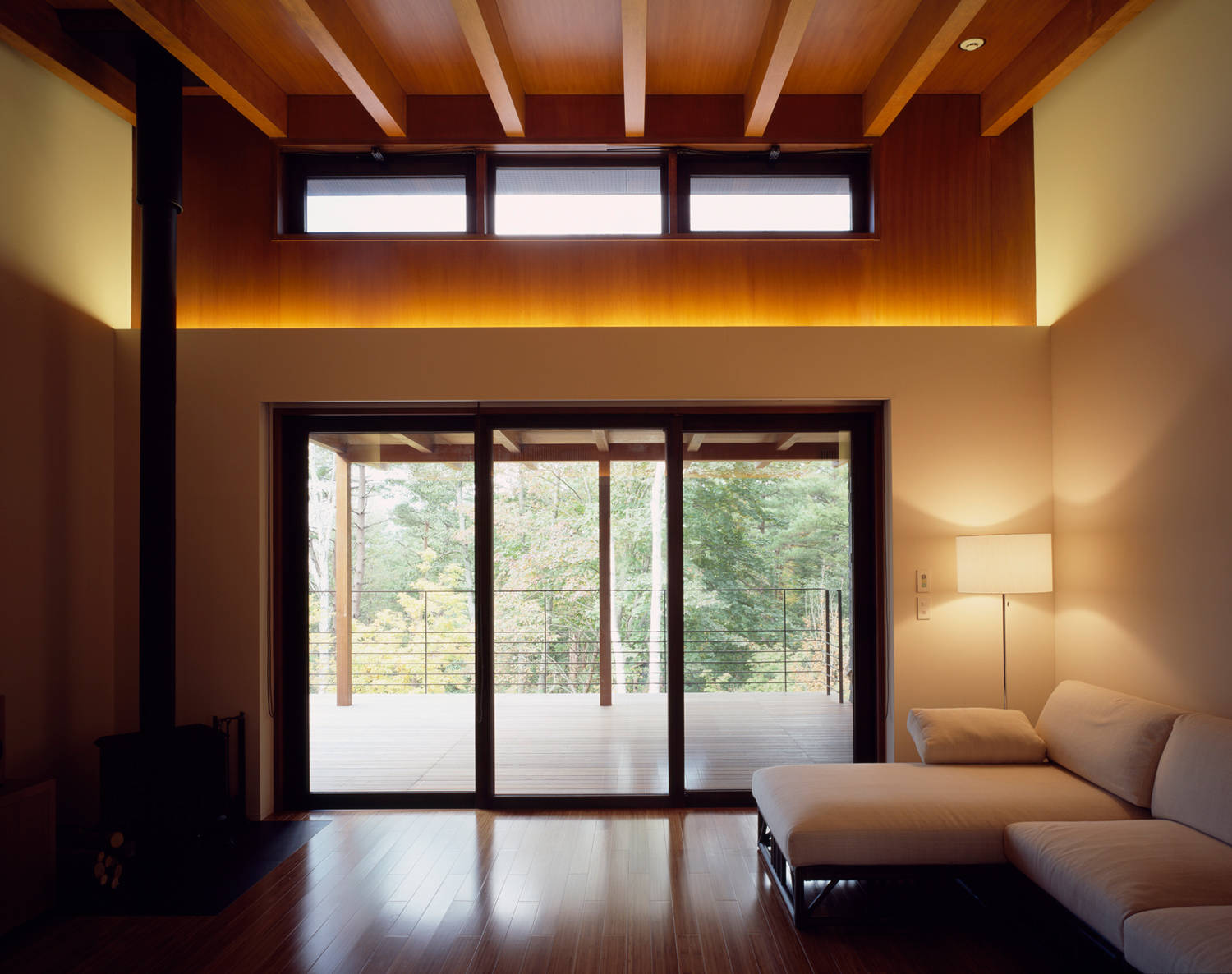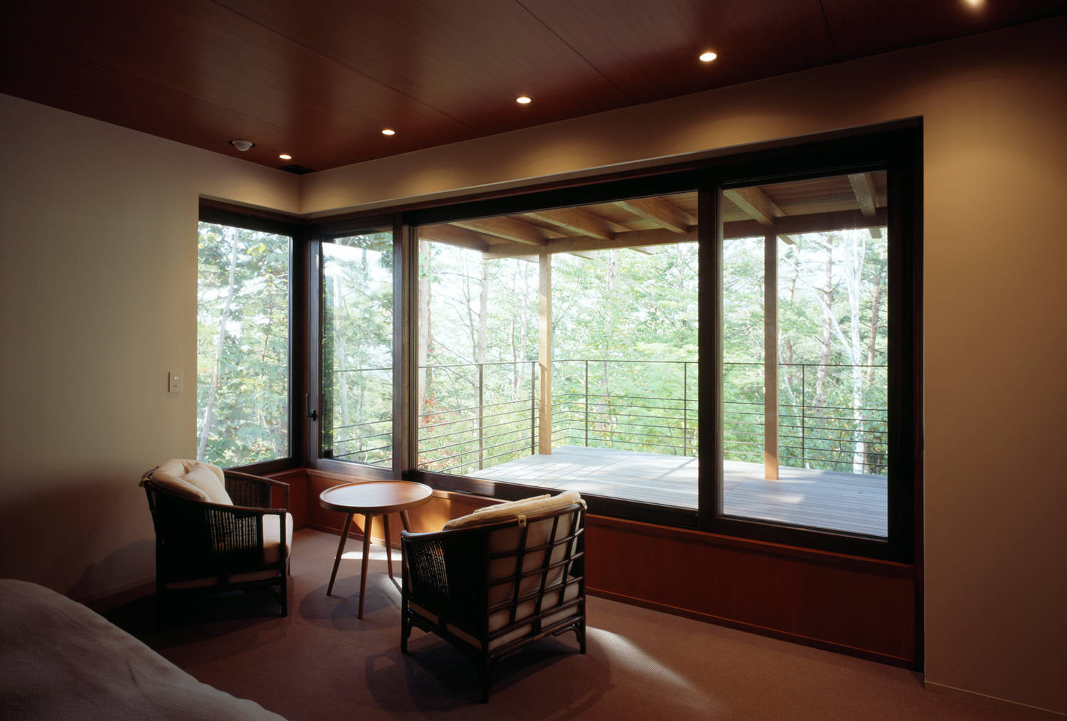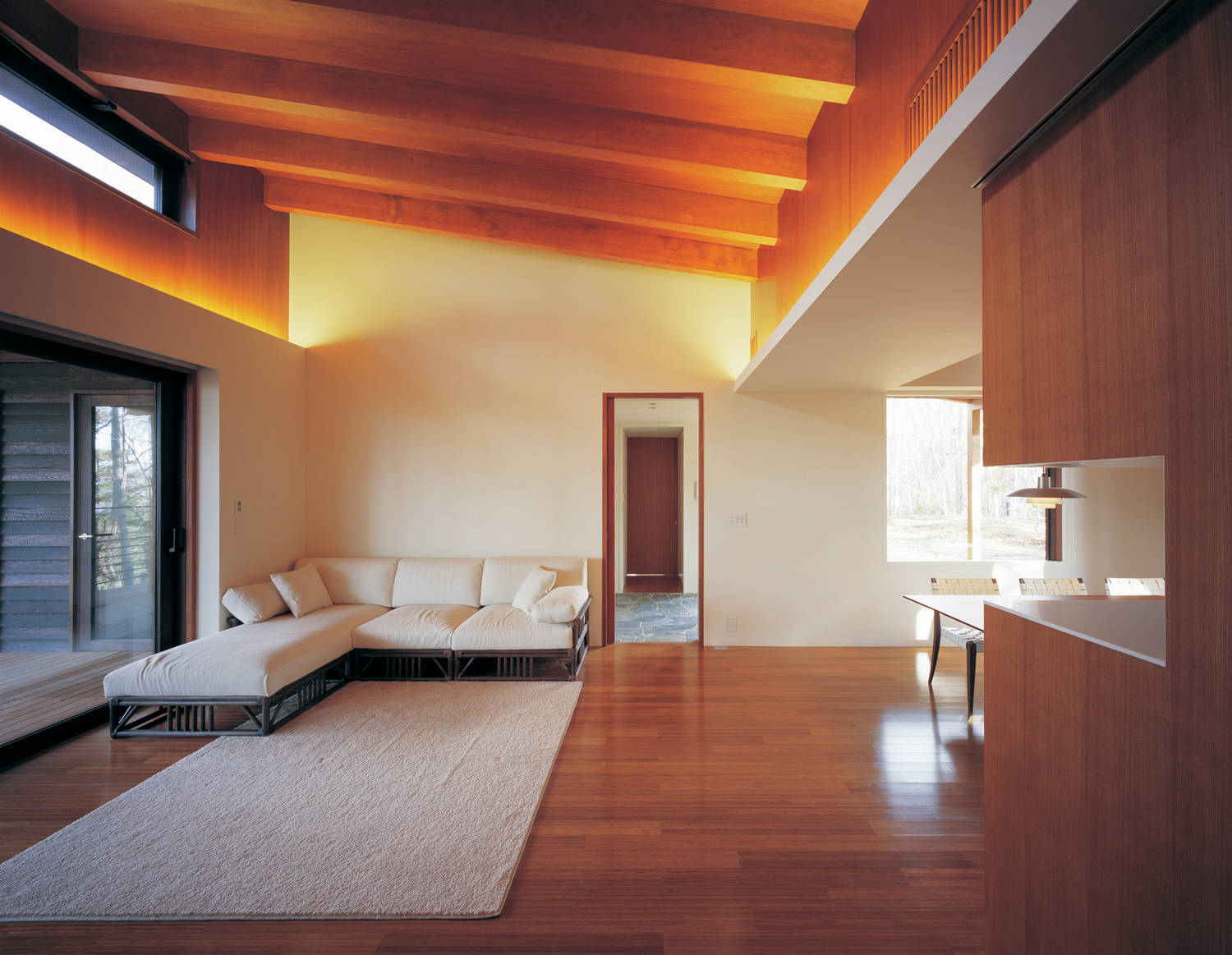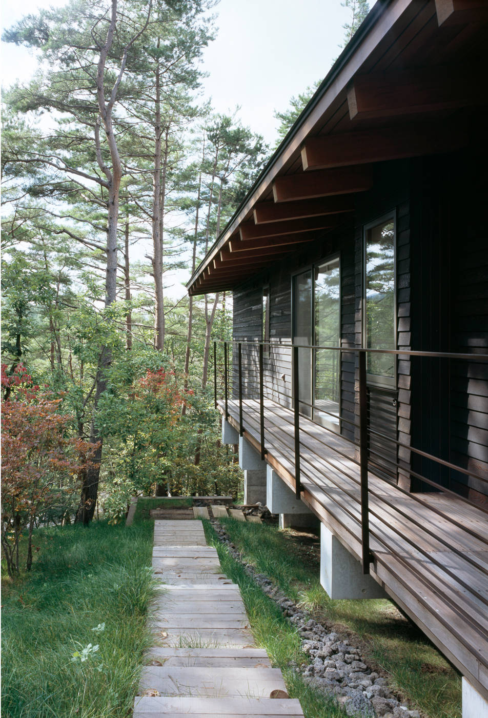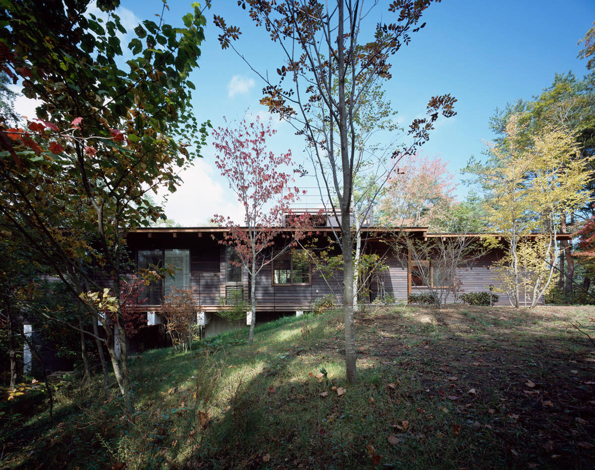 別荘地の豊かな自然の中、既存の傾斜面の肩に二つの箱をずらして置いて、大屋根を掛けた単純な構成です。