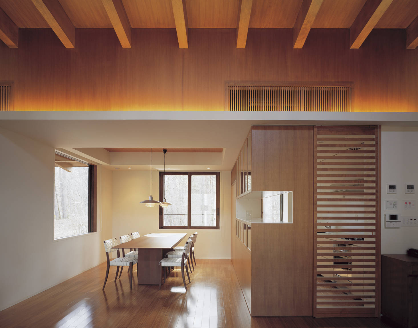 しかし敷地の高低差を利用することで、北 側に鳥の目線で眺望を楽しむ、屋根付きテラスと高天井の落ち着いた空間を、南側に散策の庭につながる、明るく水平性を強調した親密な空間を計画し、都会で 暮らす建て主が、自然の高で親しい人々と楽しむための多様なシーンを提供することができました。
