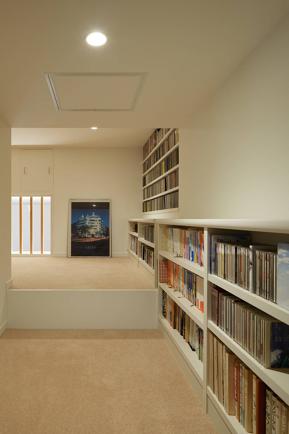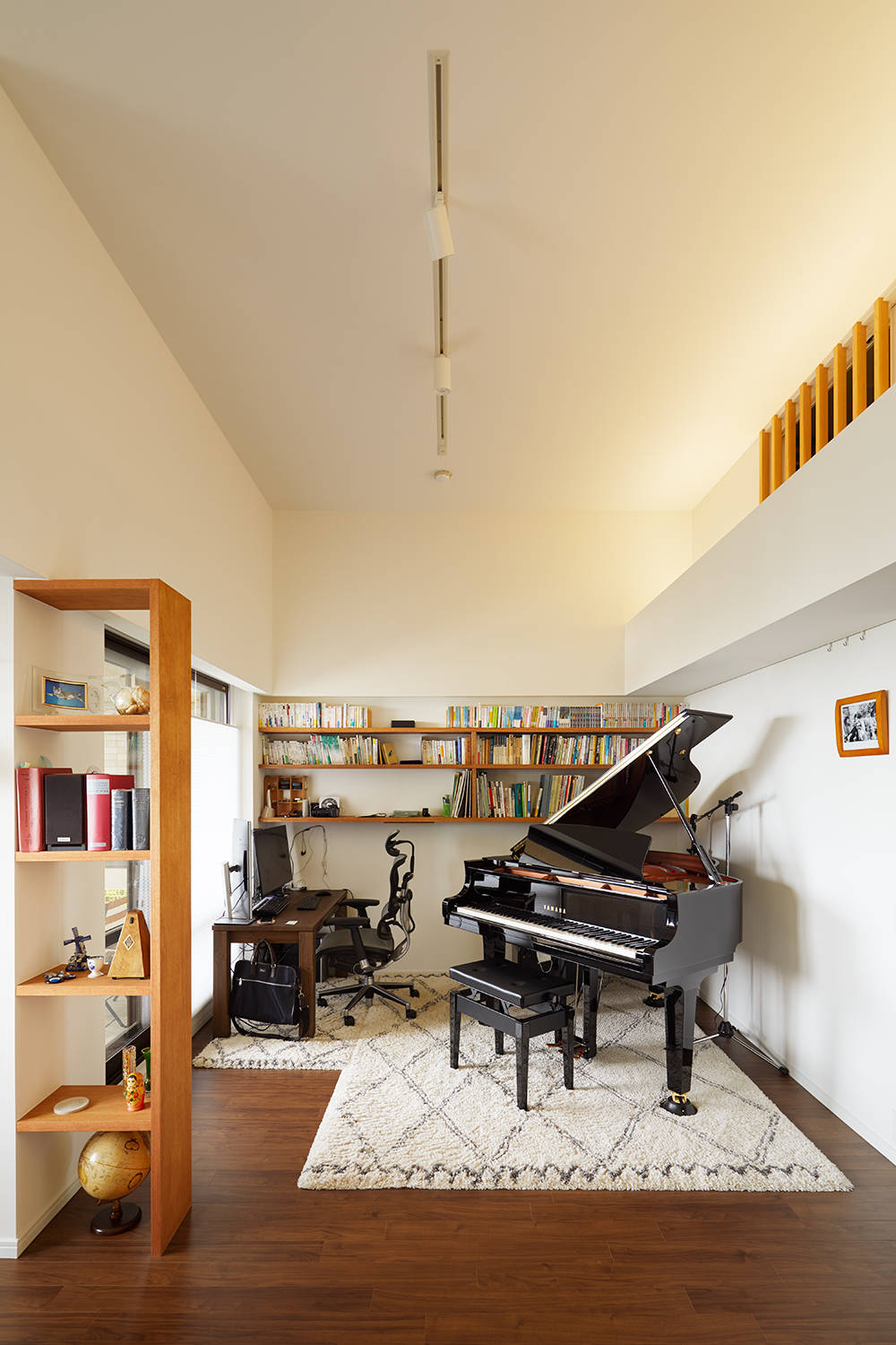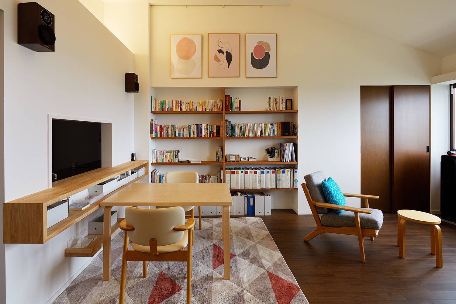 白と落ち着いた濃色の木を基調に、多彩な趣味をお持ちの自立したお二人の生活を、緩やかに分節しつつつなげるプランです。