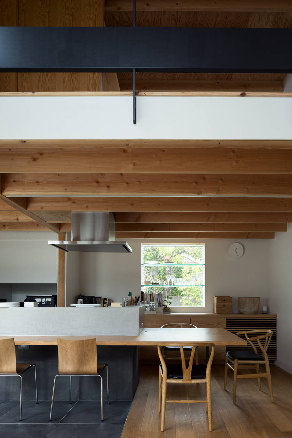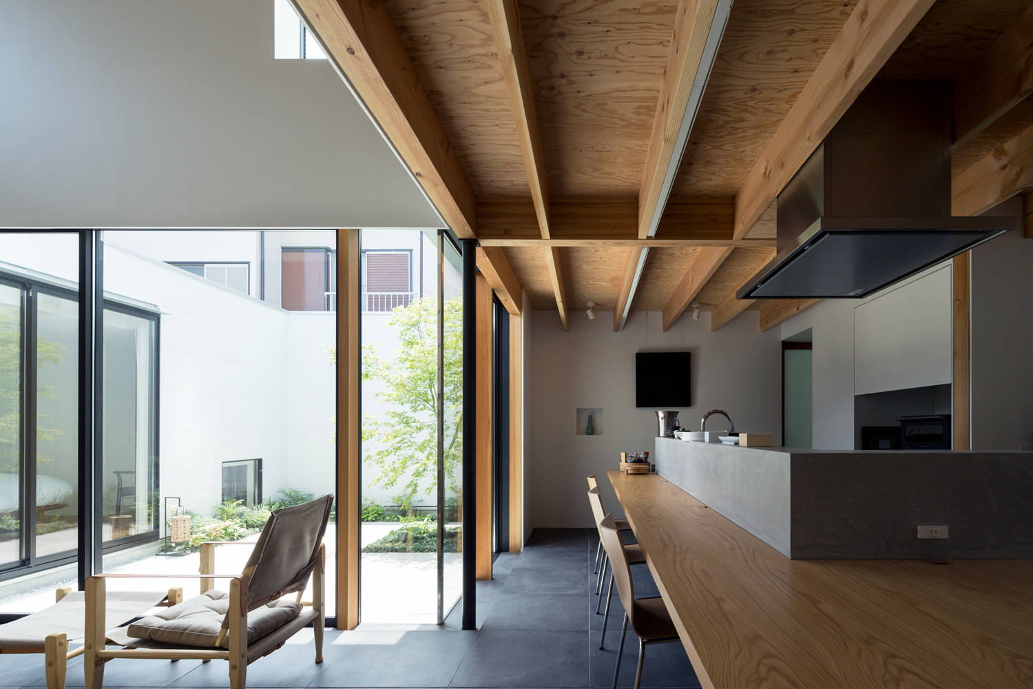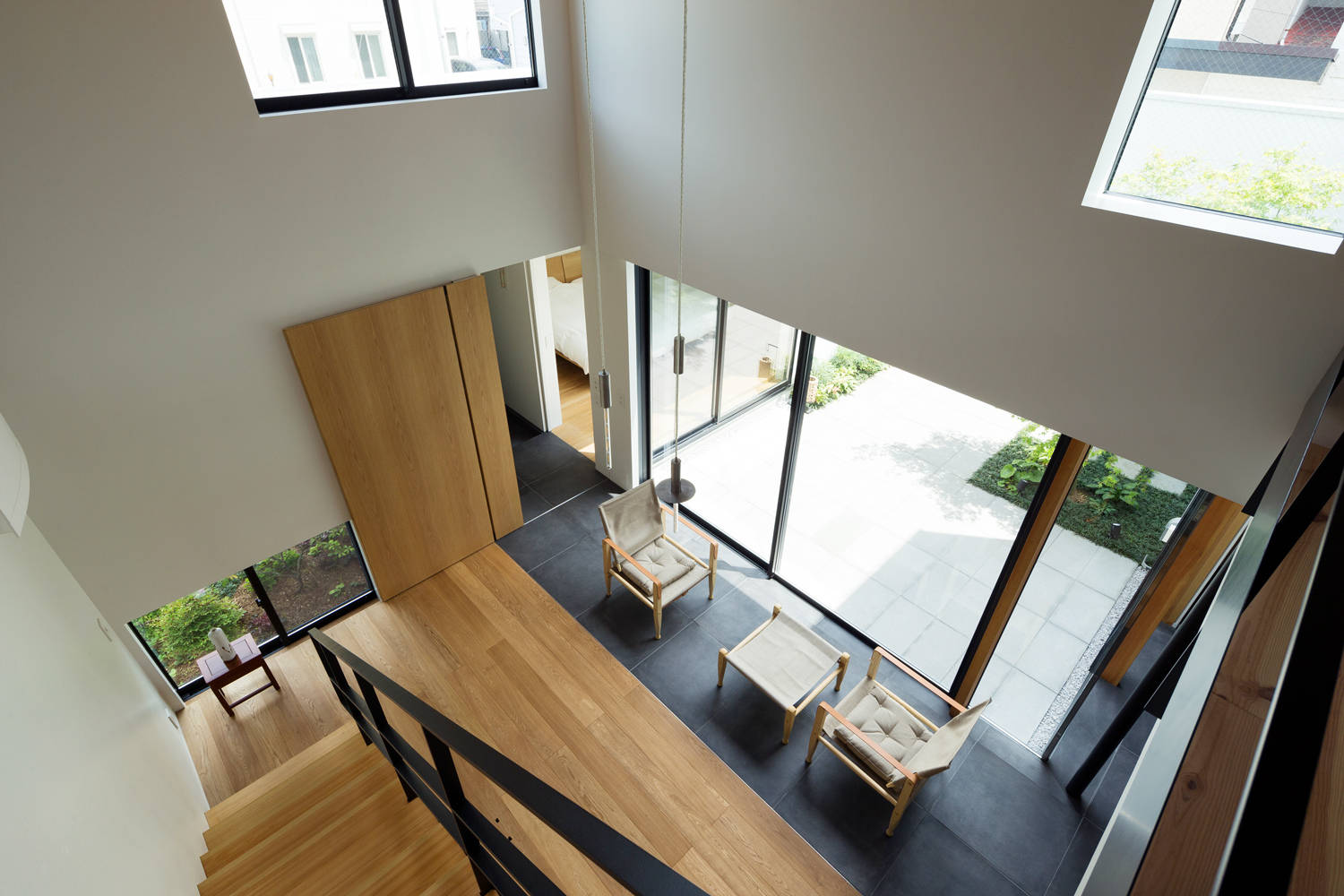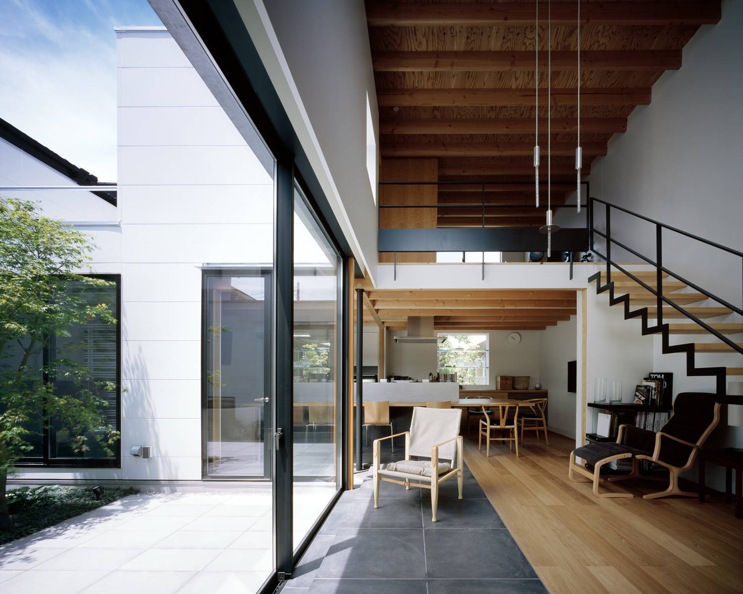 吹抜のリビングと中庭を取り囲むように配置された三つの個室は、家族やまちに対してそれぞれの距離を持っており、将来の家族の変遷にも耐えうるフレキシビリティを備えています。
