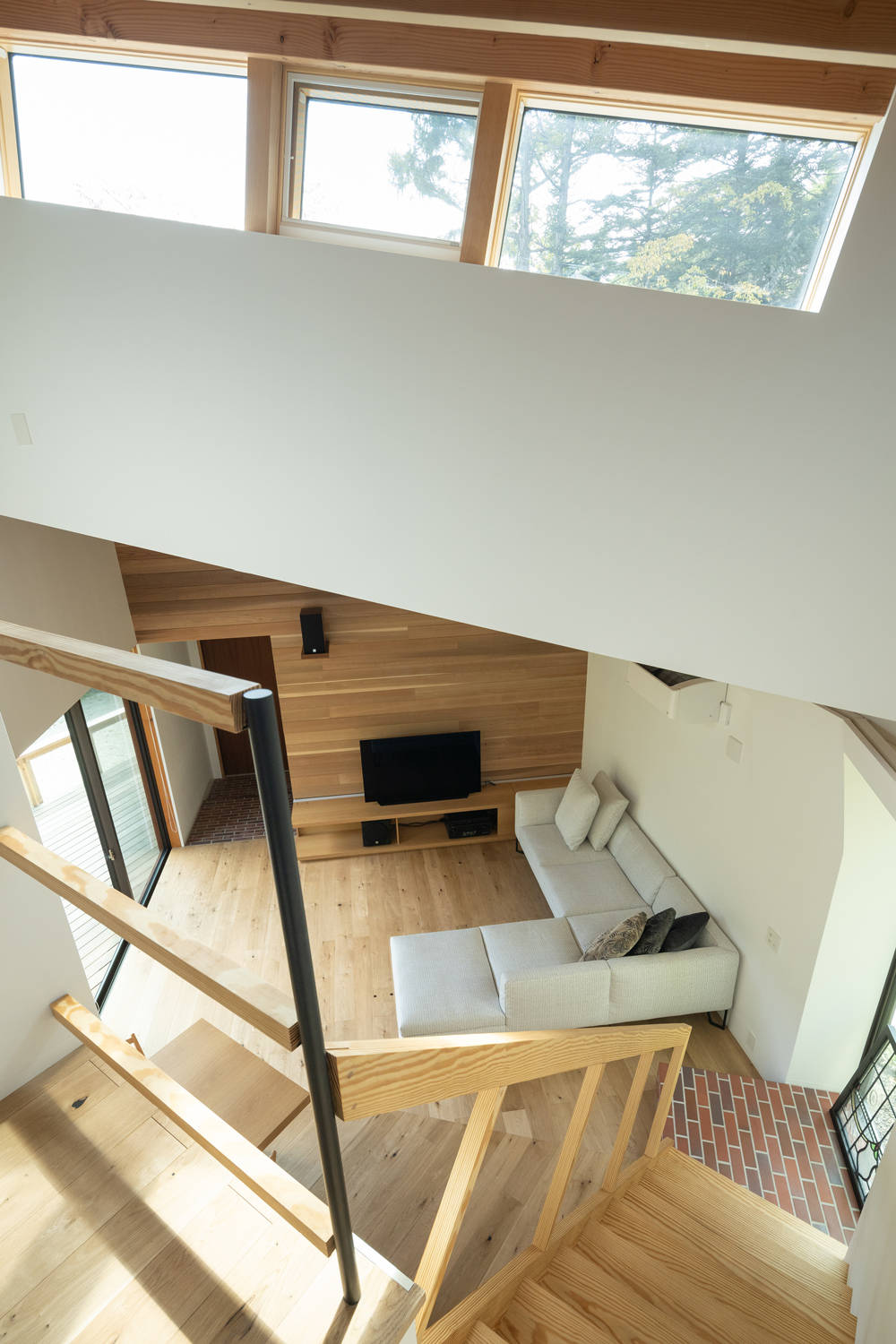 道路から3m程度アプローチ坂を上ってアクセスするように造成された敷地で,南東方向への眺望はよいものの,北西隣地には接近して隣家が建っており,くつろぎの時間の中隣家への視線を切りつつ奥行を感じられる配置を模索しました.
