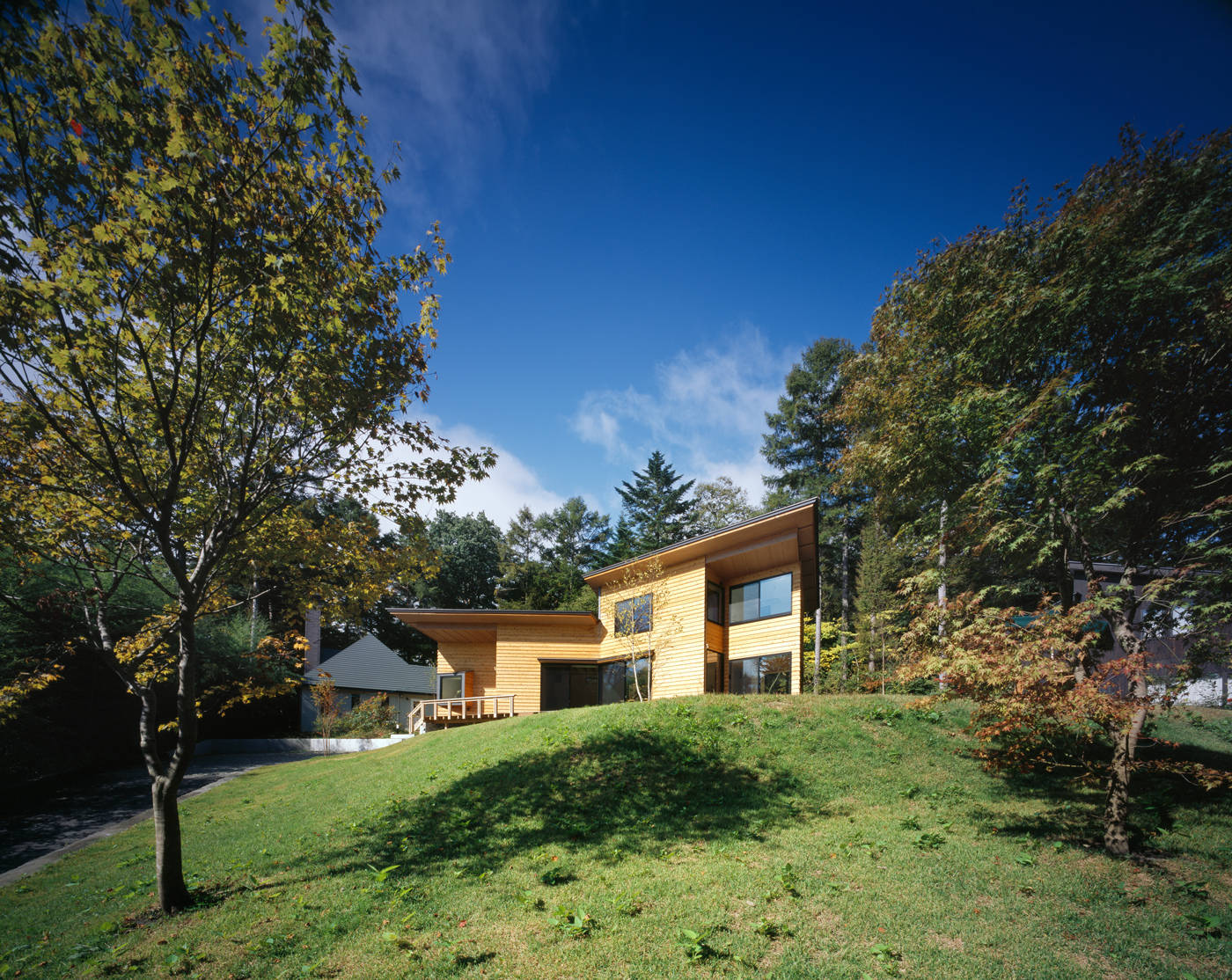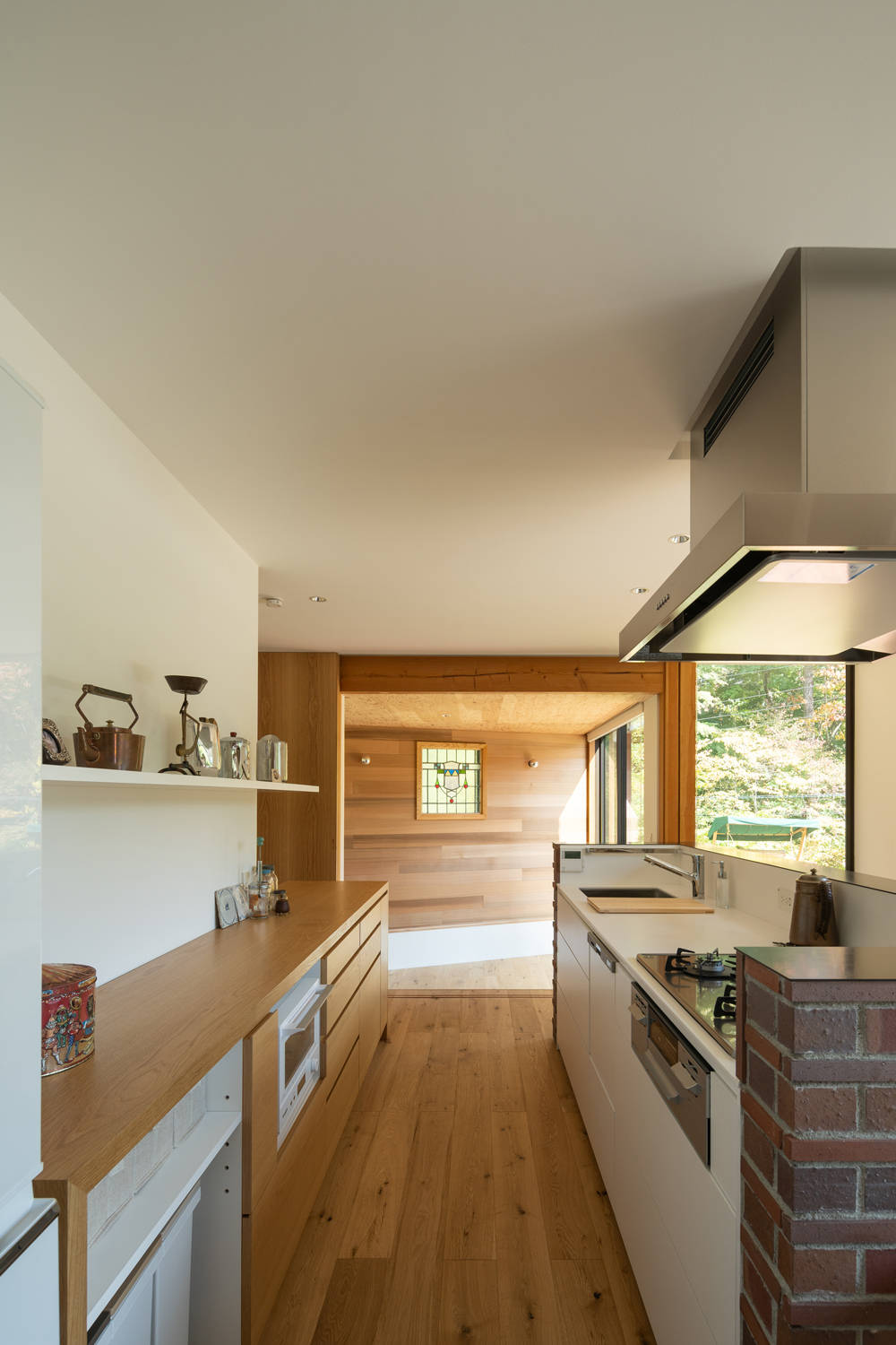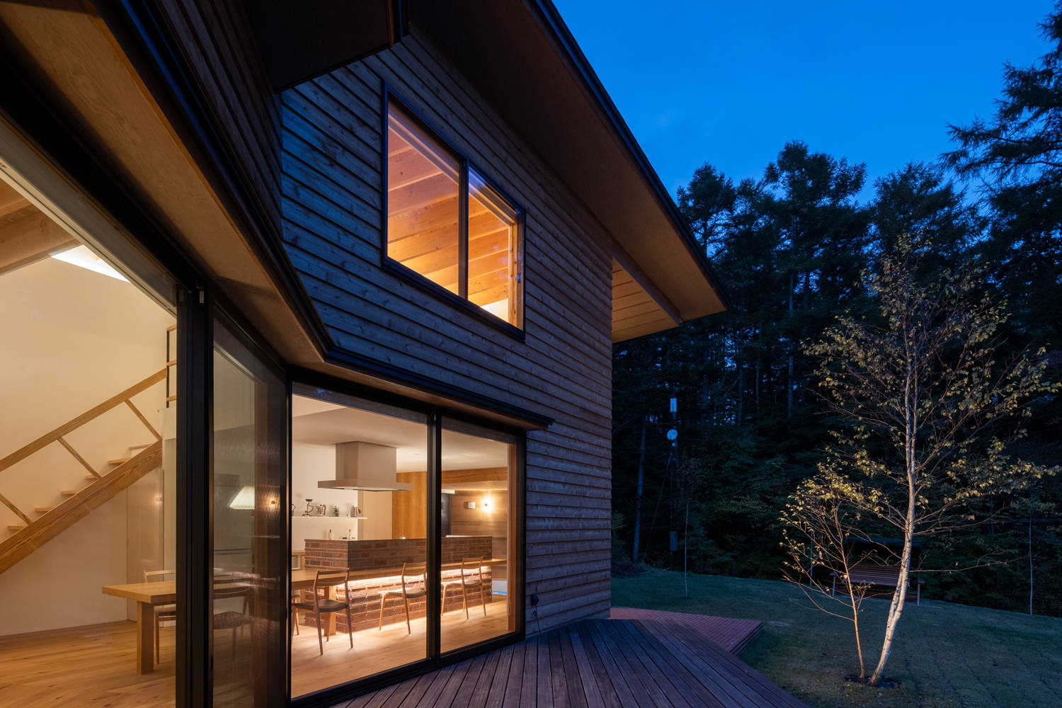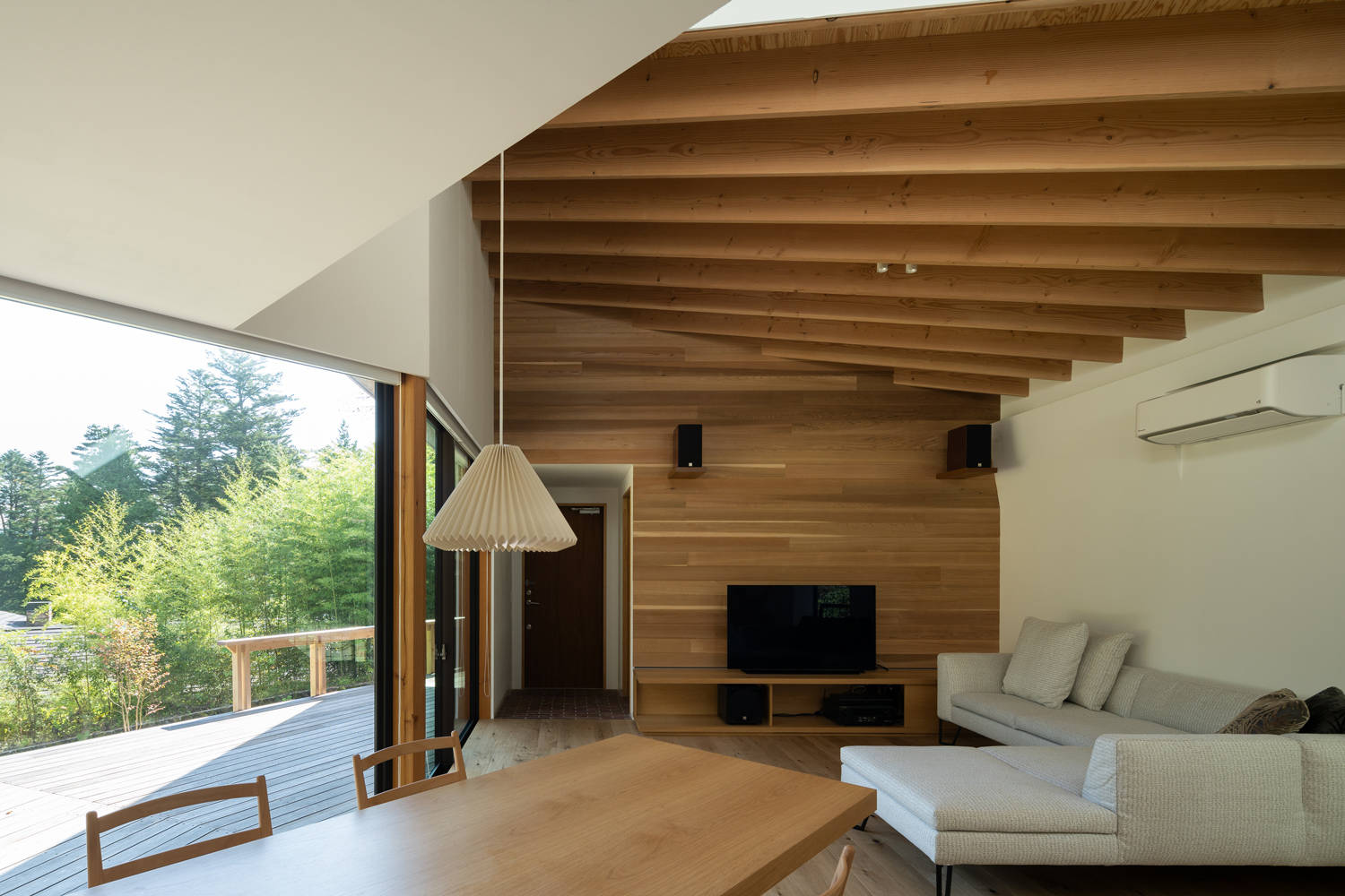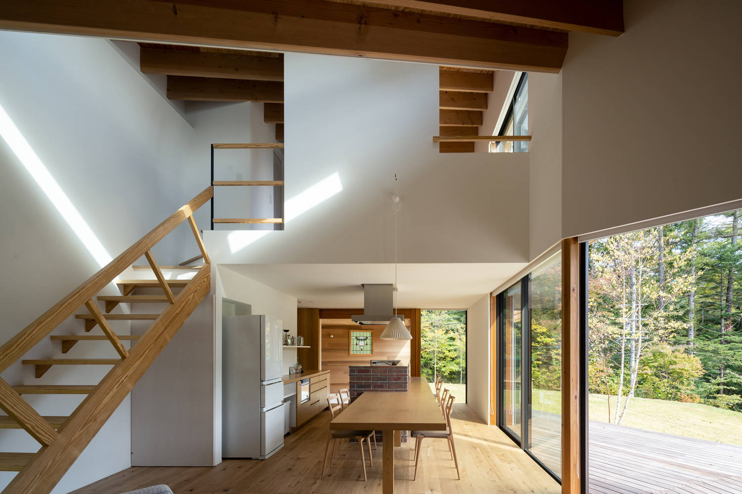 北西側のくの字型の壁で隣家への視線を遮りつつ,注意深く四方に開けた開口からは様々な方向に広がる森を体験できます.またくの字型のプランは緩やかな連続感と個別の領域感の両方を感じることができます.