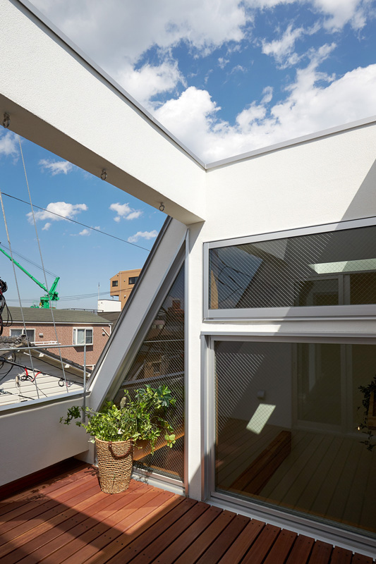 住宅密集地であることから 大きく開いた開口部の外側にはスチールメッシュの皮膜を設け、外部から直接的視線を遮るよう配慮しています。 限られた敷地において 明るくのびやかな空間が感じられる住宅となっています。