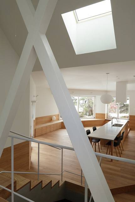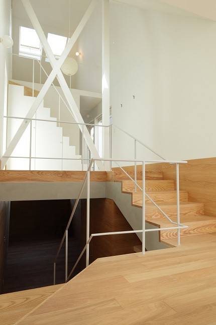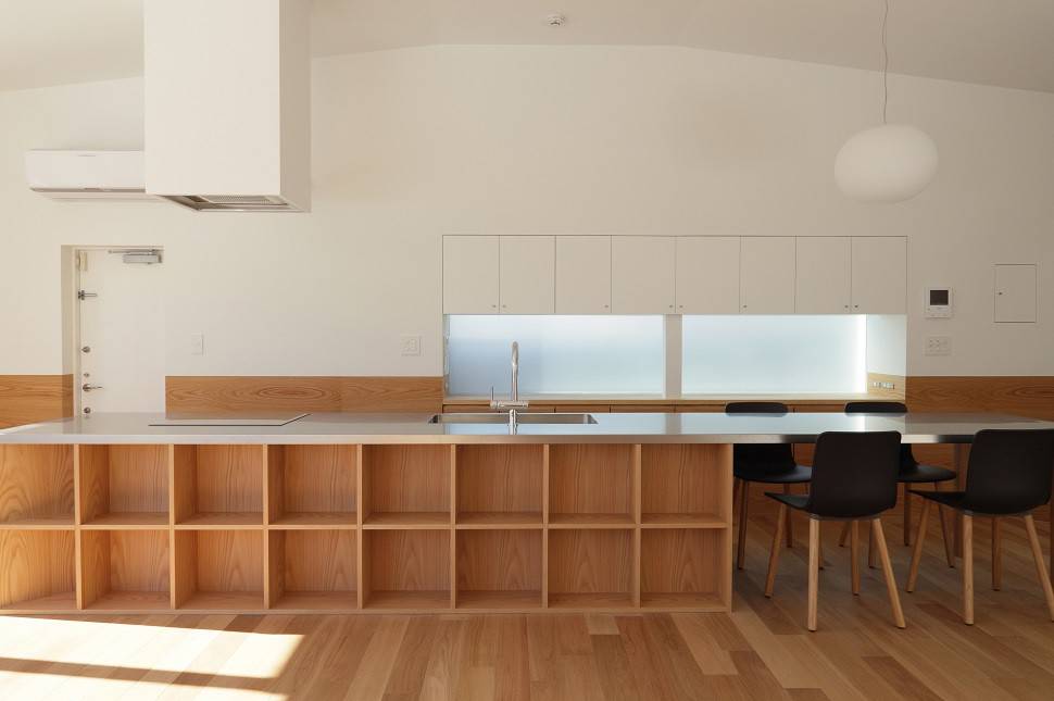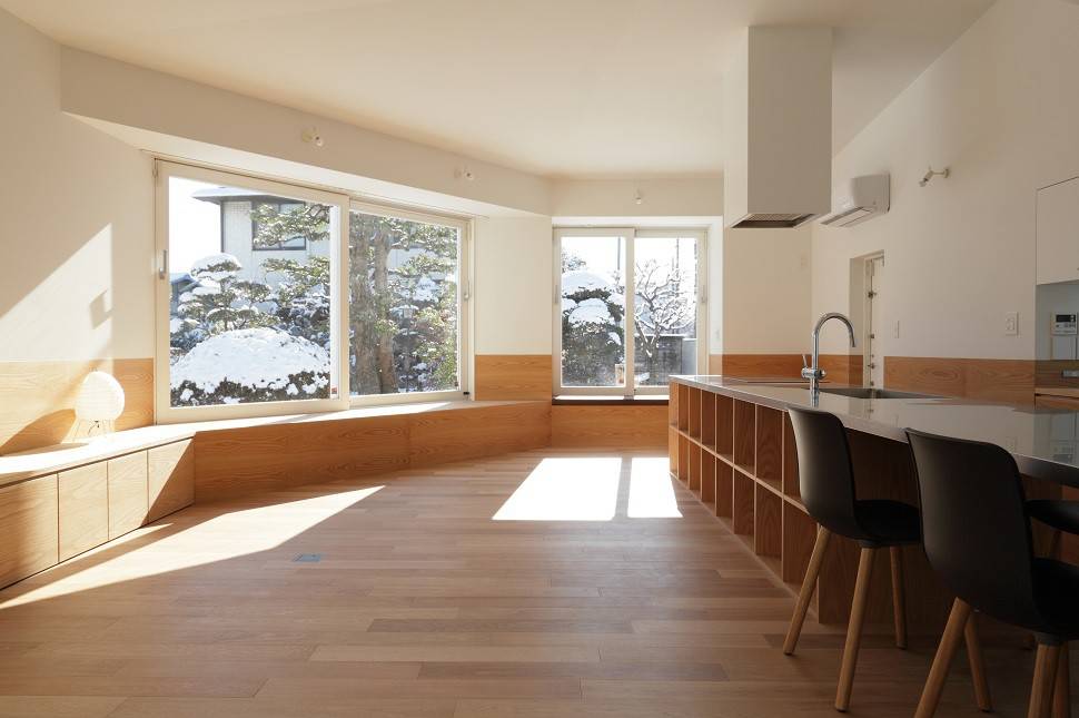 内部は地下から2階までがひとつながりの空間になっており、中央に置いたキッチンからは地下の子供室や2階の書斎まで見渡せます。建築面積に入らない出窓をベンチやカウンターとして用いたことや、地上と地下を木の壁で緩やかにつなぐなど、ひとつながりの空間に連続性と拡がりを与える工夫を施しました。