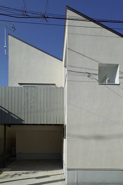 この住宅も屋根形状は踏襲しつつも、小さい部屋を飛び出させて家の形を小さくした塔のような2階建てを道路側に設けることで、周囲の住宅とは異なる表情をつくりだしています。