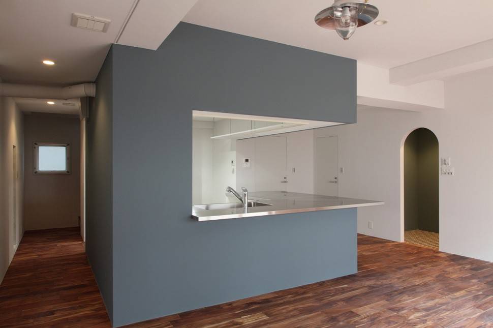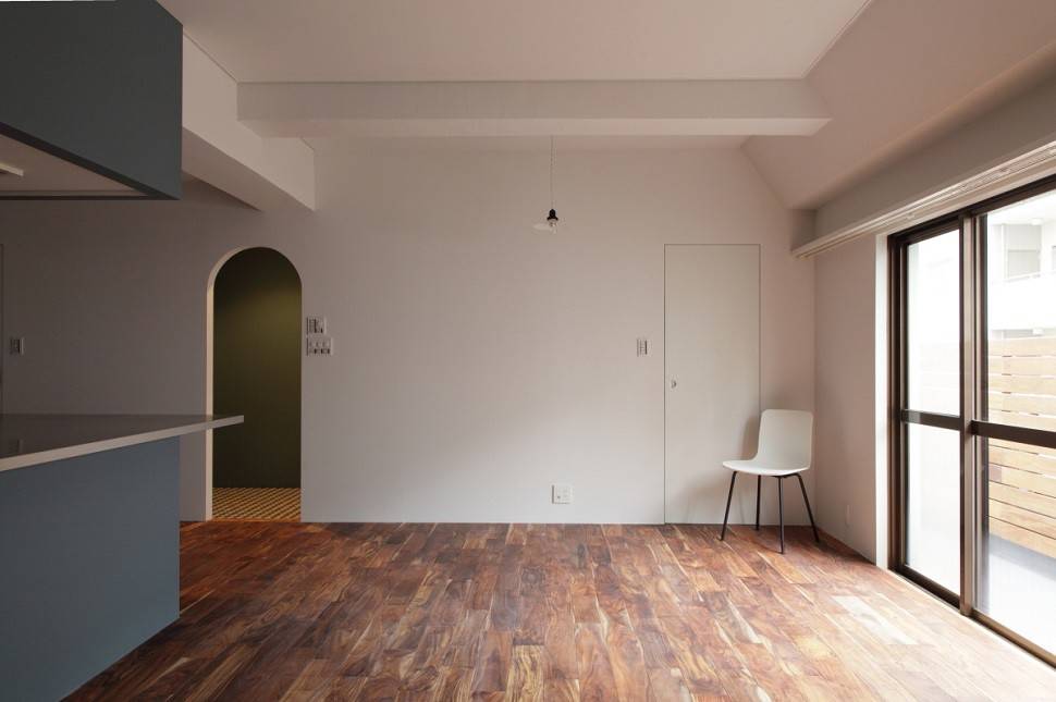 随所に残る塗装を施しただけの既存の梁や建具、窓枠などがかつての時間を感じさせ、夫婦で選んだ色で着色した壁のアクセントとともに、キッチン中心の新しい生活に安らぎと彩りをもたらします。