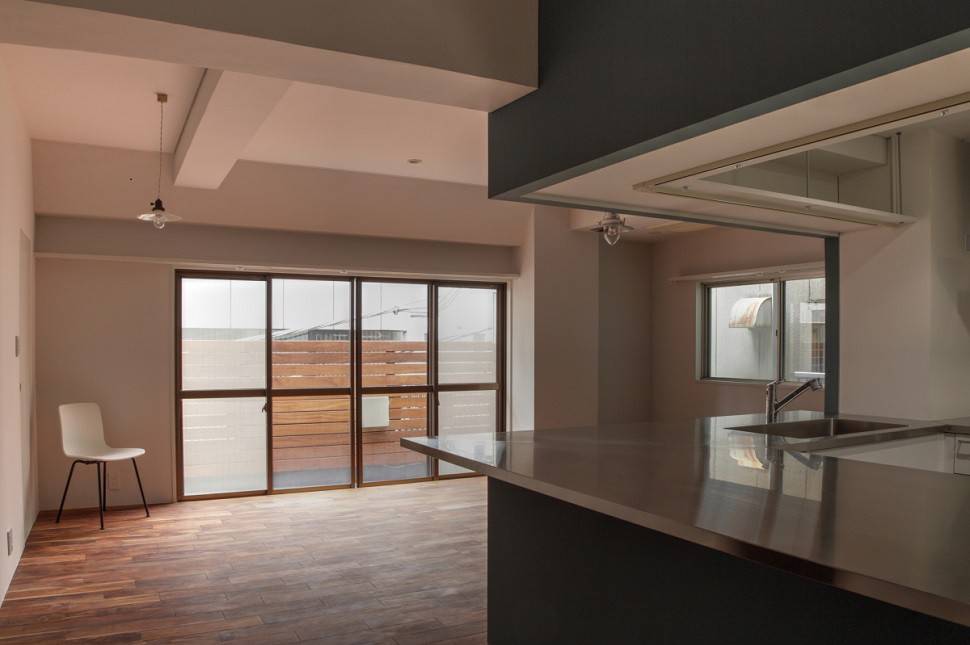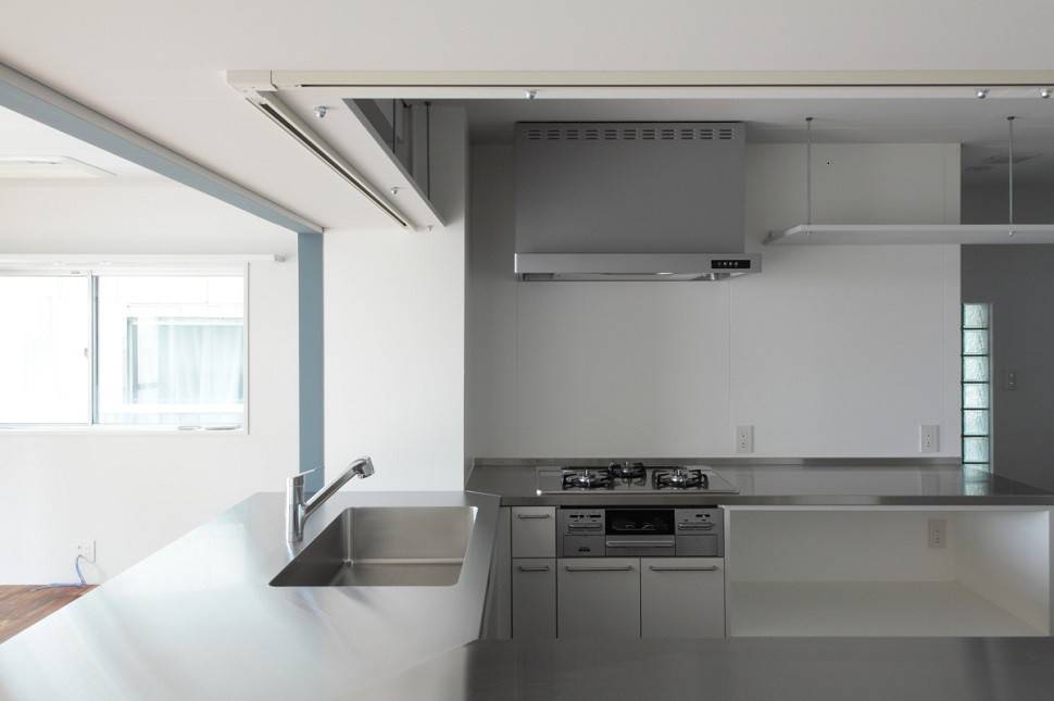 玄関を開けると、ステンレスヘアラインのカウンターを延ばしたキッチンが迎えてくれます。