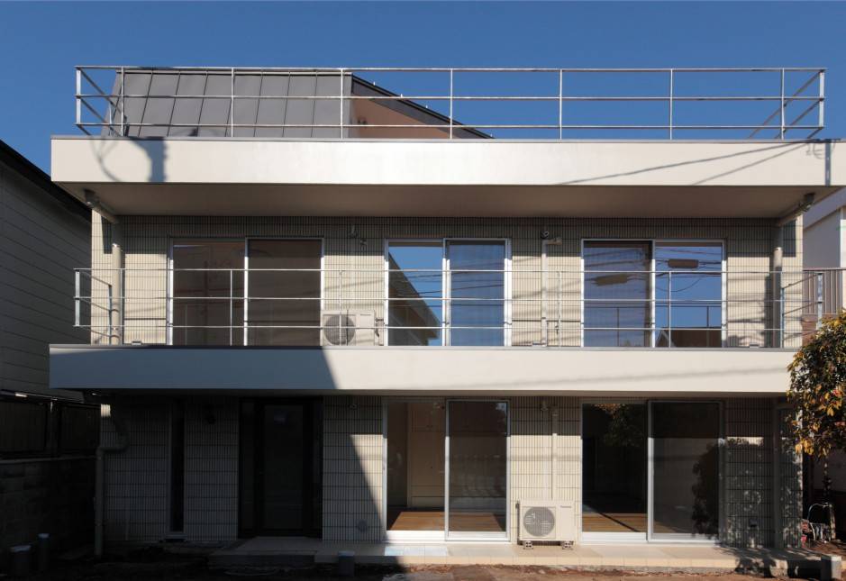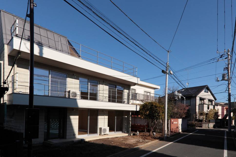 フラットなバルコニーと屋根がこれまでと同じように並び、既存の印象を踏襲しながら圧迫感を抑え、街並みを維持するように建ち替わる家を考えました。