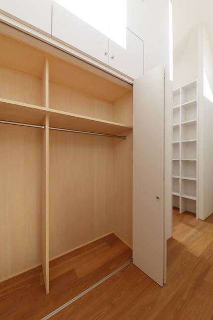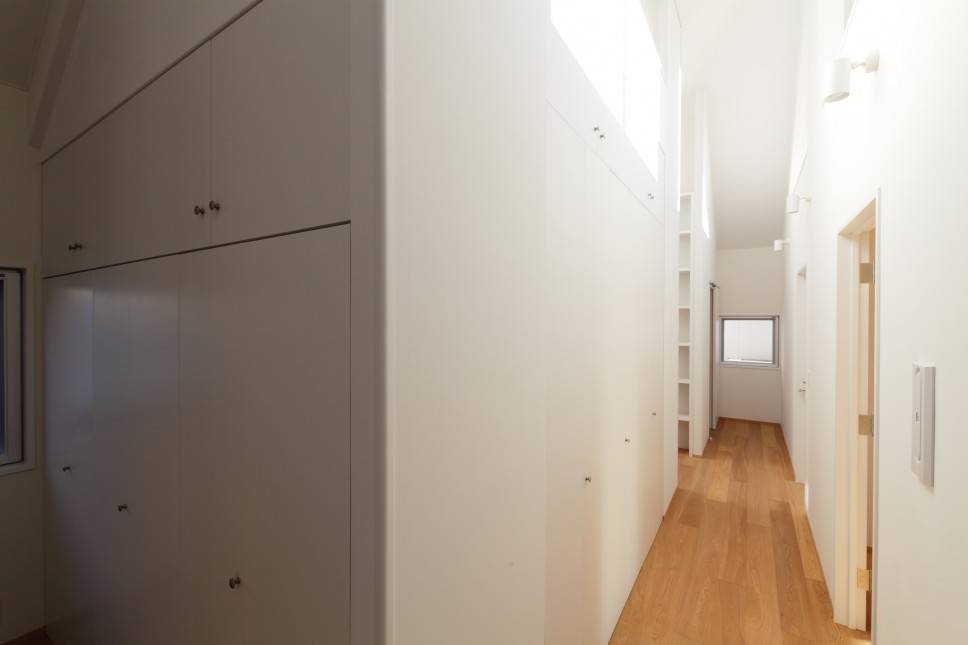 テラスの窓からは2階に光を取り入れており、できるだけ収納が欲しいという要望とともに天井が高くなった廊下は、光に満ち溢れた場所になりました。
