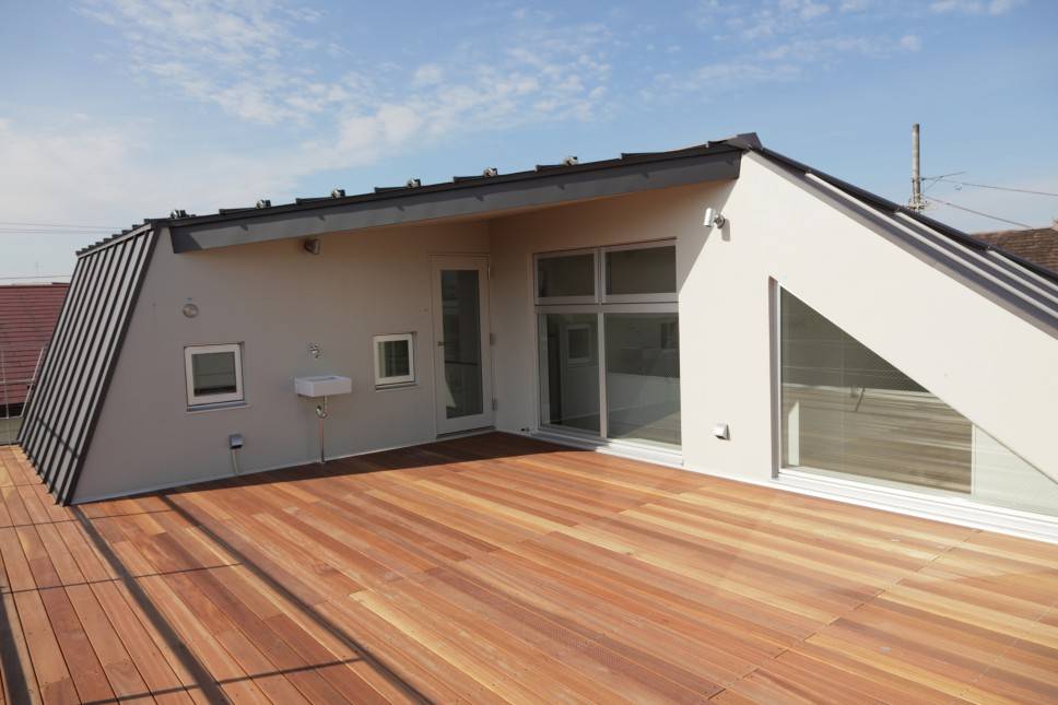 同じように見える屋根の上は広いテラスとなり、周囲の家々を超える視界が眼前に拡がる、とても開放的で気持ち良い場所となりました。