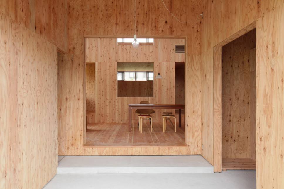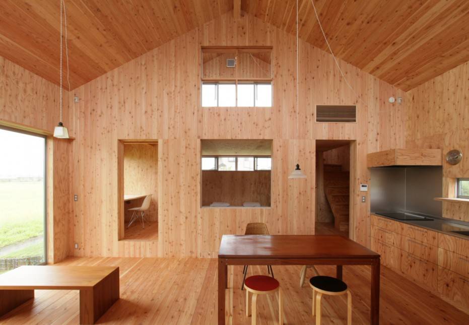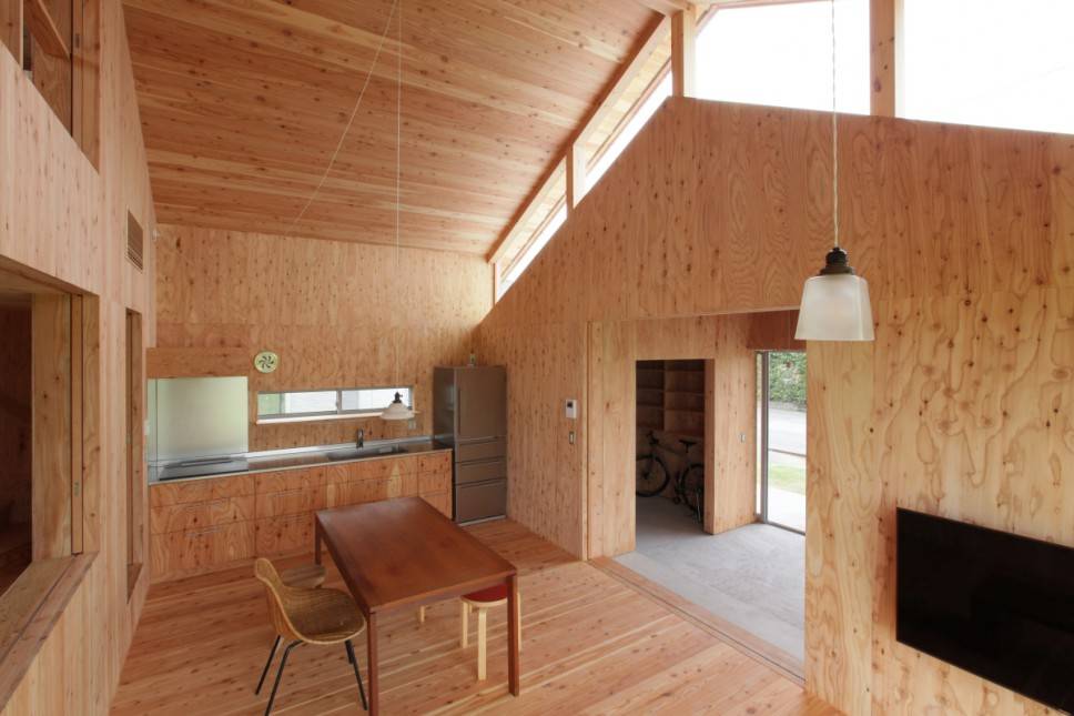 内部の土間や居間の壁にも引込戸を設けて風の通り道を確保し、床と屋根に段差を設けて南から北に向かって空間を高くする(勾配をもたせる)ことにより、立体的な熱換気を促す。