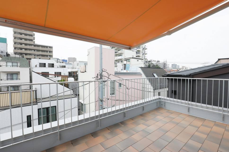隣家のコンクリート壁や万年塀に向けてあけた窓、屋上テラスから望む近隣建物の屋上と空。