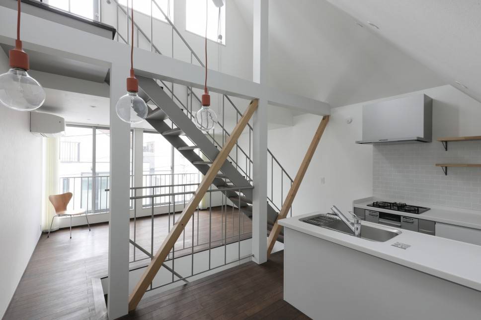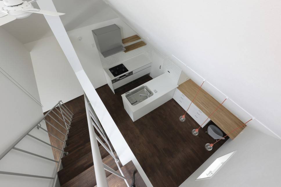 北側斜線によって大きく規制される3階は、ダイニングキッチンの床付近から壁が傾斜し始め、その壁がそのまま天井になり、屋上テラスへと続くダイナミックな吹抜け空間になっています。