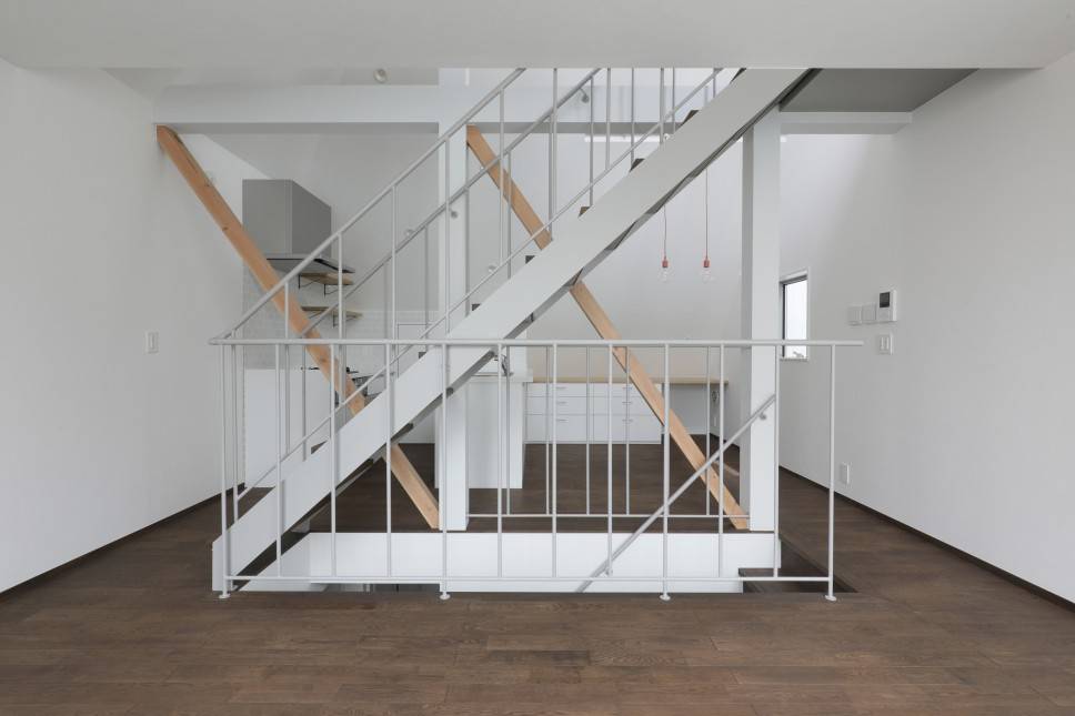 一方で、屋上に上がる鉄骨階段と構造材(柱・梁・筋交い)によって、ダイニングキッチンと緩やかに区切られたリビングは、天井高が抑えられ、性格の異なる落ち着いた居場所になっています。