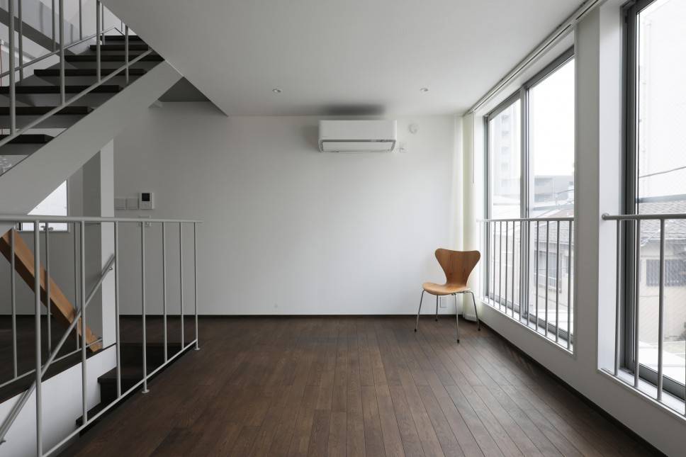 敷地は、3面が建物に囲まれており、下層階での日当たりがあまり望めないため、1階に水廻り、2階に寝室、3階にはLDKを配置しました。各階では、中央の階段によって各室が区切られています。